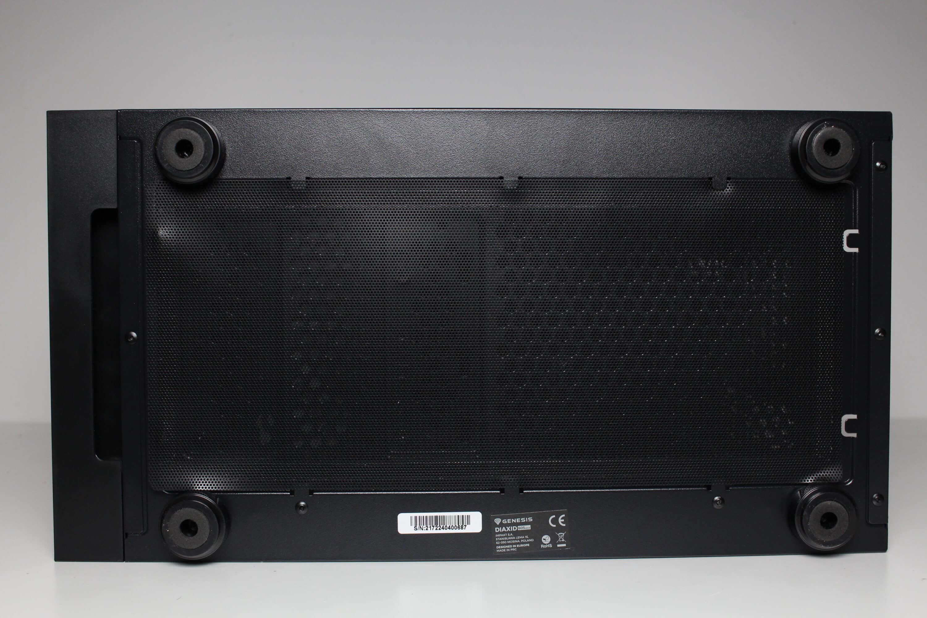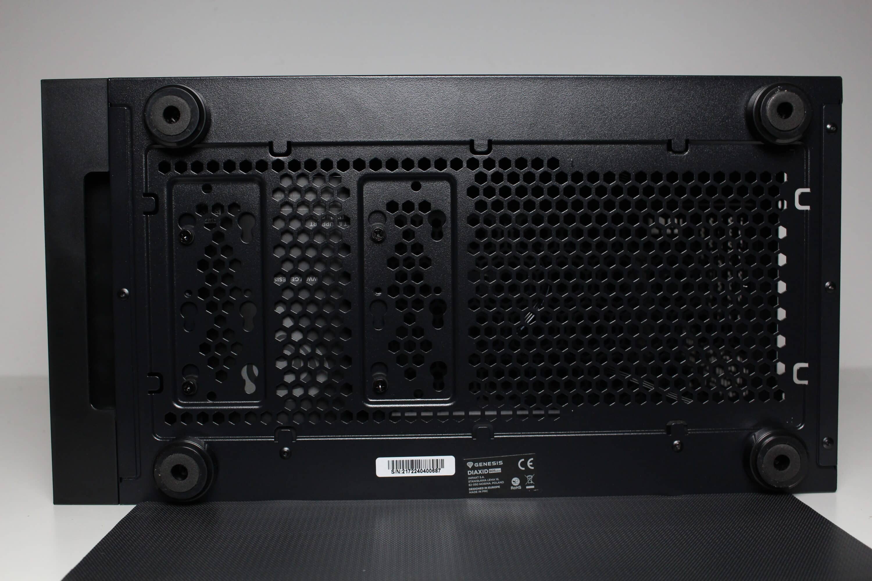 Für einen sicheren Stand sorgen beim Diaxid 605 vier stabile Standfüße aus Kunststoff mit Metalloptik. Zudem gewährleisten diese mit ihrer Höhe eine gute Belüftung für das Netzteil. Steht das Gehäuse am Boden, soll eine weitere Filtermatte aus Mesh eine starke Verschmutzung durch Staub verhindern. Die Befestigung erfolgt durch Magnete und zusätzlich durch Stahlnasen. Neben einem Belüftungsgitter stattet GENESIS den Boden noch mit diversen Montagepunkten für Datenträger bzw. einen HDD-Käfig aus.