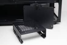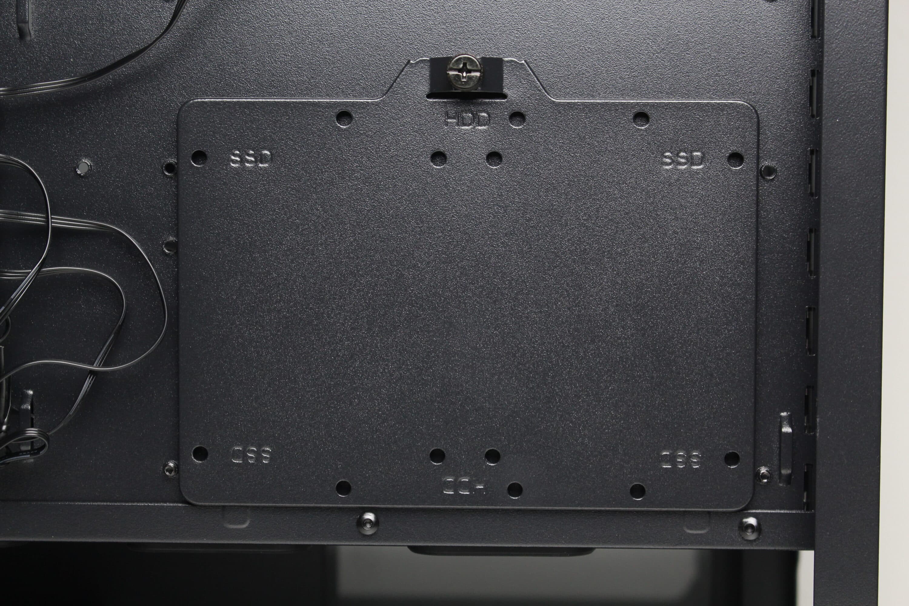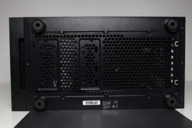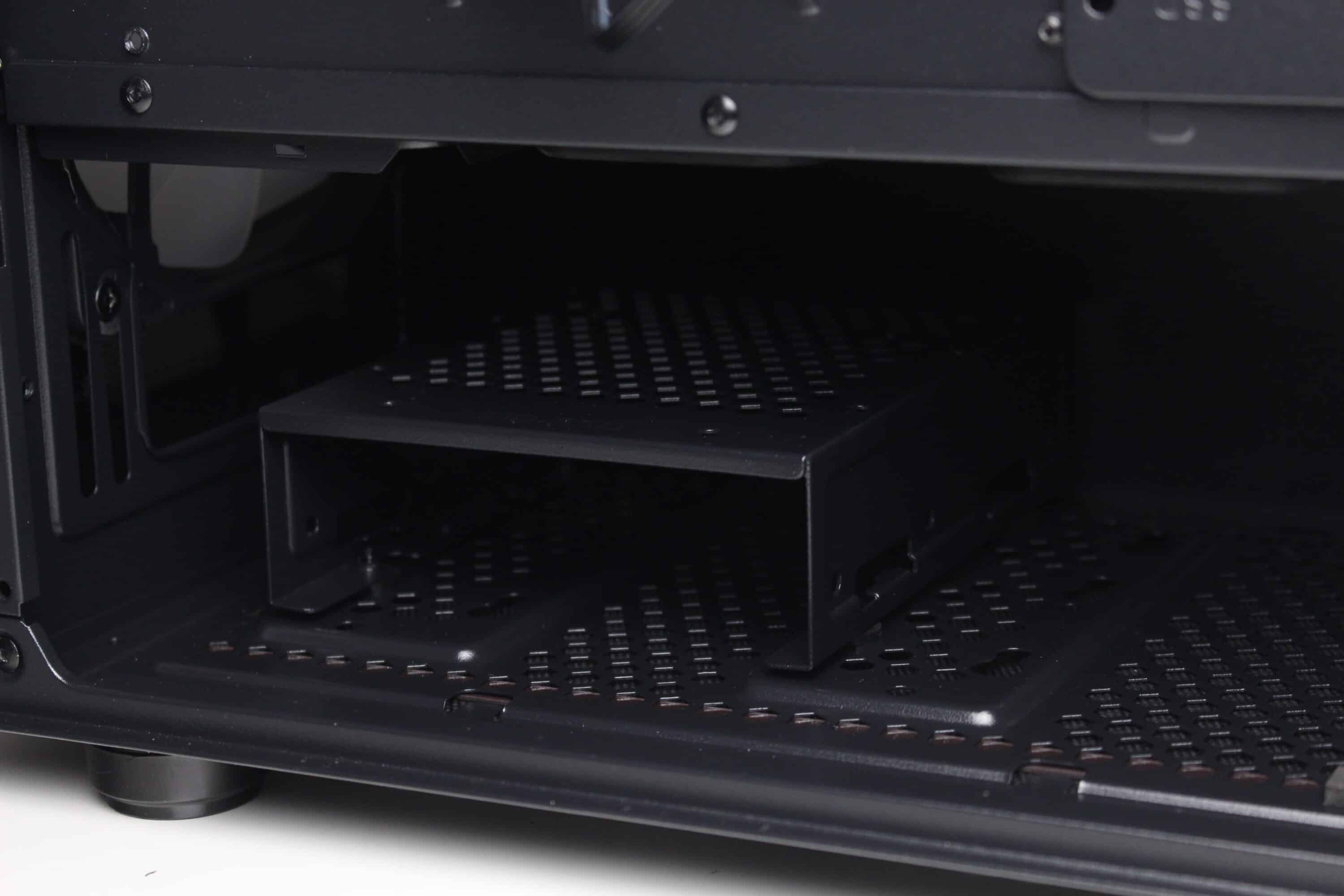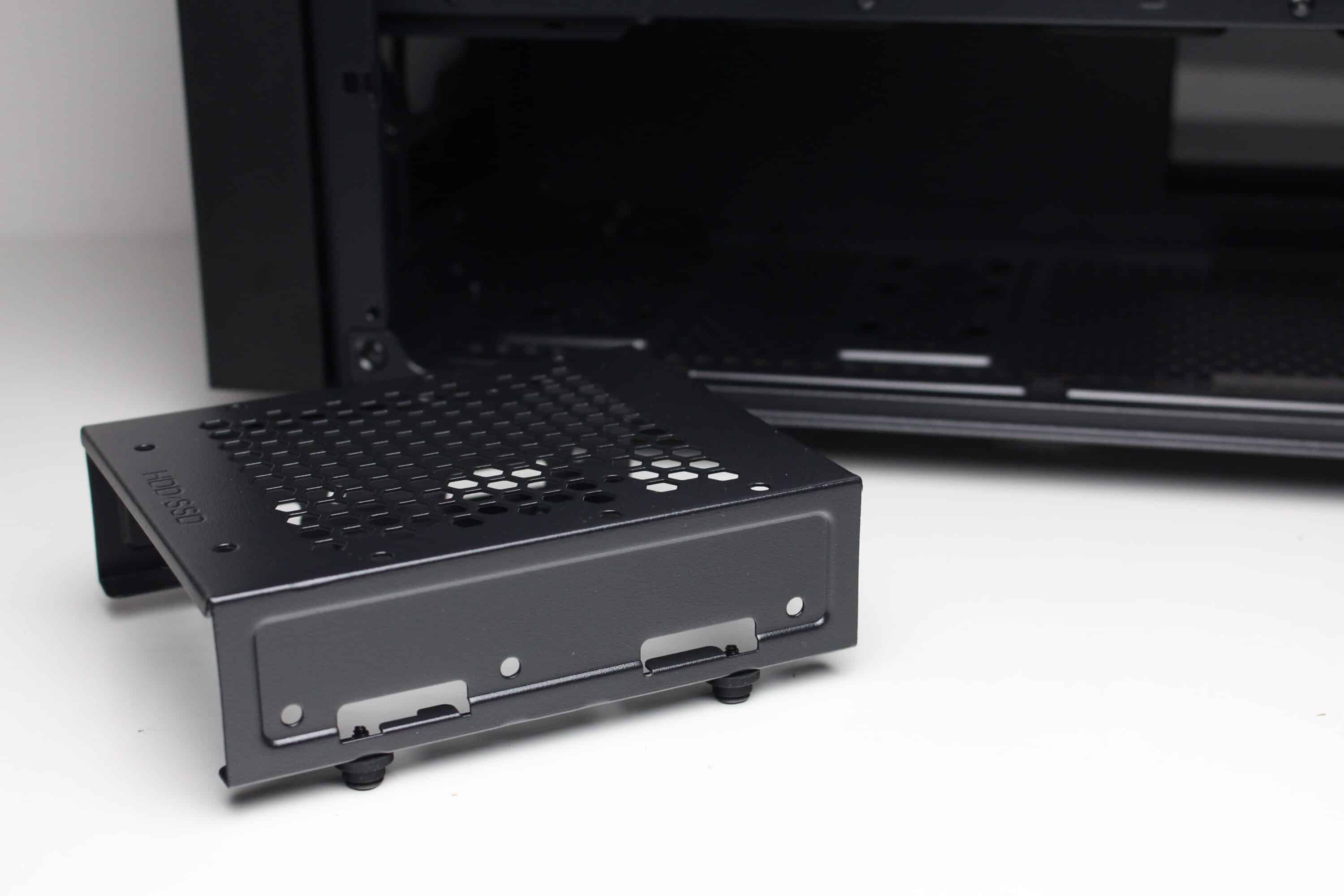 Die Befestigung des werkzeuglose HDD-Käfigs erfolgt im Boden über vier gummierte Schrauben, die ebenfalls eine entkoppelte Wirkung haben sollen. Verbaut werden können in diesem Käfig zwei 3,5″-Festplatten oder eine 3,5″- und eine 2,5″-HDD. Die Montage der Datenträger selbst erfolgt nicht entkoppelt und erfordert Werkzeug. Zwei weitere 2,5″-SSDs könnten an der Rückseite des Mainboard-Trays an einem modularen Stahlrahmen geschraubt werden.