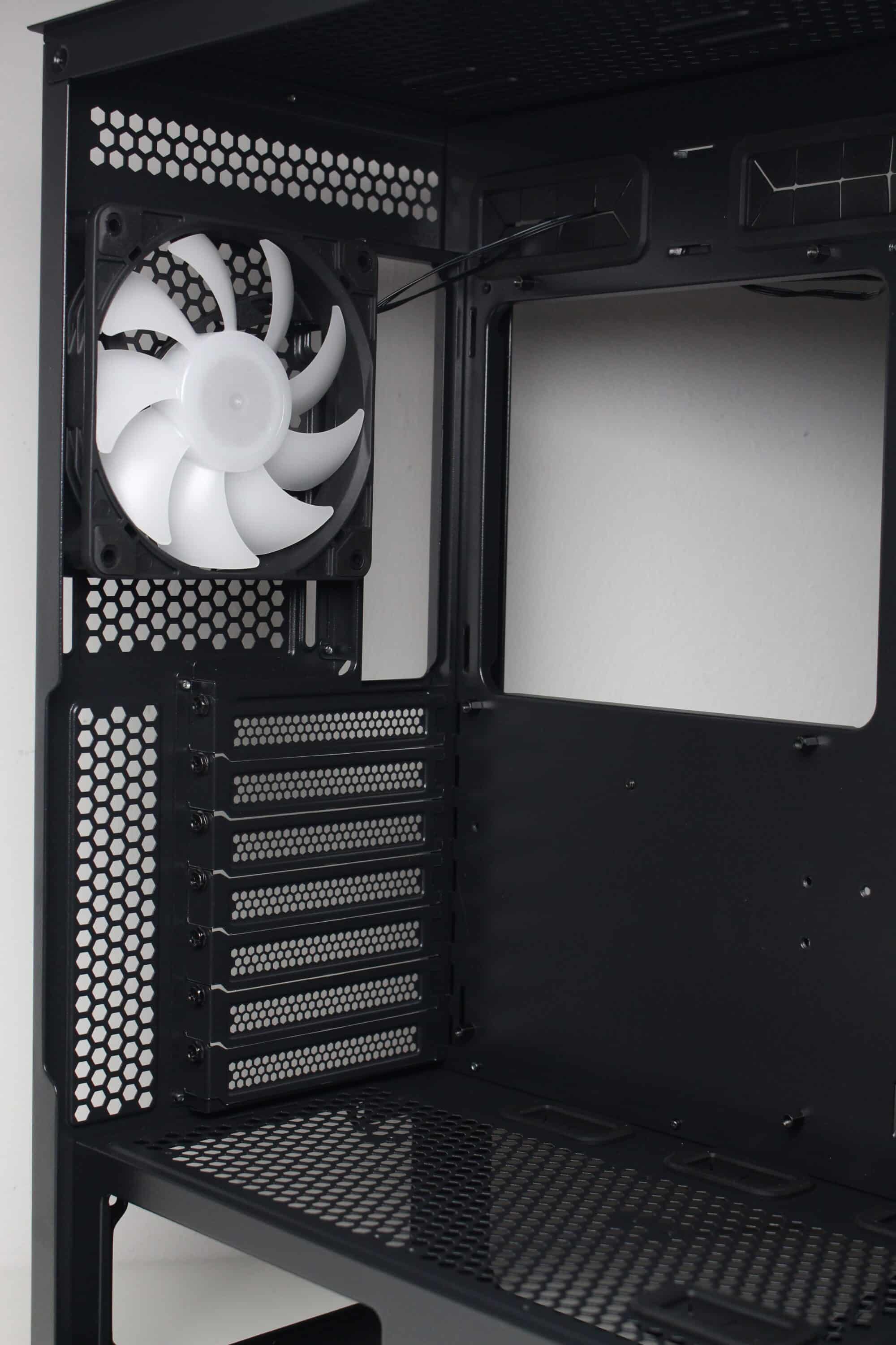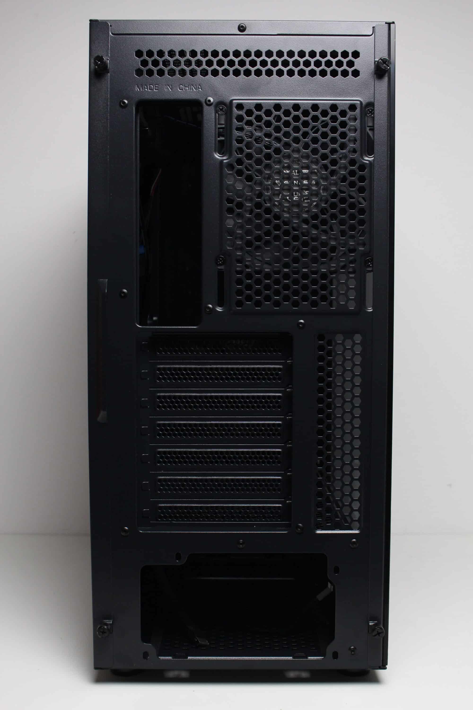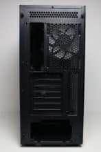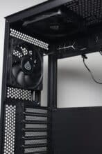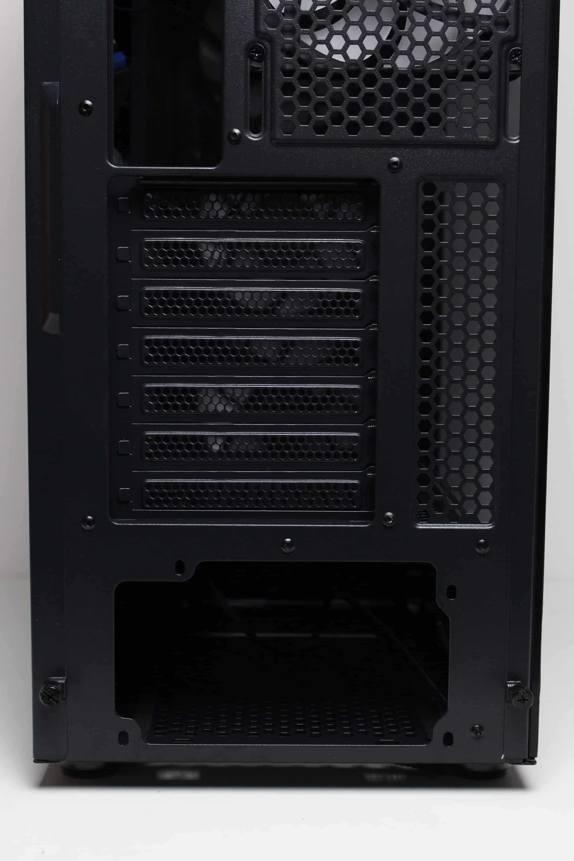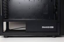 An der Rückseite gibt es keine Überraschungen. Die Öffnung für das Netzteil ist im unteren Bereich zu finden und darüber lassen sich insgesamt sieben belüftete und wiederverwendbare PCI-Slotblenden erkennen. Darüber hinaus bietet das Diaxid 605 an der Rückseite einen weiteren Platz zur Montage eines 120-mm-Lüfters sowie zusätzliche Belüftungsöffnungen direkt unter dem Deckel. Bei beiden Varianten ist auch dieser Platz bereits werksseitig bestückt.