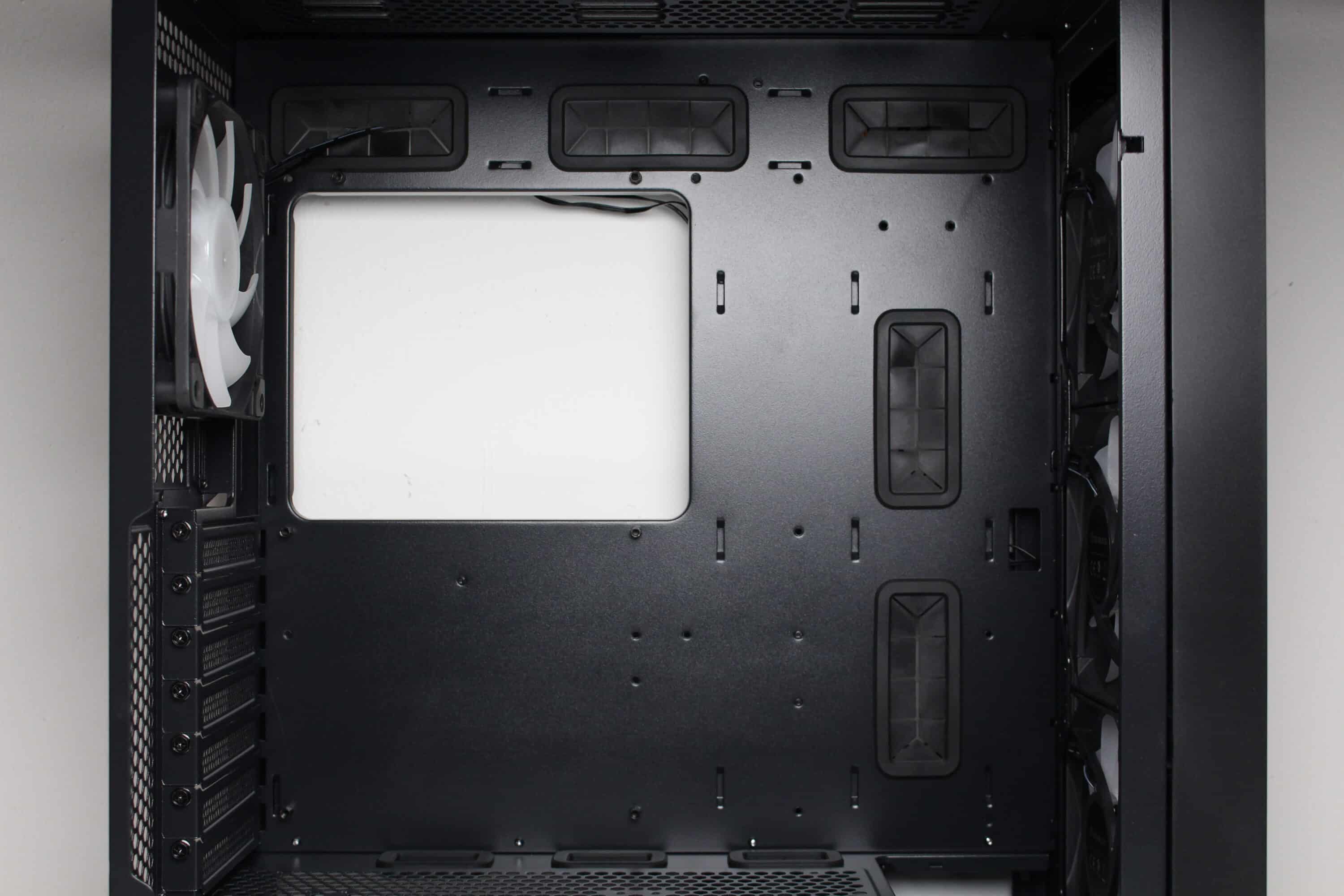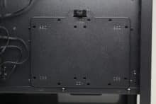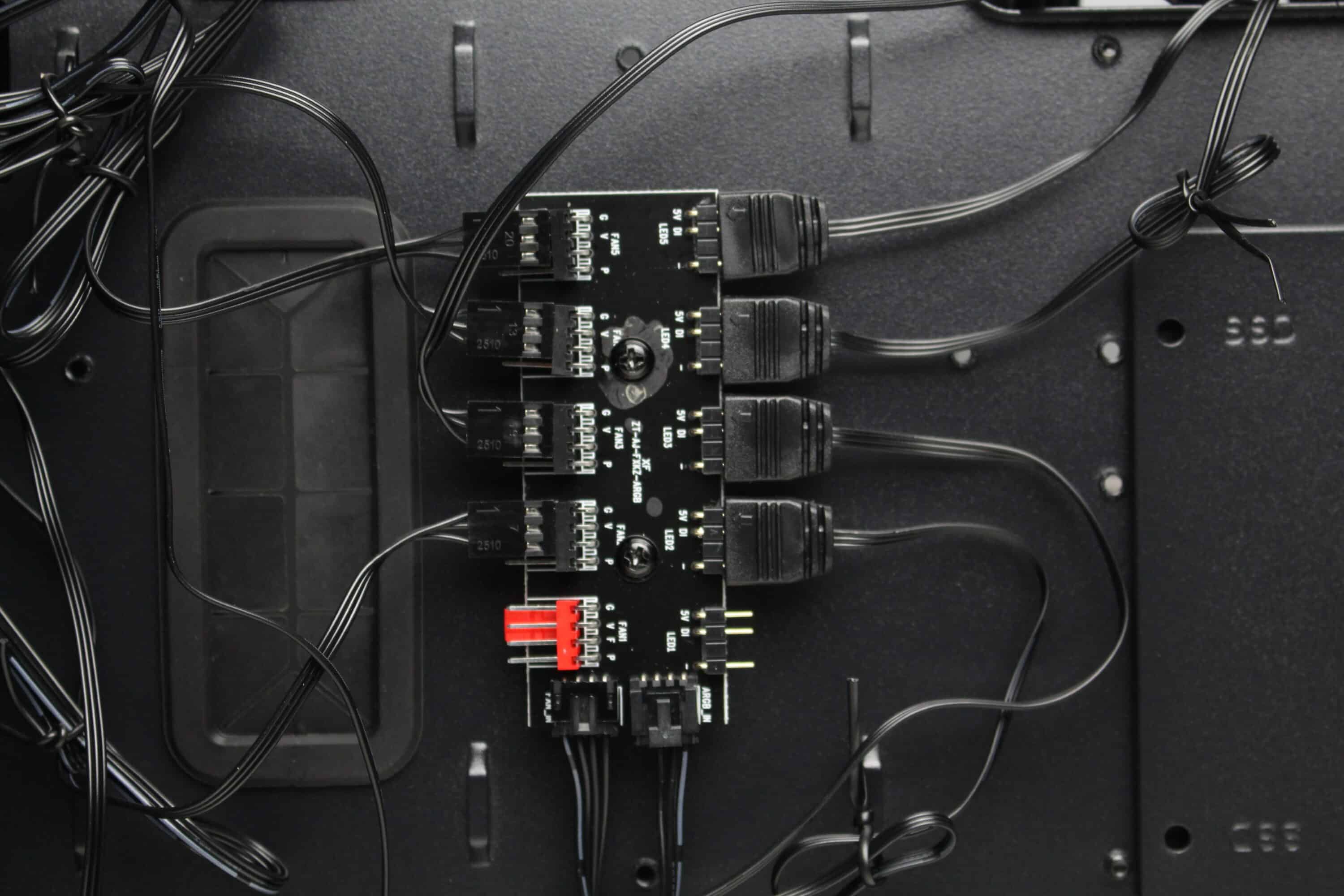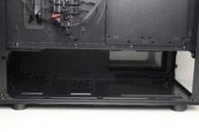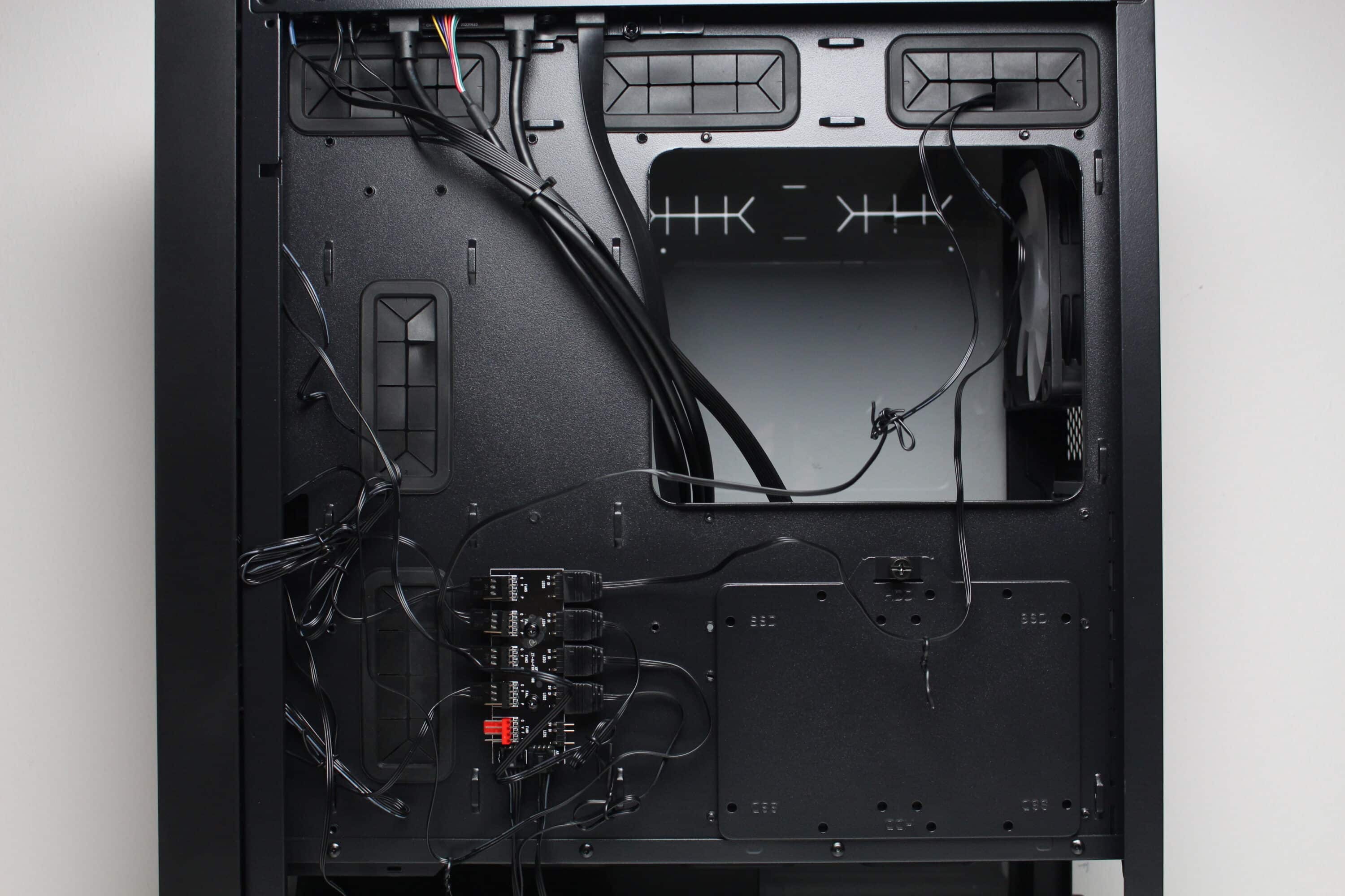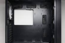 An der Rückseite des Mainboard-Trays implementiert der Hersteller ganze 16 Ösen für Kabelbinder und spendiert dem Diaxid 605 außerdem 25 Millimeter Platz für Kabel. Das sollte ein Verlegen aller Kabel deutlich vereinfachen bzw. zu einem Kinderspiel machen. Natürlich darf auch der obligatorische Ausschnitt im Mainboard-Tray nicht fehlen, der die nachträgliche Montage von CPU-Kühlern mit Backplate ermöglichen soll. Als letzter Punkt ist an dieser Stelle noch die Steuerplatine für die Gehäuselüfter zu erwähnen, die GENESIS ebenfalls an der Rückseite des Mainboards platziert.