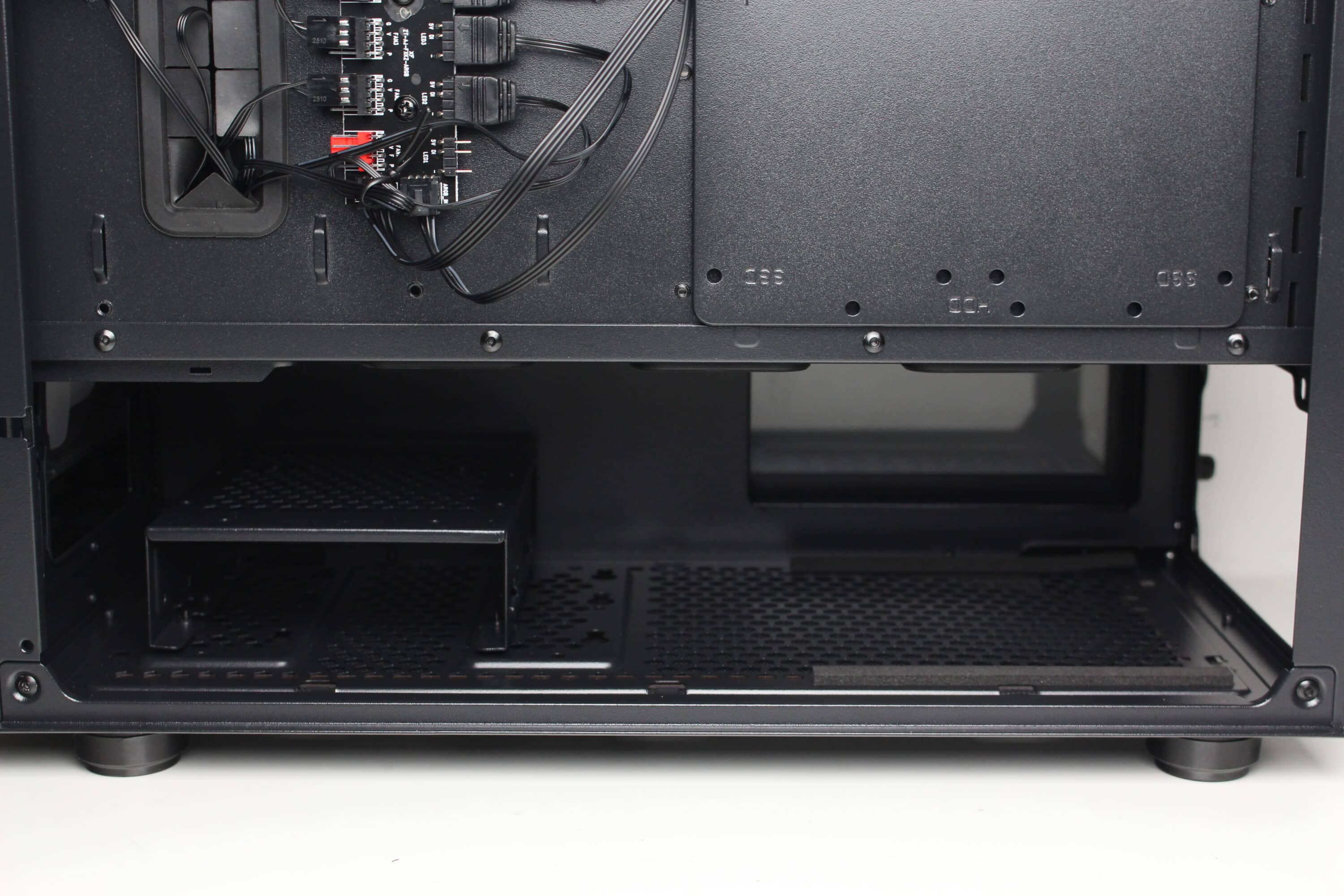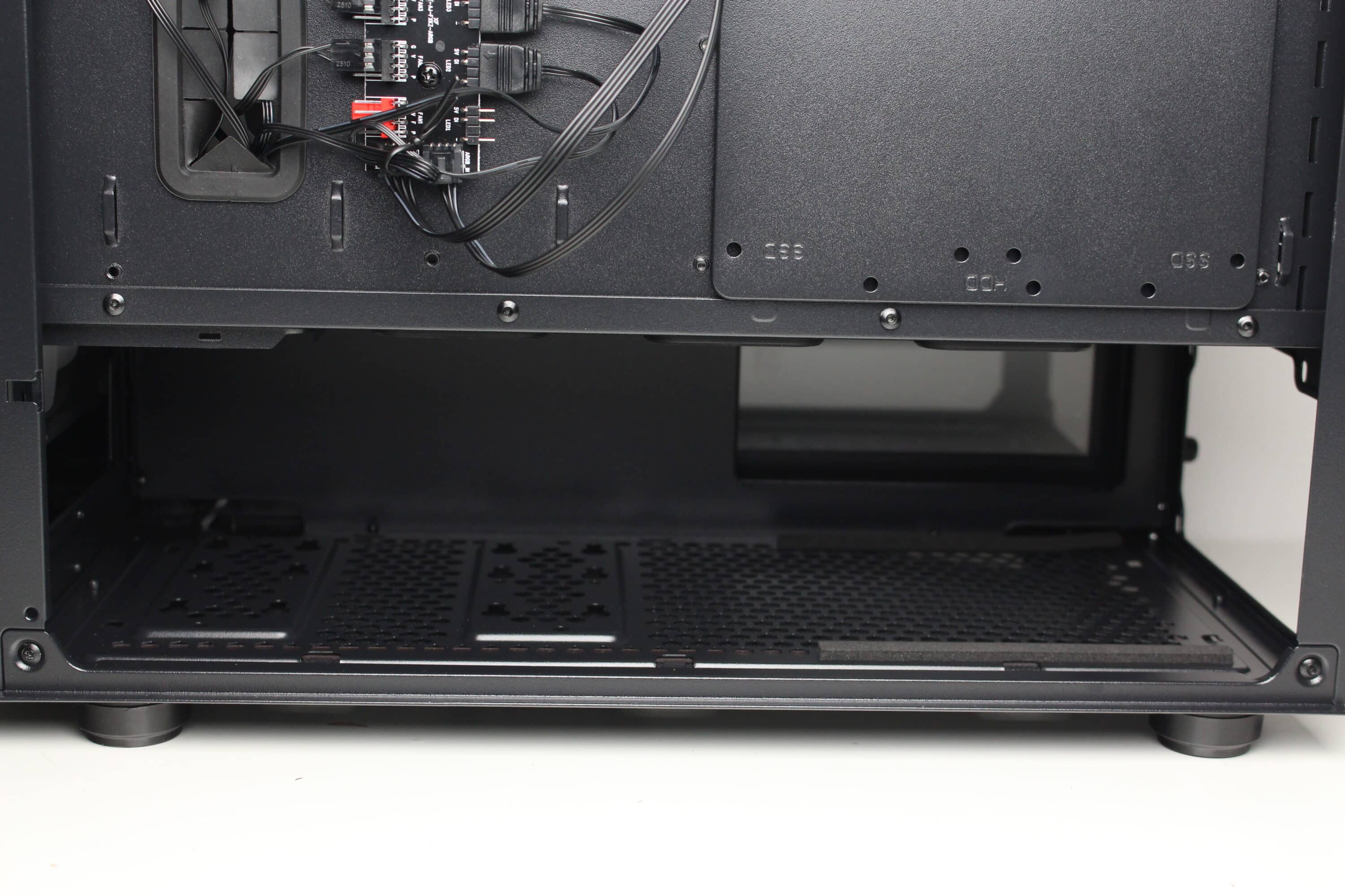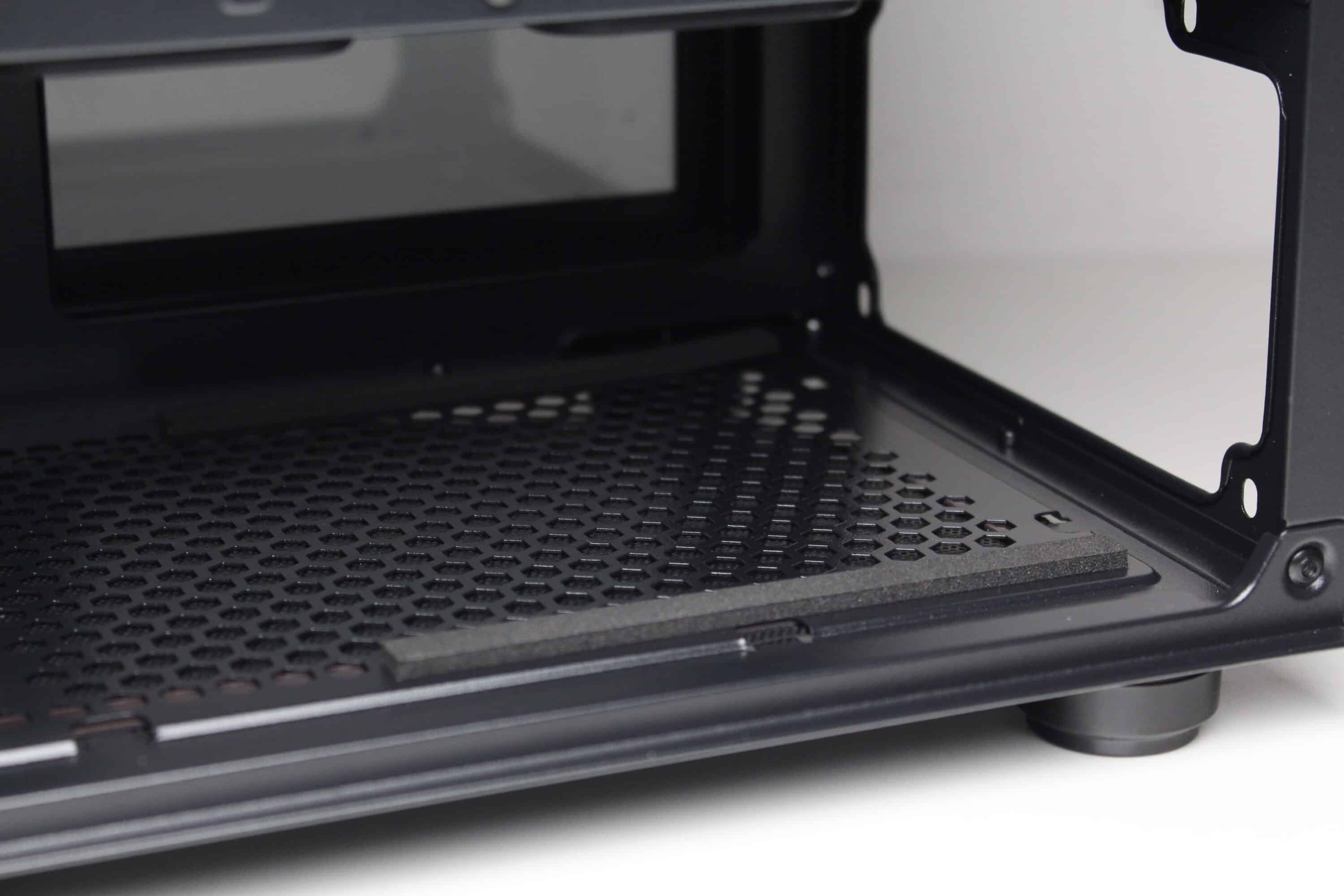 Ein Blick unter die Netzteilabdeckung offenbart die Montageposition für die PSU, welches zur Minimierung von Vibrationen auf zwei länglichen Gummistreifen platziert werden kann. Davor lässt sich der modulare HDD-Käfig erkennen, der entweder an zwei verschiedenen Positionen befestigt oder komplett ausgebaut werden kann.