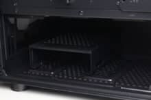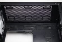 Zwei weitere Lüfter können oberhalb der perforierten Netzteilabdeckung montiert werden. Passende Schrauben legt der Hersteller dem Zubehör aber leider nicht bei. Zudem bietet die Abdeckung einen Ausschnitt für einen 420-mm-Wasserkühlungsradiator in der Front und vier weitere gummierte Öffnungen für das Stromkabel der Grafikkarte und weitere Anschlusskabel. Zuletzt ist seitlich noch ein Aufdruck der Modellbezeichnung zu erkennen.