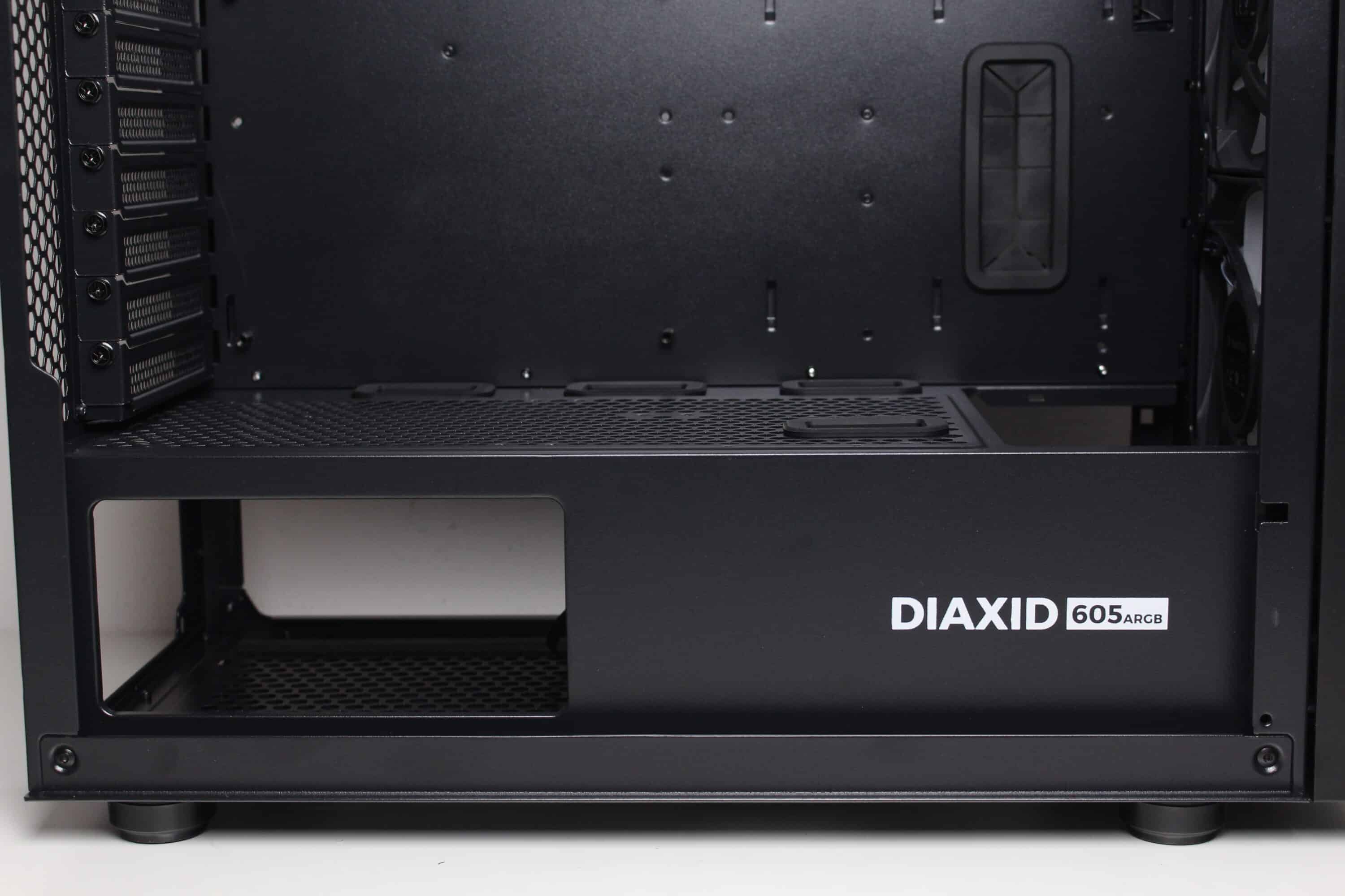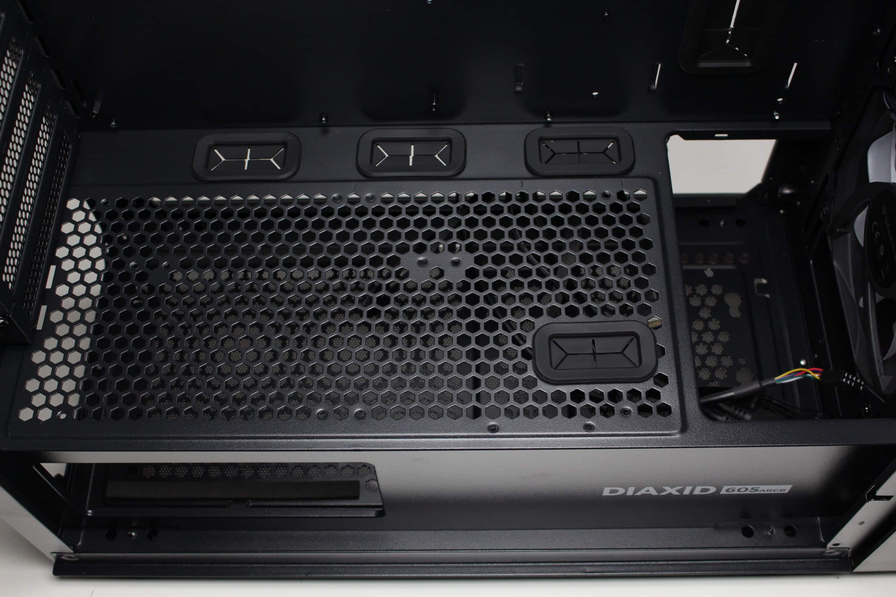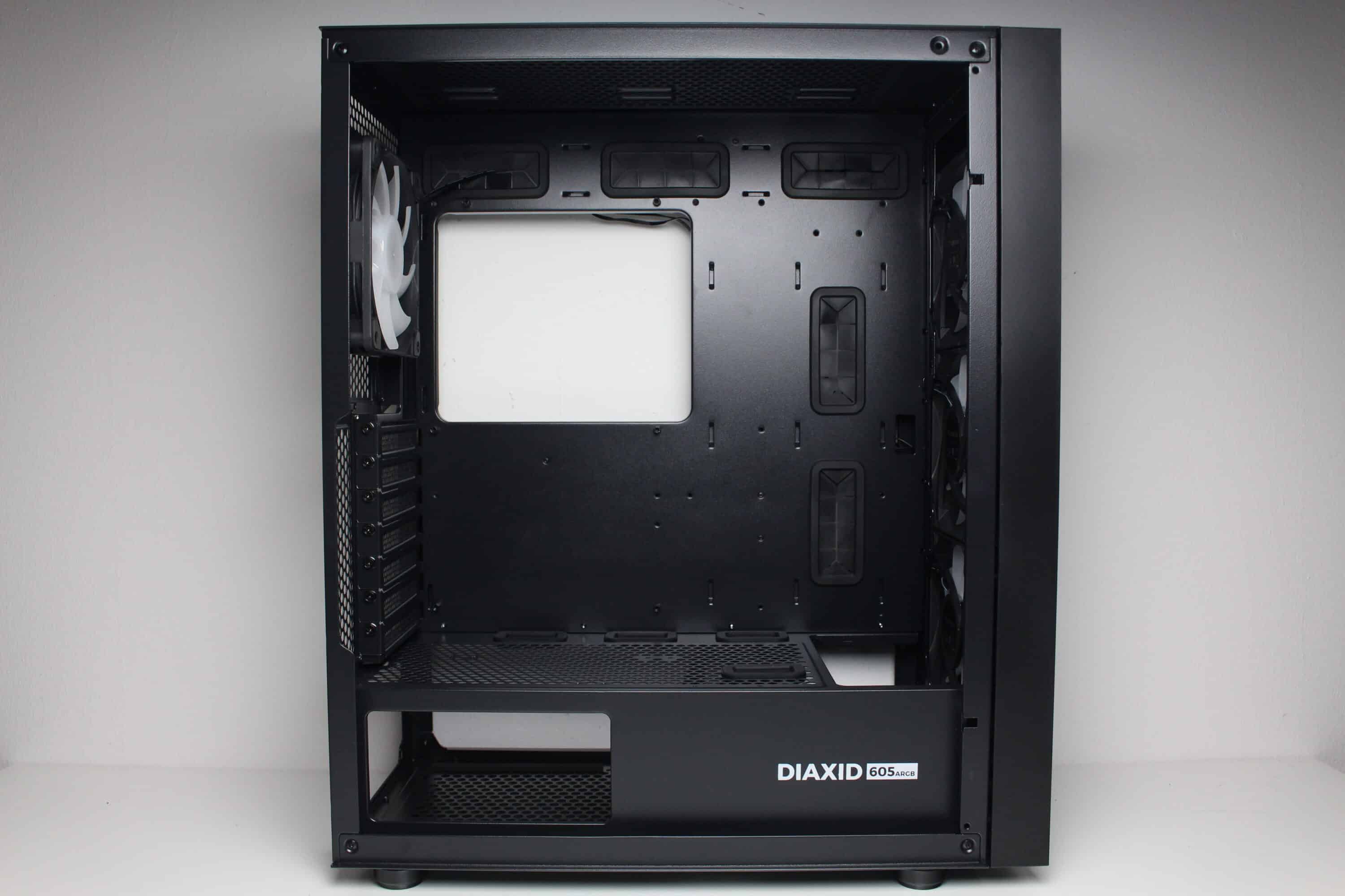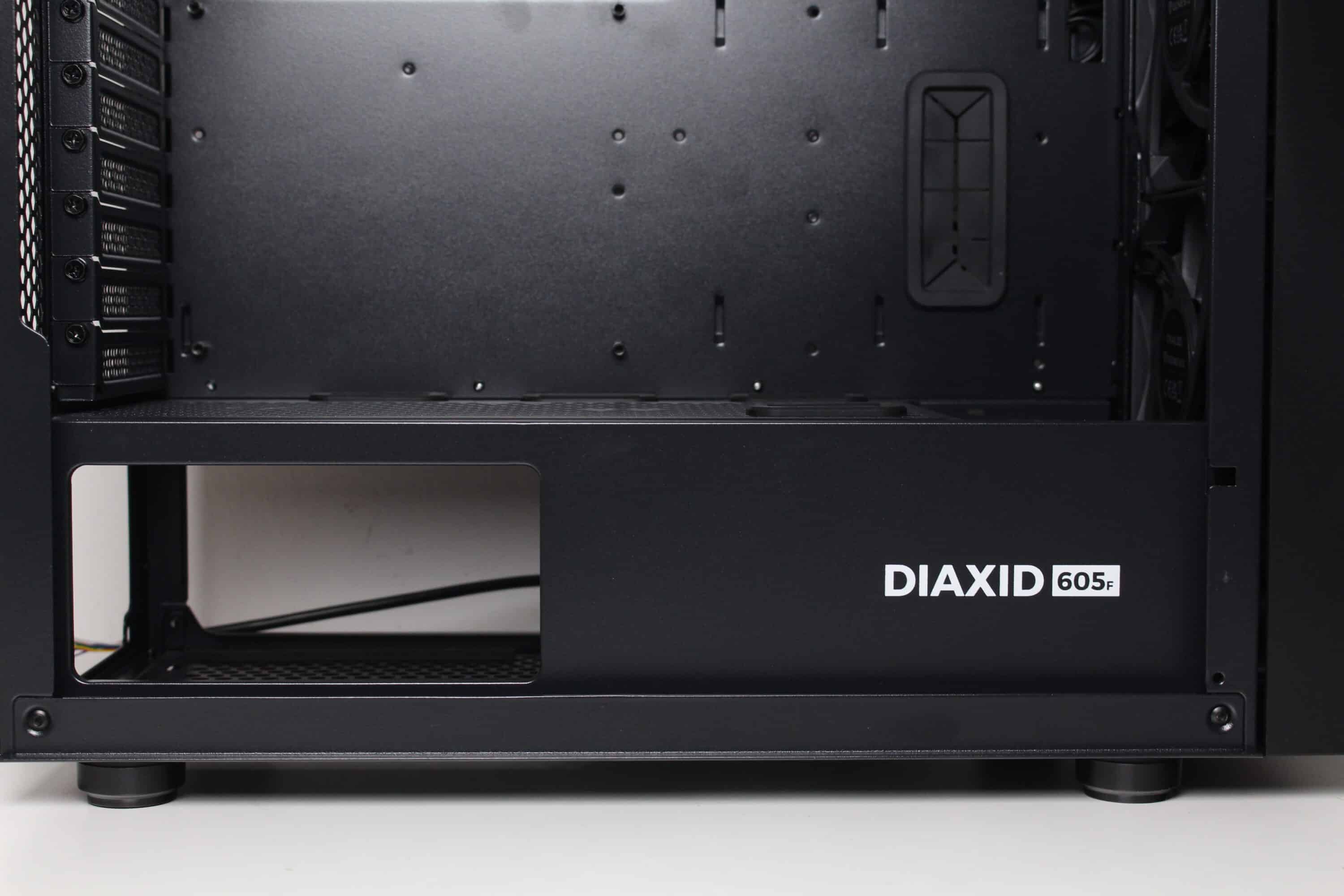 Aufgrund fehlender Festplattenkäfige in der Hauptkammer können die drei vorinstallierten Lüfter an der Front ungehindert kalte Luft in den Innenraum befördern, die nach der Kühlung der Komponenten dann aktiv über den Hecklüfter und passiv über die Belüftungsöffnungen im Deckel entweichen kann. Beim Diaxid 605F sorgt ein fünfter vorinstallierter Lüfter im Deckel darüber hinaus für eine zusätzliche aktive Kühlung.