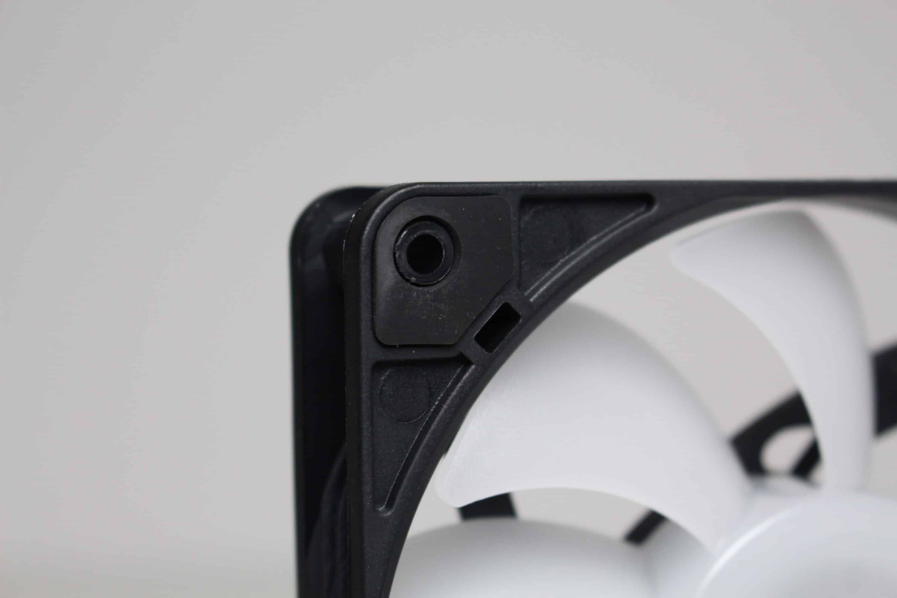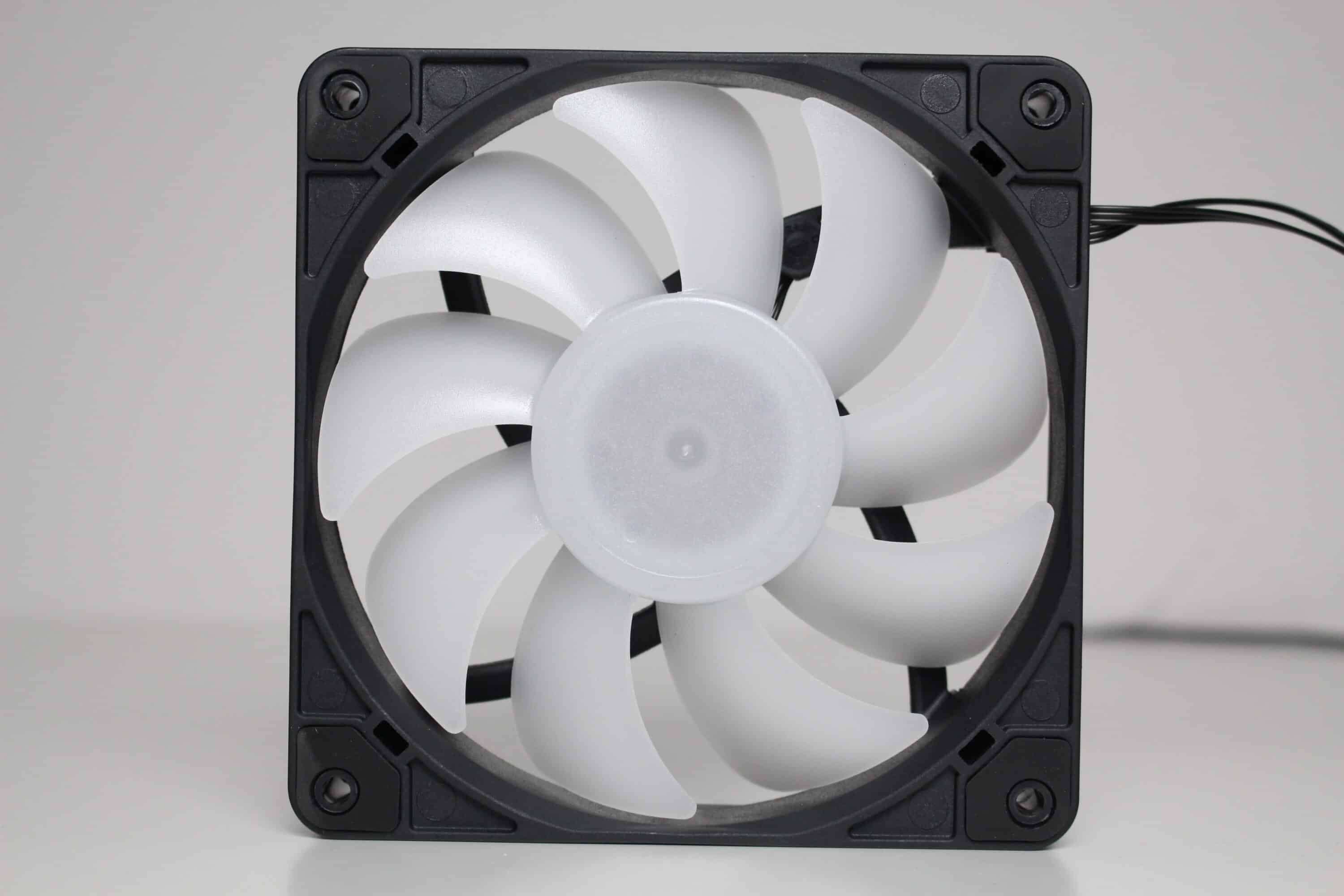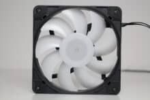 Die vier vorinstallierten 120-mm-ARGB-Lüfter beim Diaxid 605 ARGB verfügen über einen schwarze Lüfterrahmen und einen milchig-weißen Rotor mit insgesamt neun Lüfterblättern. Die Beleuchtung gewährleisten zehn LEDs in der Lüfternabe. Angeschlossen werden die 3-Pin-Lüfter entweder an der integrierten PWM- und ARGB-Steuerplatine oder direkt am Mainboard, wenn dieses über die entsprechende Anzahl an Lüfteranschlüssen bzw.