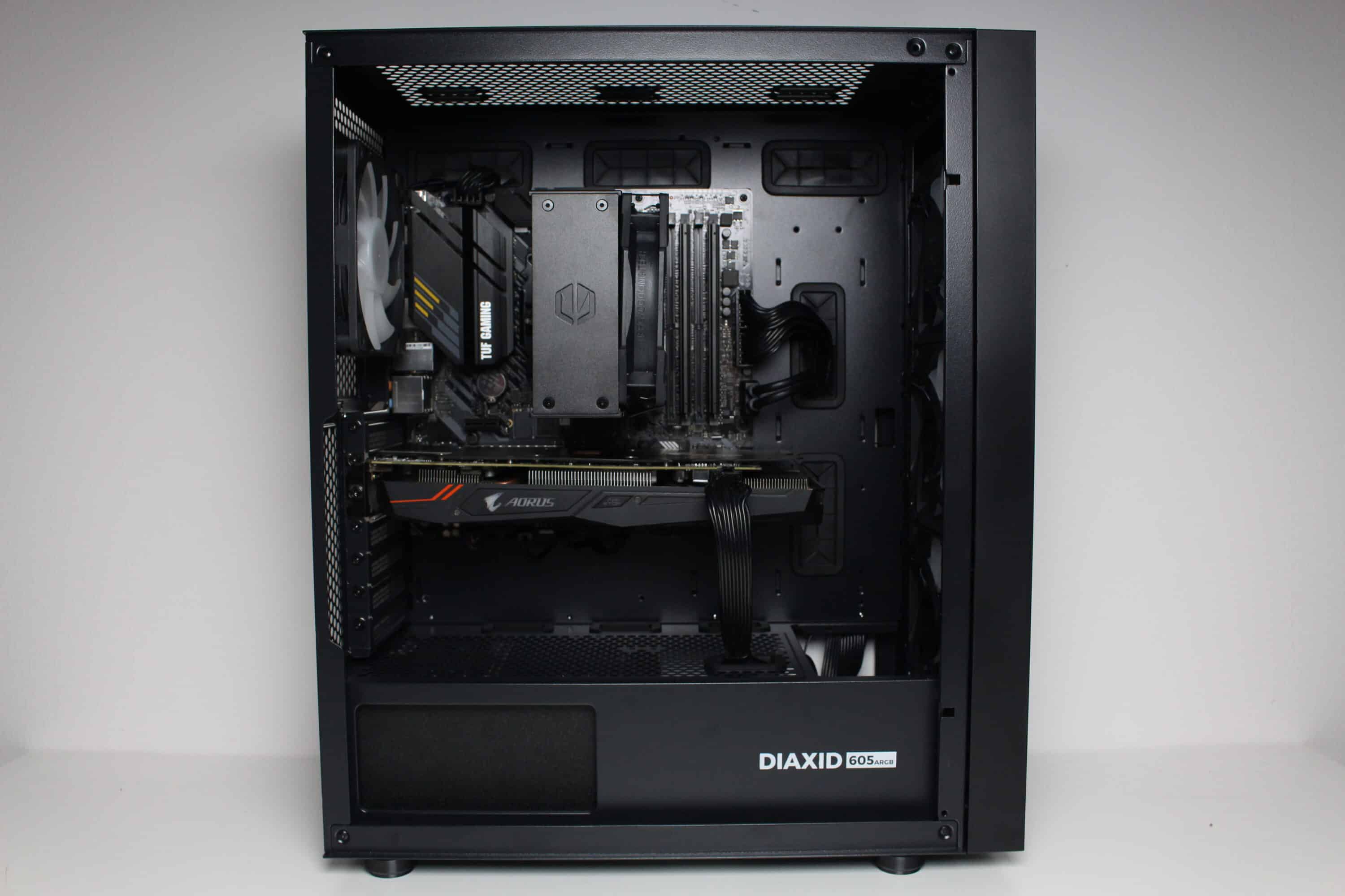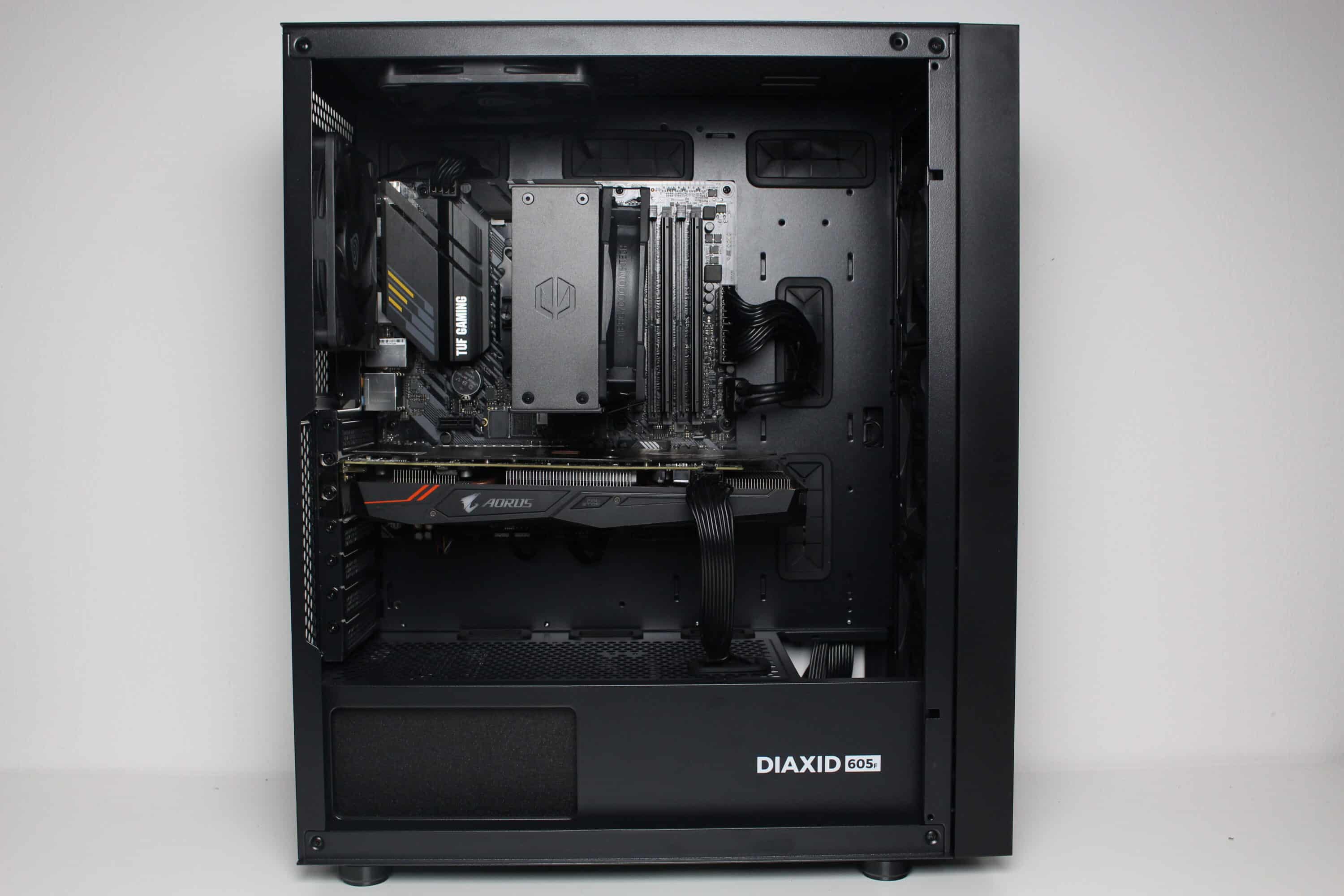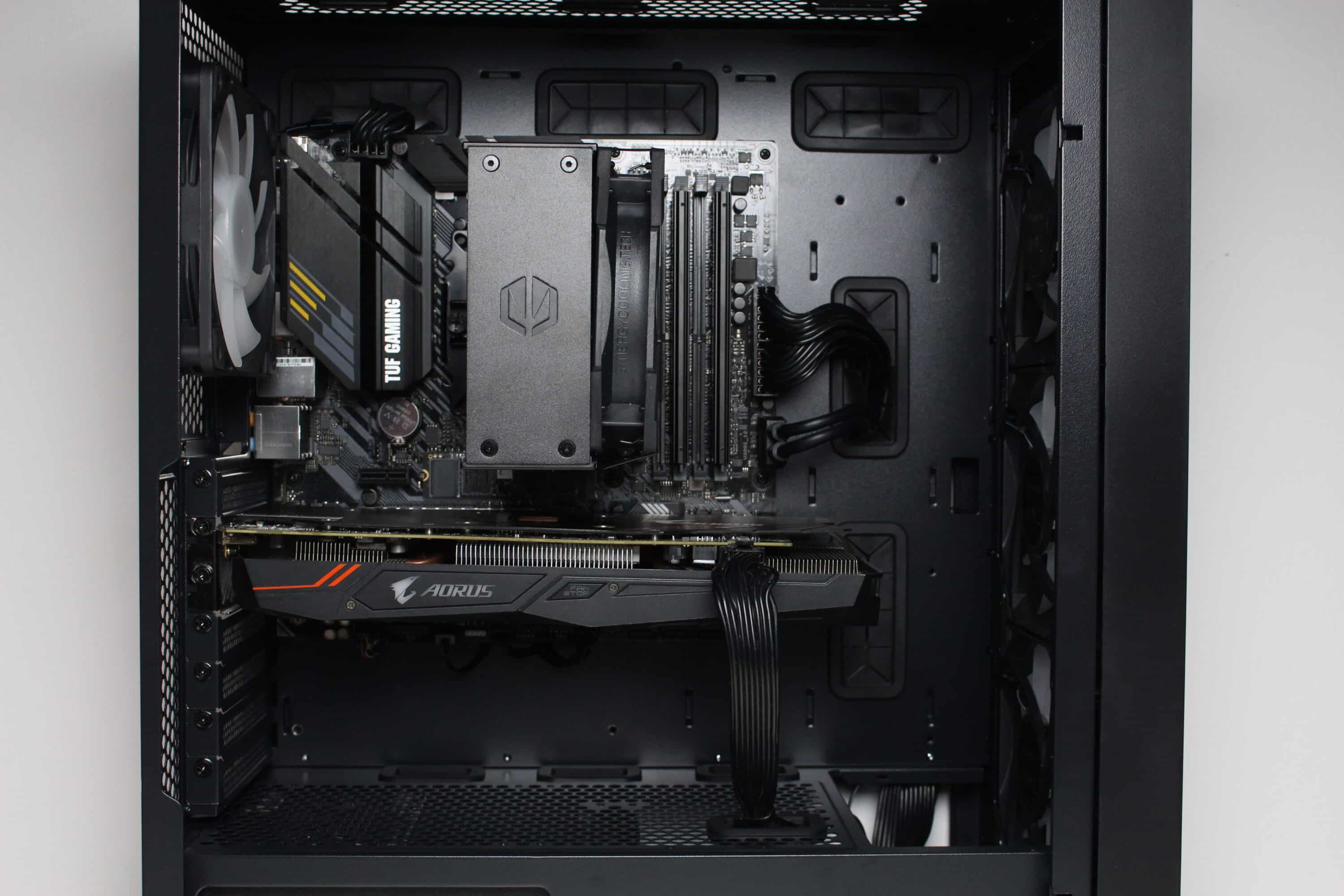 Nun kommen wir zum Systemeinbau beim GENESIS Diaxid 605 Test. Als Hardware verwenden wir einen AMD Ryzen 5 1400* auf einem ASUS TUF Gaming B550M-Plus* mit 16GB Crucial Ballistix Sport LT grau DDR4-2666*. Der Ryzen wird von einem Alpenföhn Brocken 4* gekühlt und ist auf 3,8 GHz (1,175 V) übertaktet. Für die Bildausgabe ist eine Gigabyte AORUS GTX 1060 6GB zuständig. Die Stromversorgung erledigt das vollmodulare LC-Power LC550 V2.31 Platinum*.