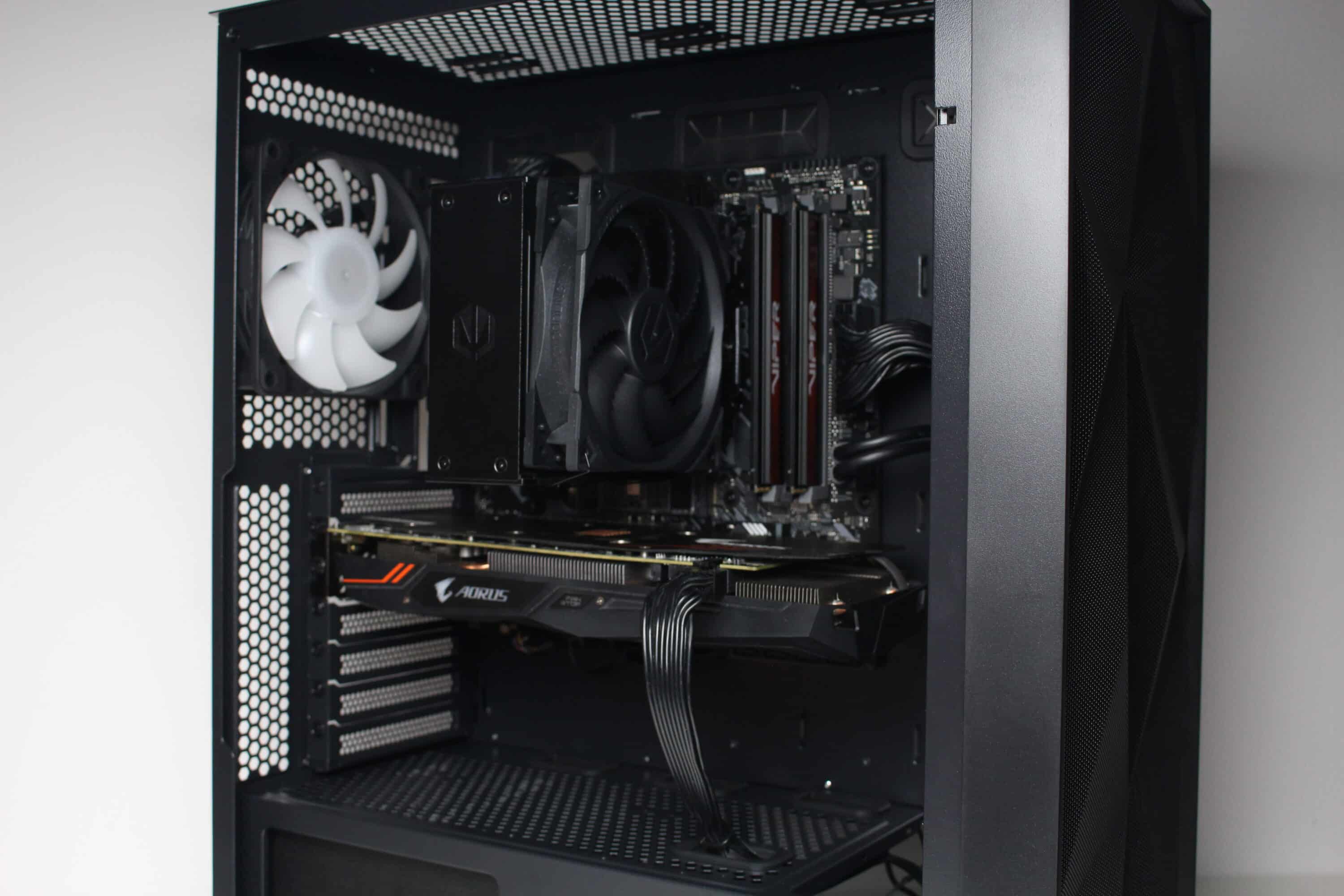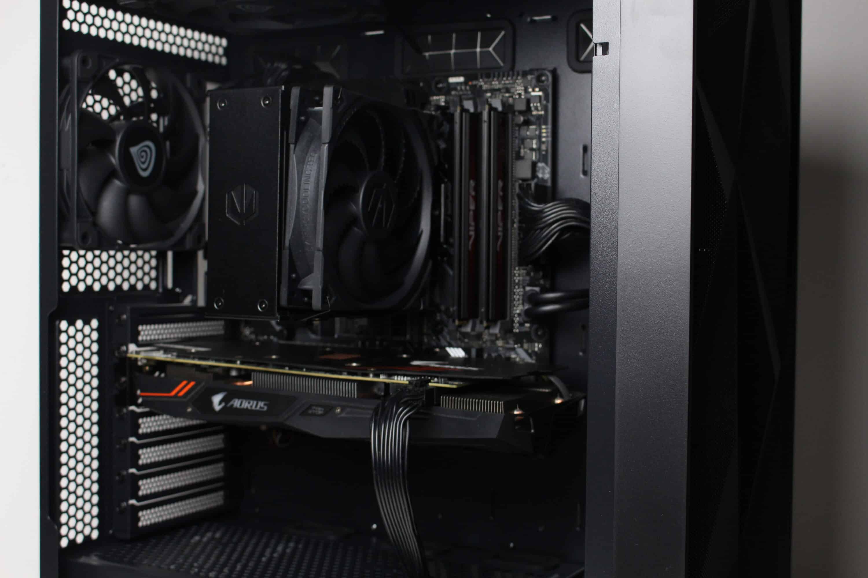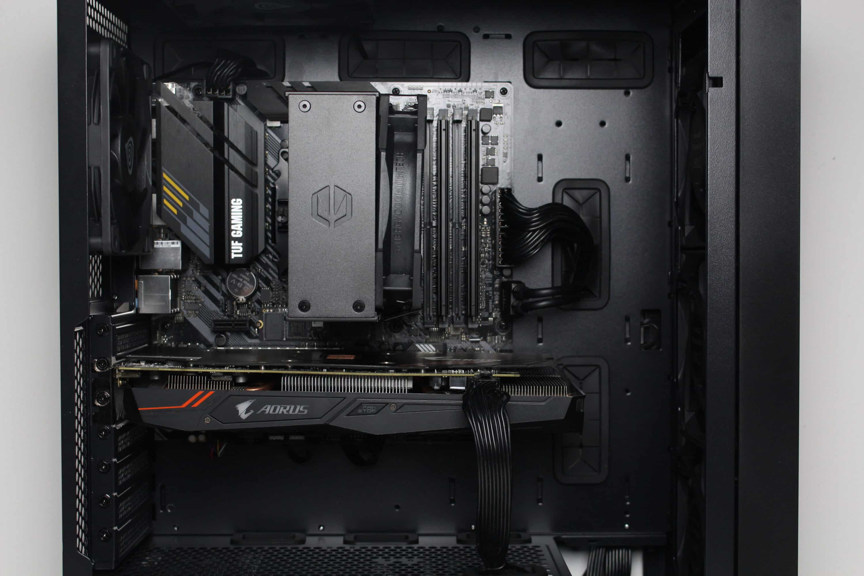 Nun kommen wir zum Systemeinbau beim GENESIS Diaxid 605 Test. Als Hardware verwenden wir einen AMD Ryzen 5 1400* auf einem ASUS TUF Gaming B550M-Plus* mit 16GB Crucial Ballistix Sport LT grau DDR4-2666*. Der Ryzen wird von einem Alpenföhn Brocken 4* gekühlt und ist auf 3,8 GHz (1,175 V) übertaktet. Für die Bildausgabe ist eine Gigabyte AORUS GTX 1060 6GB zuständig. Die Stromversorgung erledigt das vollmodulare LC-Power LC550 V2.31 Platinum*.