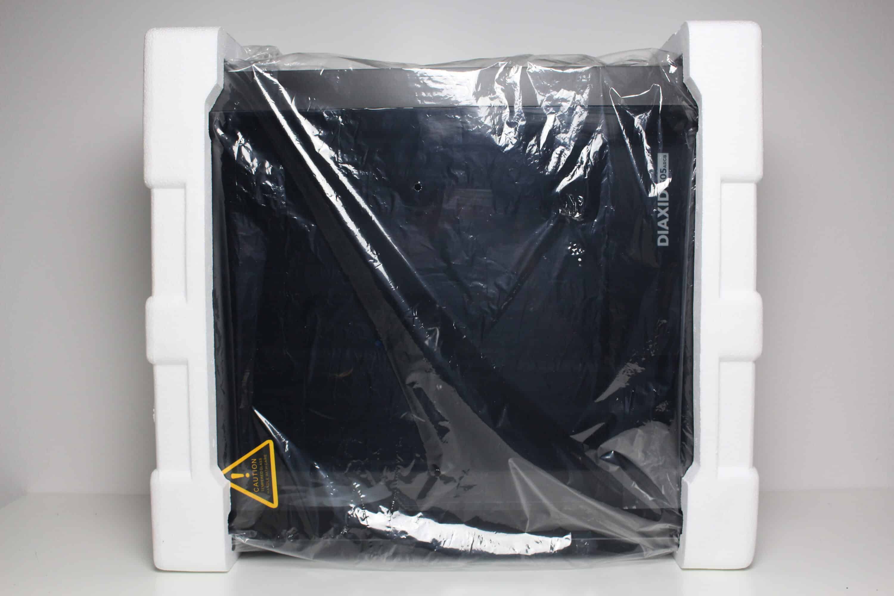 Im Karton umhüllt der Hersteller die Midi-Tower mit zwei Blöcken aus hartem Styropor sowie mit einer Folie aus Kunststoff. Unter Einbeziehung des Gewichts fallen die Styroporelemente aber verhältnismäßig dünn aus. Sämtliches Montagezubehör findet sich in einem einfachen Beutel aus Kunststoff, der mittels Kabelbinder an der Rückseite des Mainboard-Trays befestigt wurde. Mitgeliefert werden alle notwendigen Montageschrauben, einige Kabelbinder, eine gedruckte Montageanleitung sowie ein Mainboard-Speaker. Vorinstalliert sind außerdem zwei Staubfilter, vier 120-mm-ARGB-(Diaxid 605 ARGB) bzw. fünf normale 120-mm-Lüfter (Diaxid 605F) sowie die dazugehörige PWM- und ARGB-Steuerplatine.