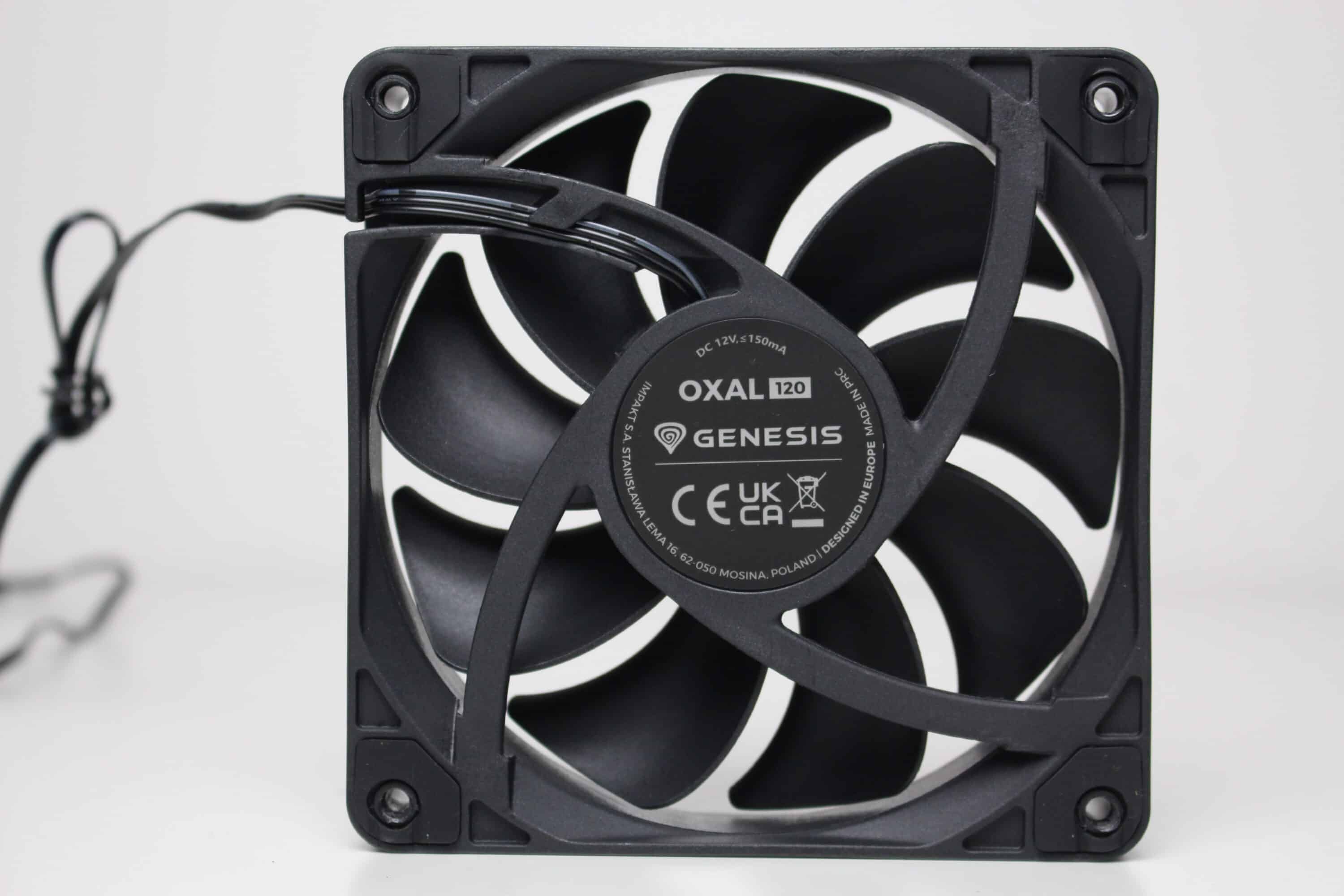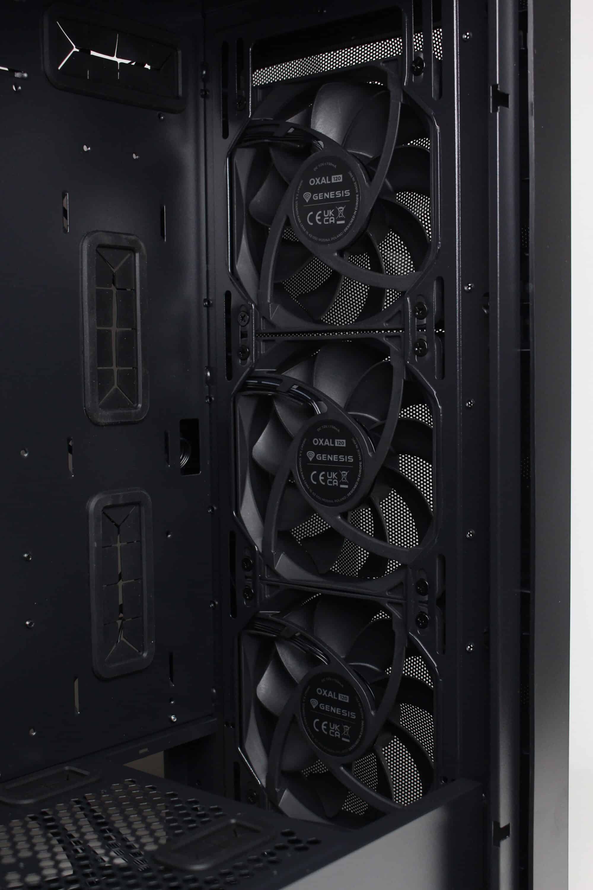 Im GENESIS Diaxid 605F verbaut der Hersteller insgesamt fünf 120-mm-Lüfter vom Typ Oxal 120. Diese sind schlicht schwarz gestaltet und verfügen über eine maximale Rotationsgeschwindigkeit von 1300 Umdrehungen pro Minute. Angeschlossen werden die Lüfter jeweils über einen herkömmlichen 3-Pin-Anschluss, sind werksseitig aber mit der vorinstallierten Steuerplatine verbunden. Außerdem verfügt der Lüfterrahmen beidseitig über Gummierungen zur Entkopplung.