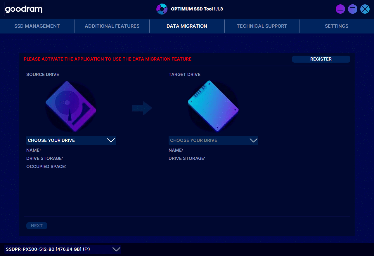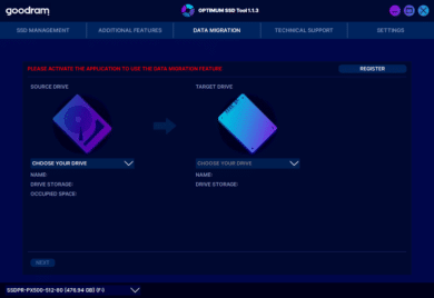 Mit der Datenmigration kann beispielsweise der Inhalt eines bisherigen Laufwerks auf die neue Goodram SSD kopiert werden. Um dieses Feature nutzen zu können, muss die Software allerdings zuvor registriert werden.