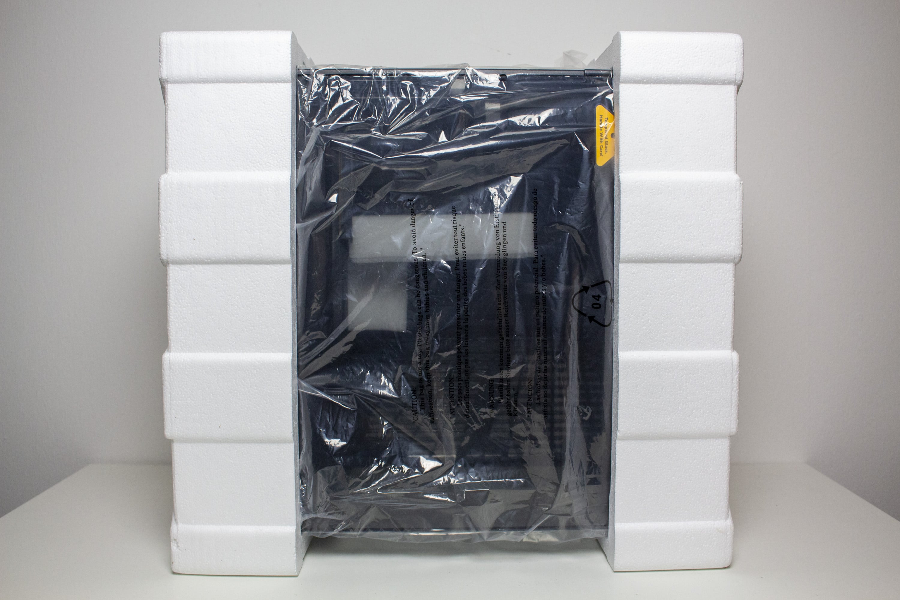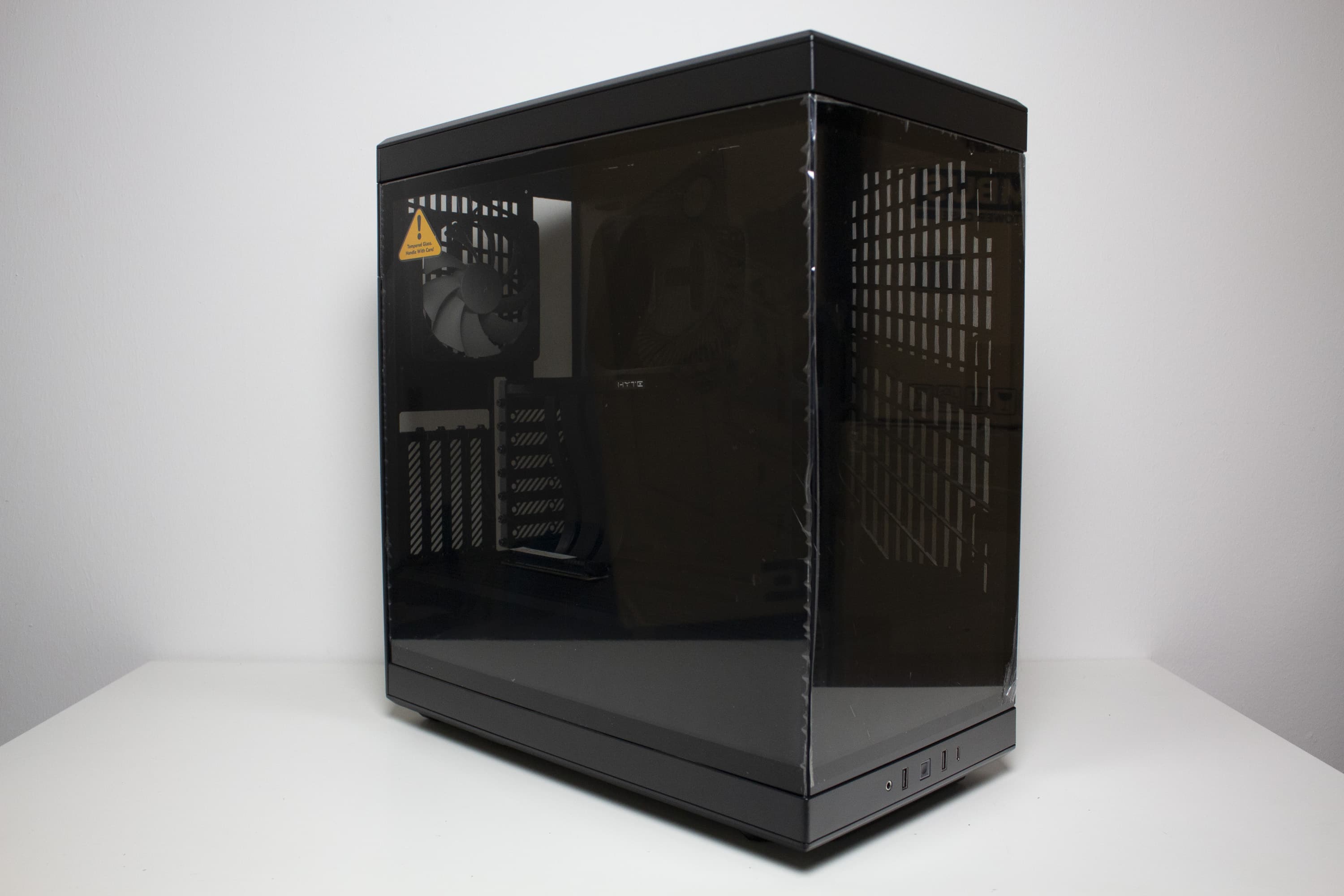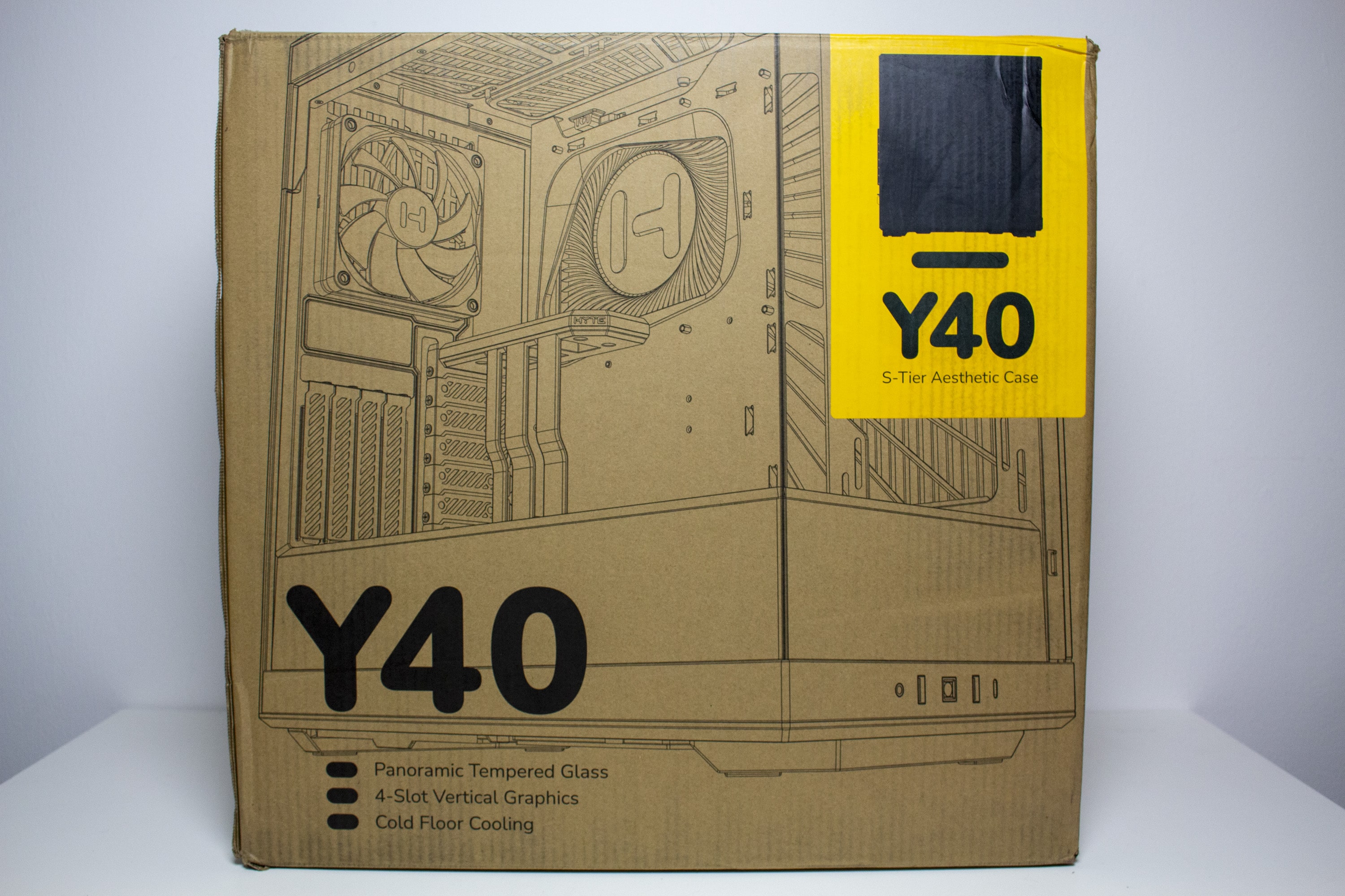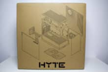 Wie wir es von HYTE kennen, wird auch das Gehäuse in einem Karton aus Pappe verpackt, bei welcher aber zugunsten des Preises und zum Schutz der Umwelt auf eine farbige Bedruckung verzichtet wurde. Stattdessen beklebt der Hersteller die Verpackung mit einem gelben Aufkleber, der den Hersteller- bzw. Gehäusenamen sowie die Farbvariante angibt. Ansonsten finden sich auf dem Karton technische Zeichnungen sowie alle relevanten technischen Daten und die wichtigsten Key-Features. Innerhalb der Verpackung setzt HYTE auf zwei Blöcke aus hartem Styropor, eine Schutzfolie sowie Schutzaufkleber auf beiden Glasscheiben.