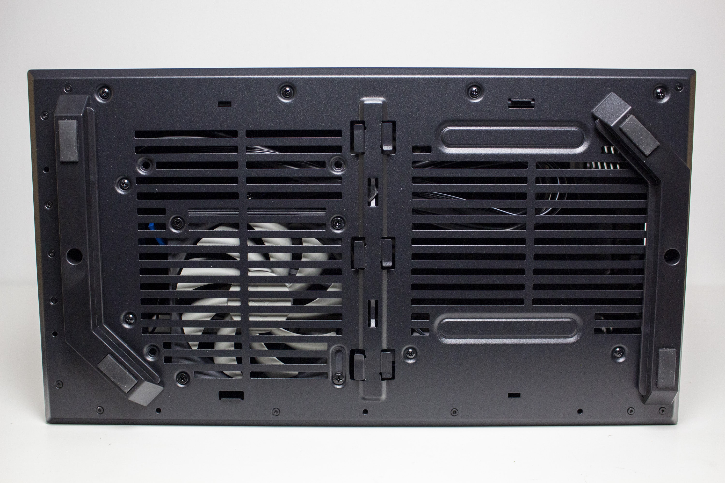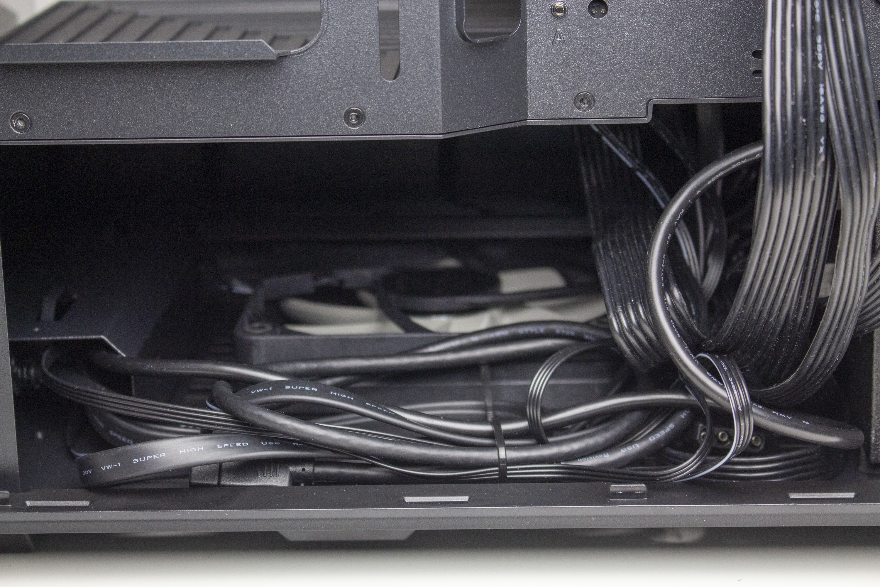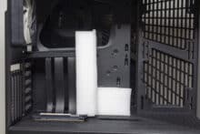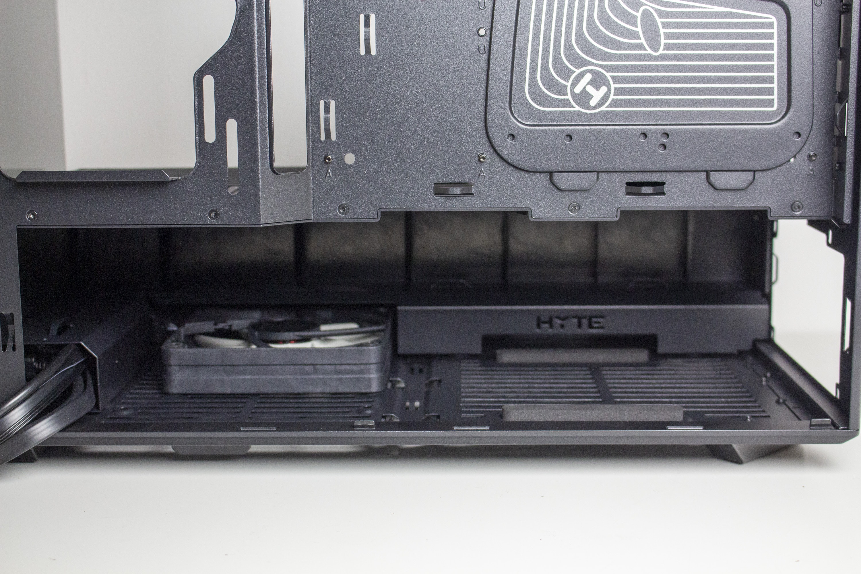Unterhalb der Netzteilabdeckung finden das Netzteil sowie der zweite vorinstallierte 120-mm-Lüfter Platz. Das Netzteil ruht dabei zur Entkopplung auf zwei länglichen Streifen aus Moosgummi. Der Lüfter wurde davor platziert und kann bei Bedarf auch durch ein 140-mm-Model ersetzt werden. Damit die Kabel des Netzteils nicht im Lüfter hängen bleiben, spendiert HYTE der Netzteilkammer noch eine Art Kabelkanal mit zahlreichen Ösen für Kabelbinder.