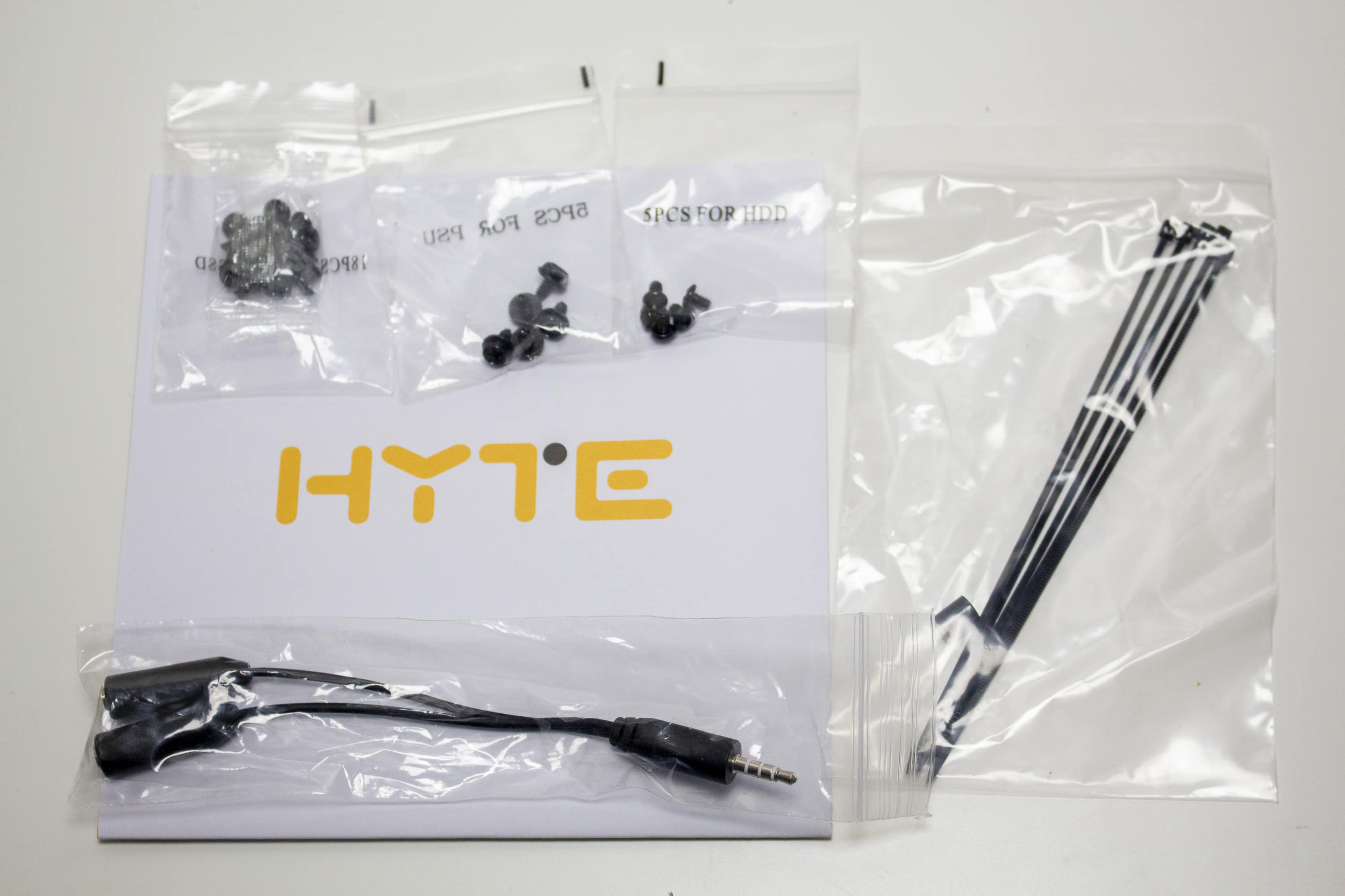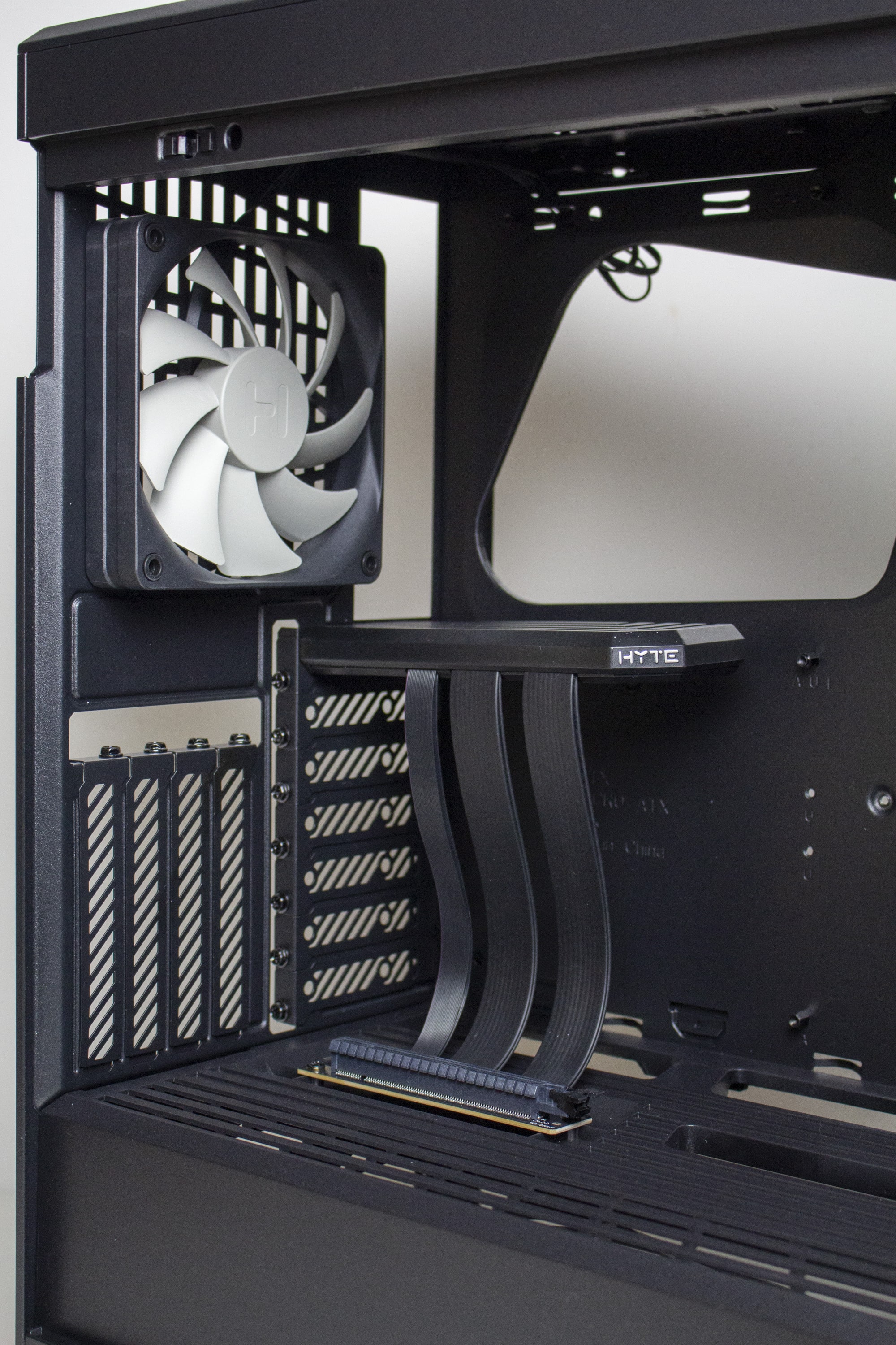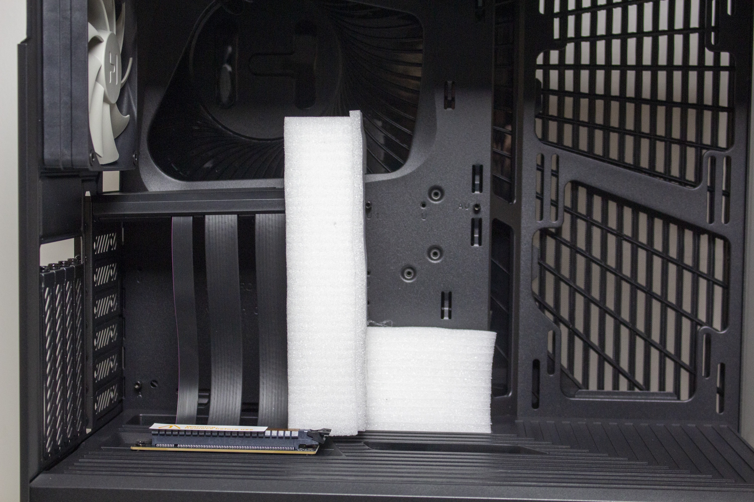 Das Zubehör hat HYTE in einer braunen Box aus Pappe unterhalb der Netzteilabdeckung versteckt. Neben allen Schrauben, die zur Montage der Komponenten notwendig werden, beinhaltet diese auch eine Montageanleitung mit Bild und Text sowie einem Splitter für den kombinierten Kopfhörer- bzw. Mikrofonanschluss. Eine sehr hochwertige Riserkarte (PCI 4.0 x16) ist ebenfalls Teil des Lieferumfangs und wurde von HYTE vorinstalliert und durch weichen Schaumstoff vor Beschädigungen geschützt. Zuletzt gehören noch zwei vorinstallierte 120-mm-Lüfter zum Lieferumfang.