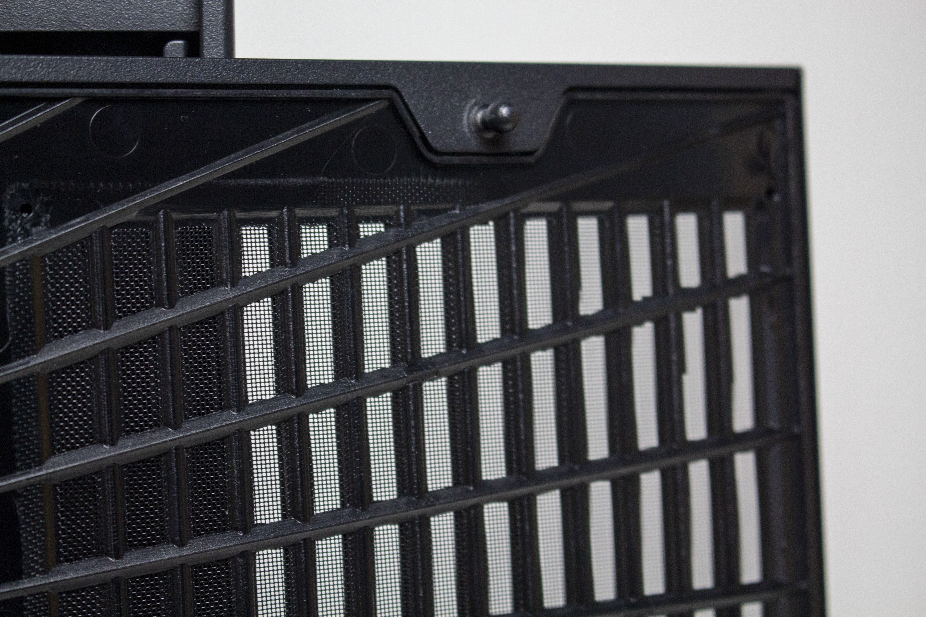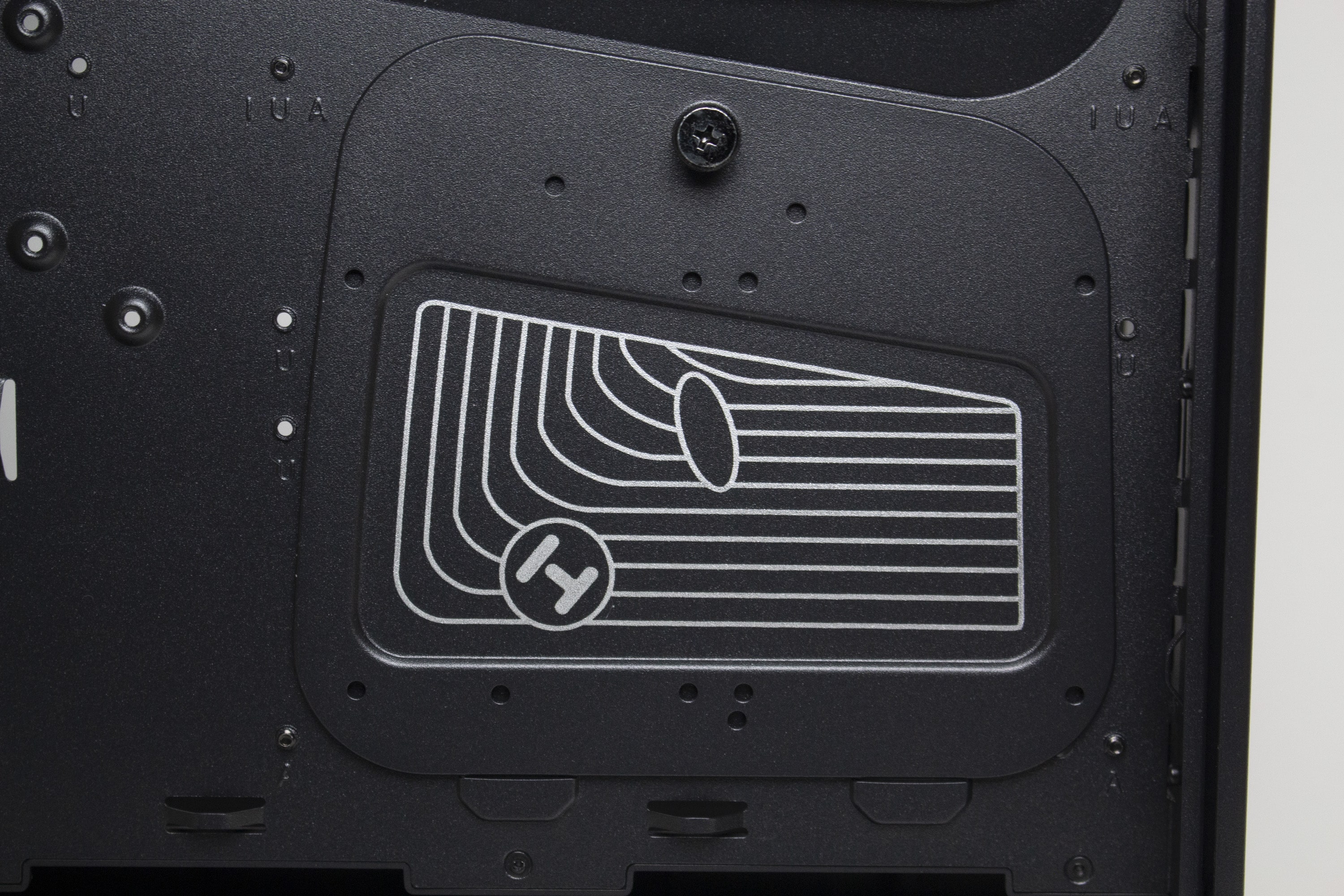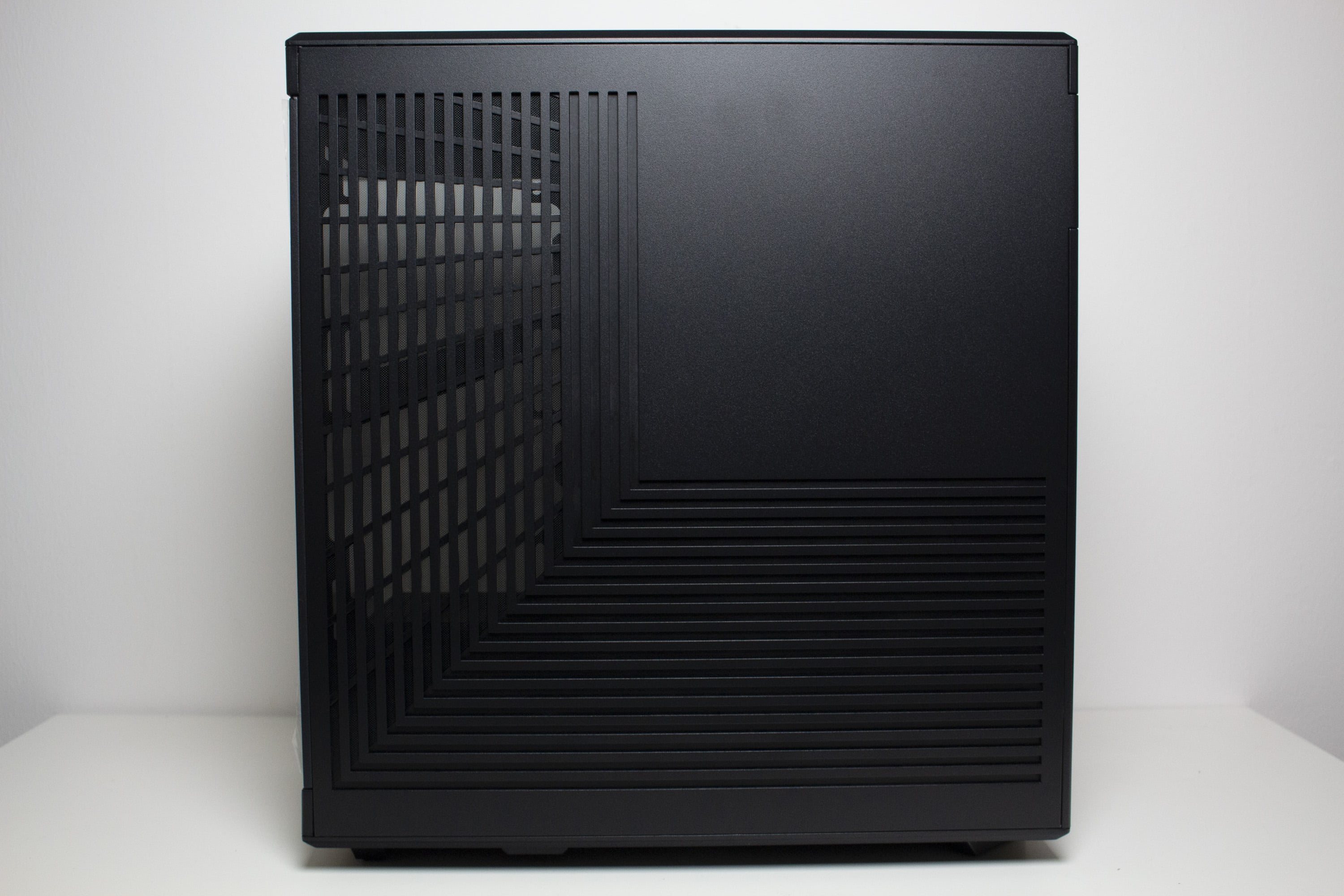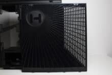Die linke Gehäuseseite besteht aus leicht abgedunkeltem Tempered Glass und wird über Push-Pins befestigt. Zur Demontage muss man also einfach etwas kräftiger im hinteren Bereich des Panels ziehen und kann es dadurch abnehmen. Das rechte Sidepanel des Y40 besteht aus herkömmlichen Stahl und verfügt über ein großes Lüftergitter, welches durch einen nicht modularen Staubfilter geschützt ist. Um einen netten optischen Effekt zu erzielen, werden die länglichen Belüftungsöffnungen des Deckels am rechten Seitenteil weitergeführt, wechseln in einem 90-Grad-Winkel die Richtung und enden am Heck des Midi-Towers. Außerdem hat HYTE auf die Innenseite des Panels ein Paneel aus Kunststoff geklebt, in welches das Herstellerlogo gepresst wurde.