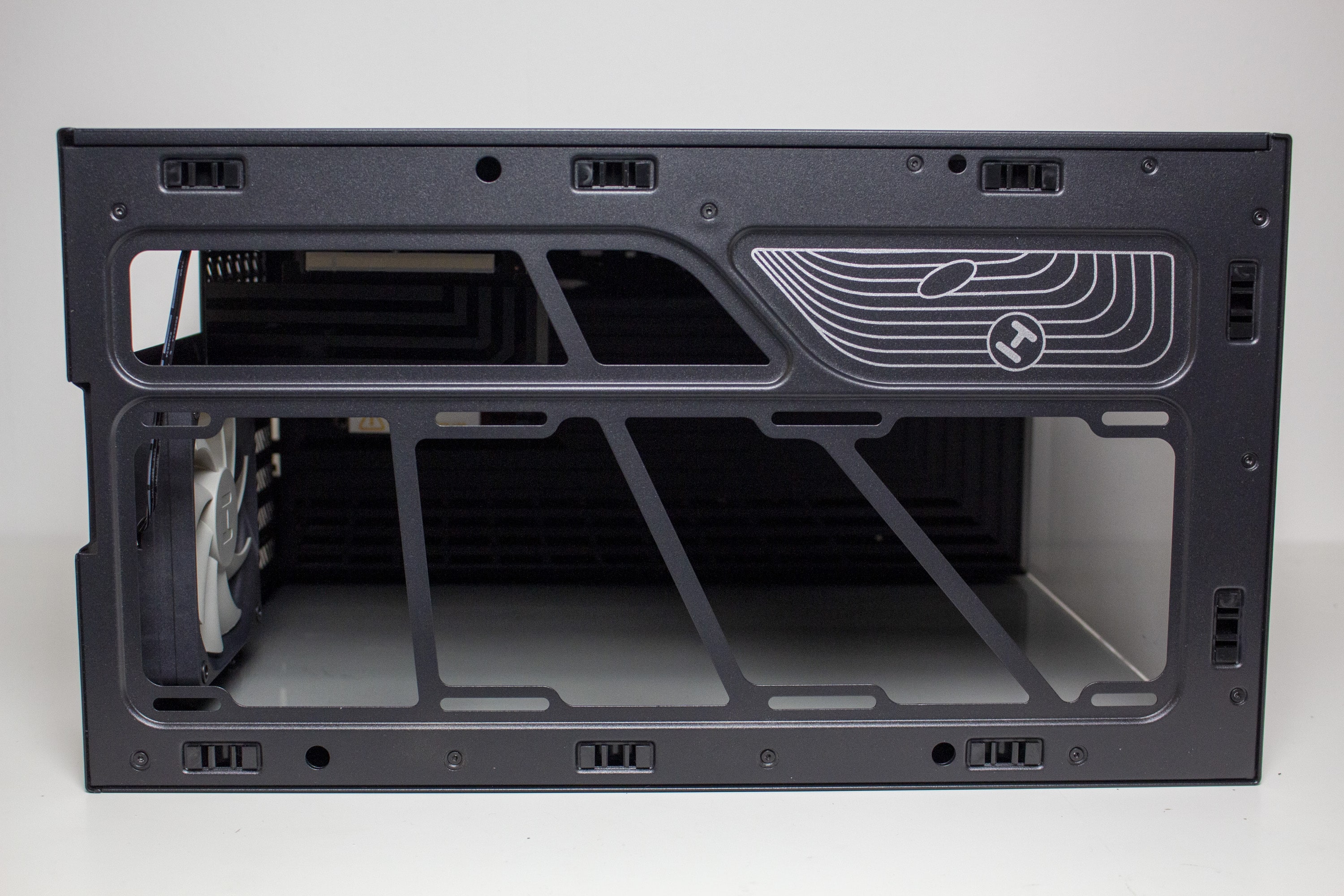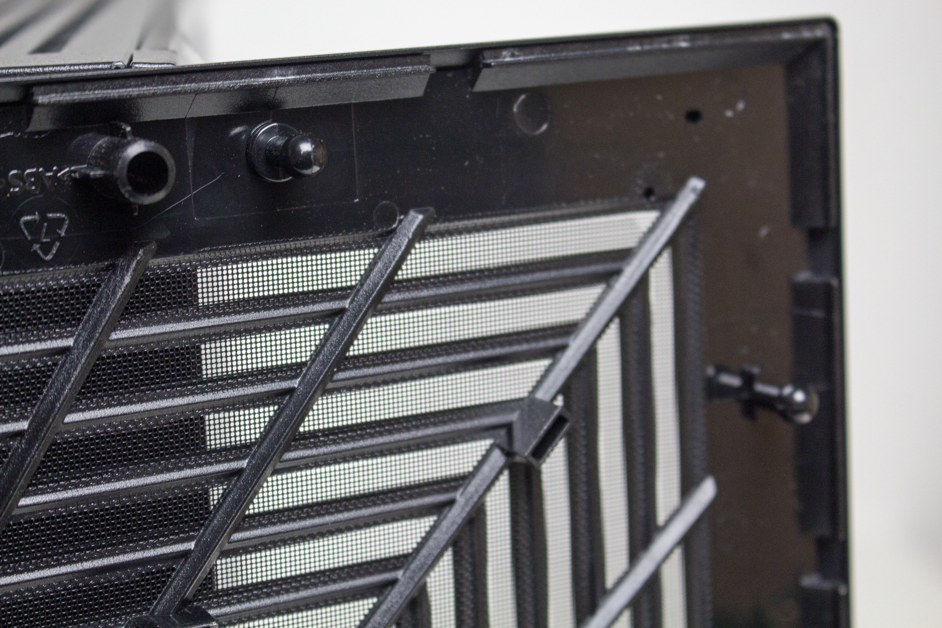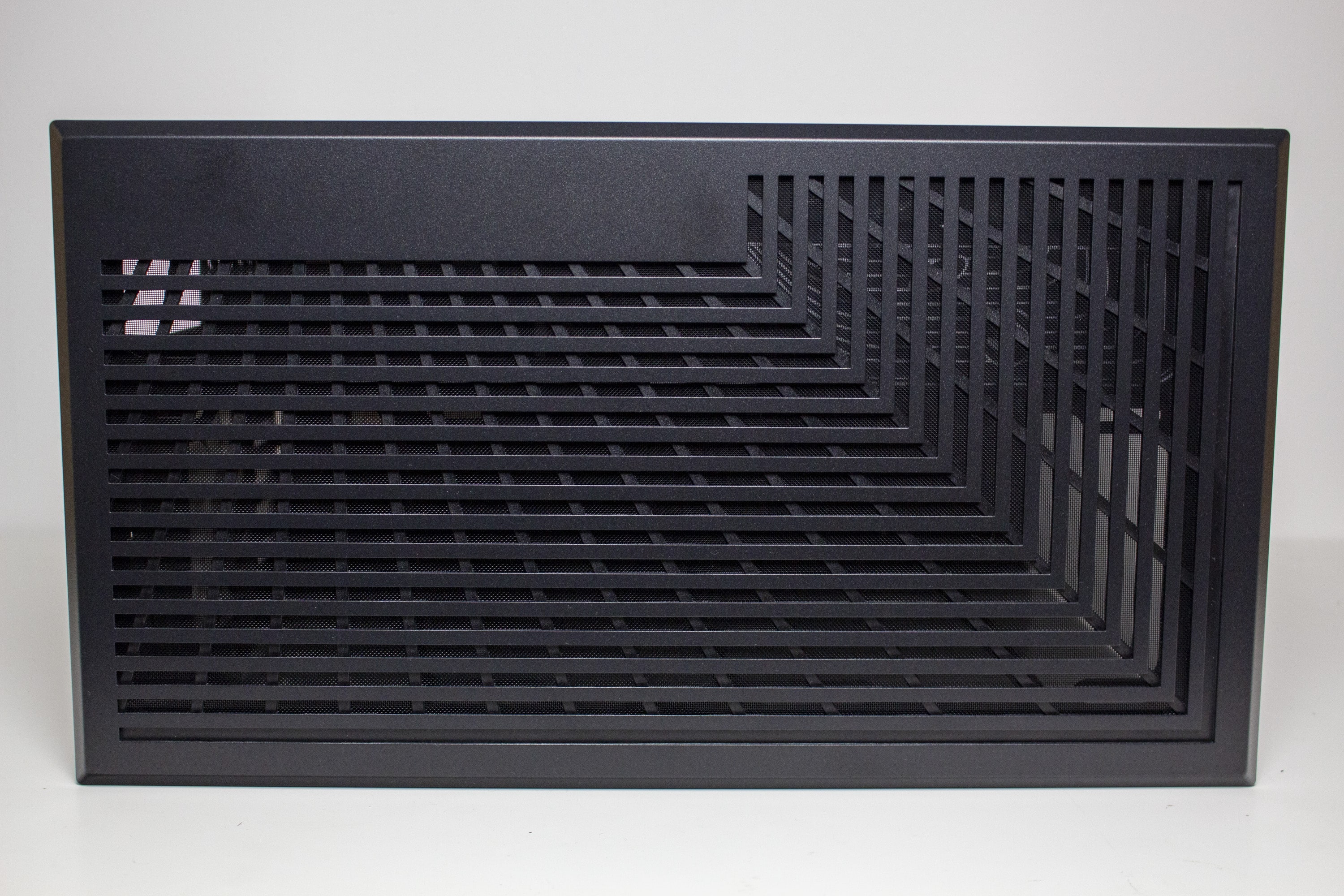 Die linke Gehäuseseite besteht aus leicht abgedunkeltem Tempered Glass und wird über Push-Pins befestigt. Zur Demontage muss man also einfach etwas kräftiger im hinteren Bereich des Panels ziehen und kann es dadurch abnehmen. Das rechte Sidepanel des Y40 besteht aus herkömmlichen Stahl und verfügt über ein großes Lüftergitter, welches durch einen nicht modularen Staubfilter geschützt ist. Um einen netten optischen Effekt zu erzielen, werden die länglichen Belüftungsöffnungen des Deckels am rechten Seitenteil weitergeführt, wechseln in einem 90-Grad-Winkel die Richtung und enden am Heck des Midi-Towers. Außerdem hat HYTE auf die Innenseite des Panels ein Paneel aus Kunststoff geklebt, in welches das Herstellerlogo gepresst wurde.