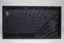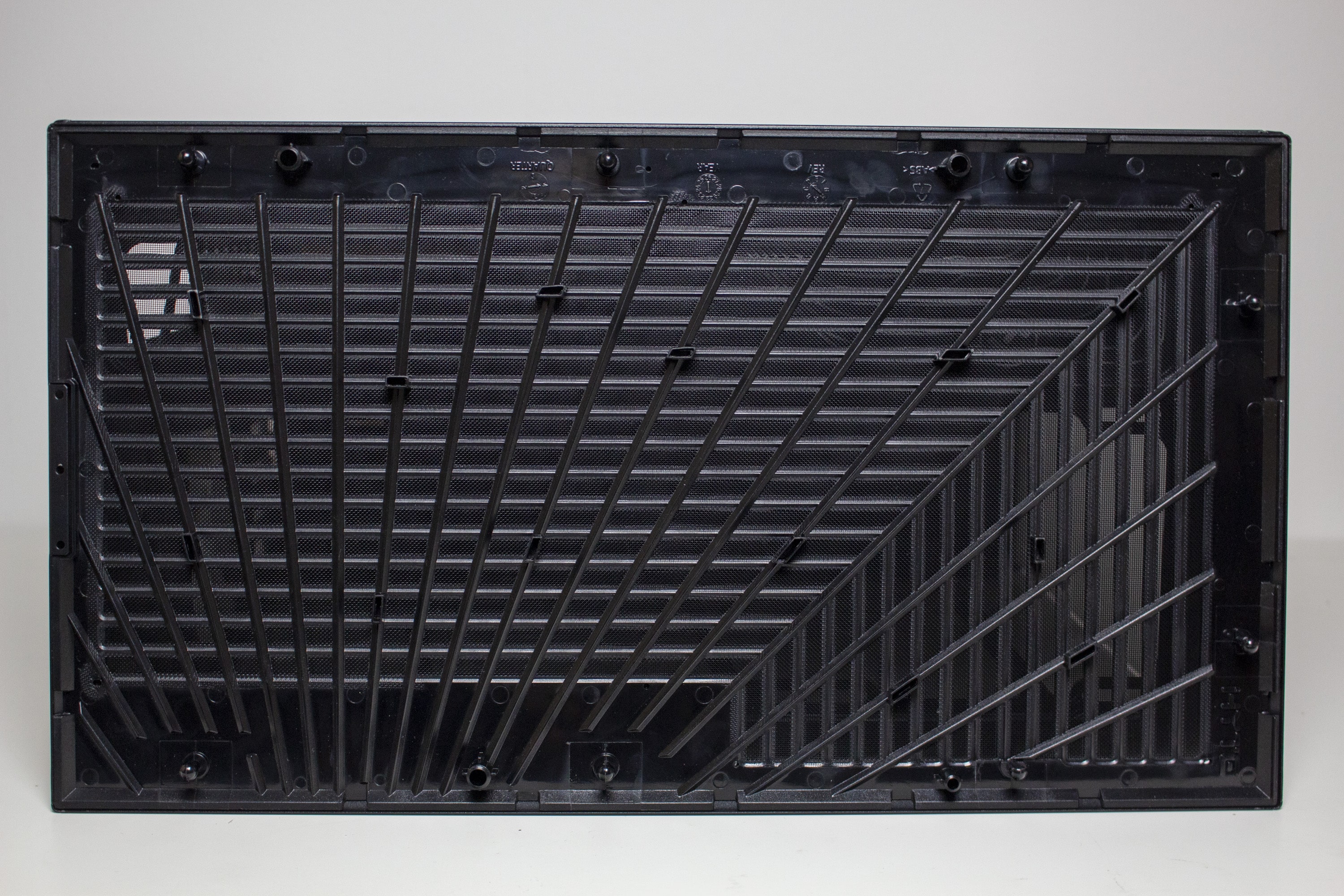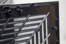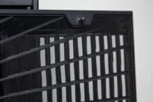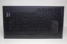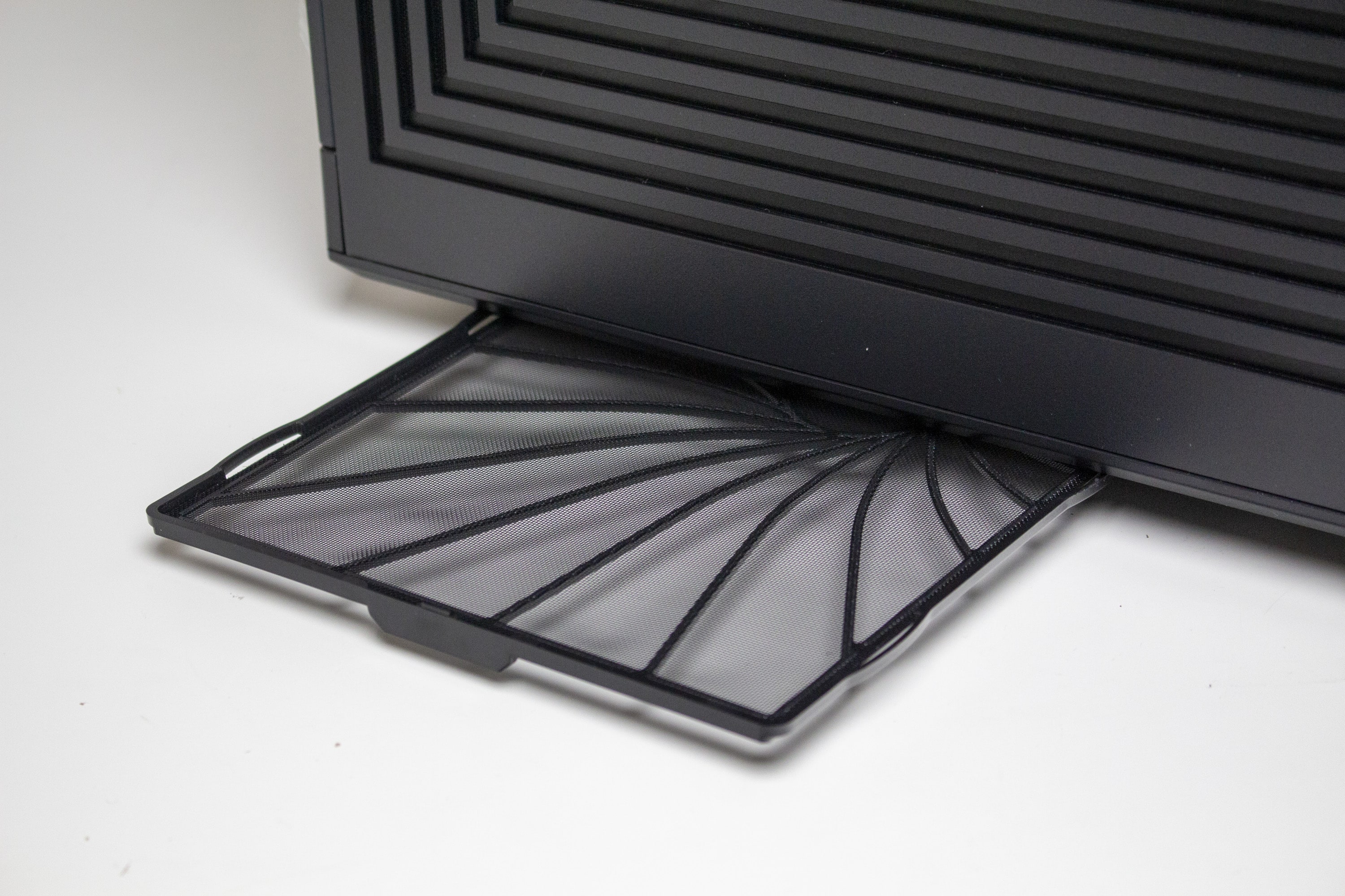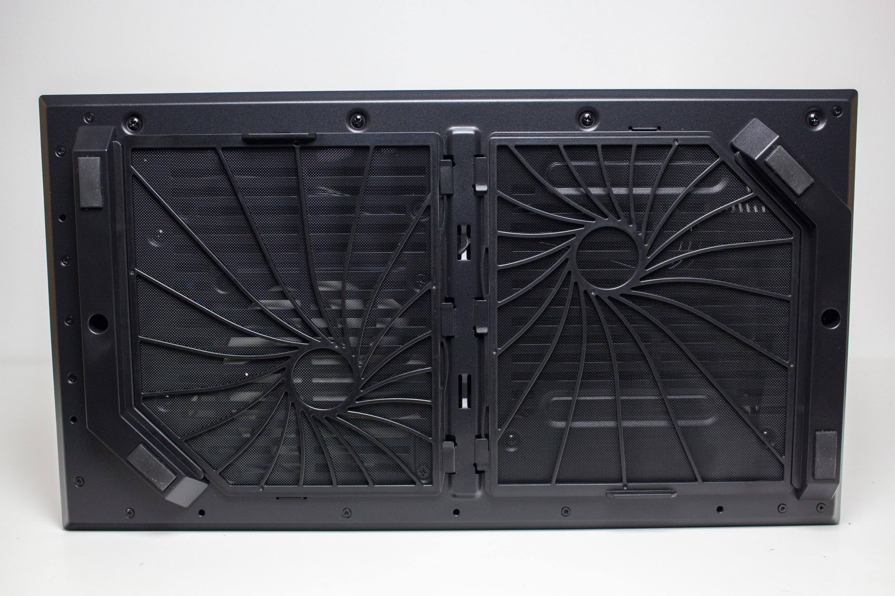 An der Unterseite geht es mit einer besonderen Gestaltung der Staubfilter weiter. Diese bestehen aus einem sehr feinen Gewebe, welches auf einen Rahmen gespannt wurde. Anders als die geraden Linien im Deckel, wurden die zwei Kunststoffgitter in Form einer Spirale gestaltet. Etwas seltsam ist aber, dass die Staubfilter in unterschiedliche Richtungen entfernt werden müssen. Letzteres könnte der Gestaltung der zwei großen Standfüße geschuldet sein. Denn auch diese sind nicht gerade sondern auf einer Seite geknickt. Als Materialien kommen Kunststoff und eine Schicht Gummi zur Vibrationsreduzierung zum Einsatz.