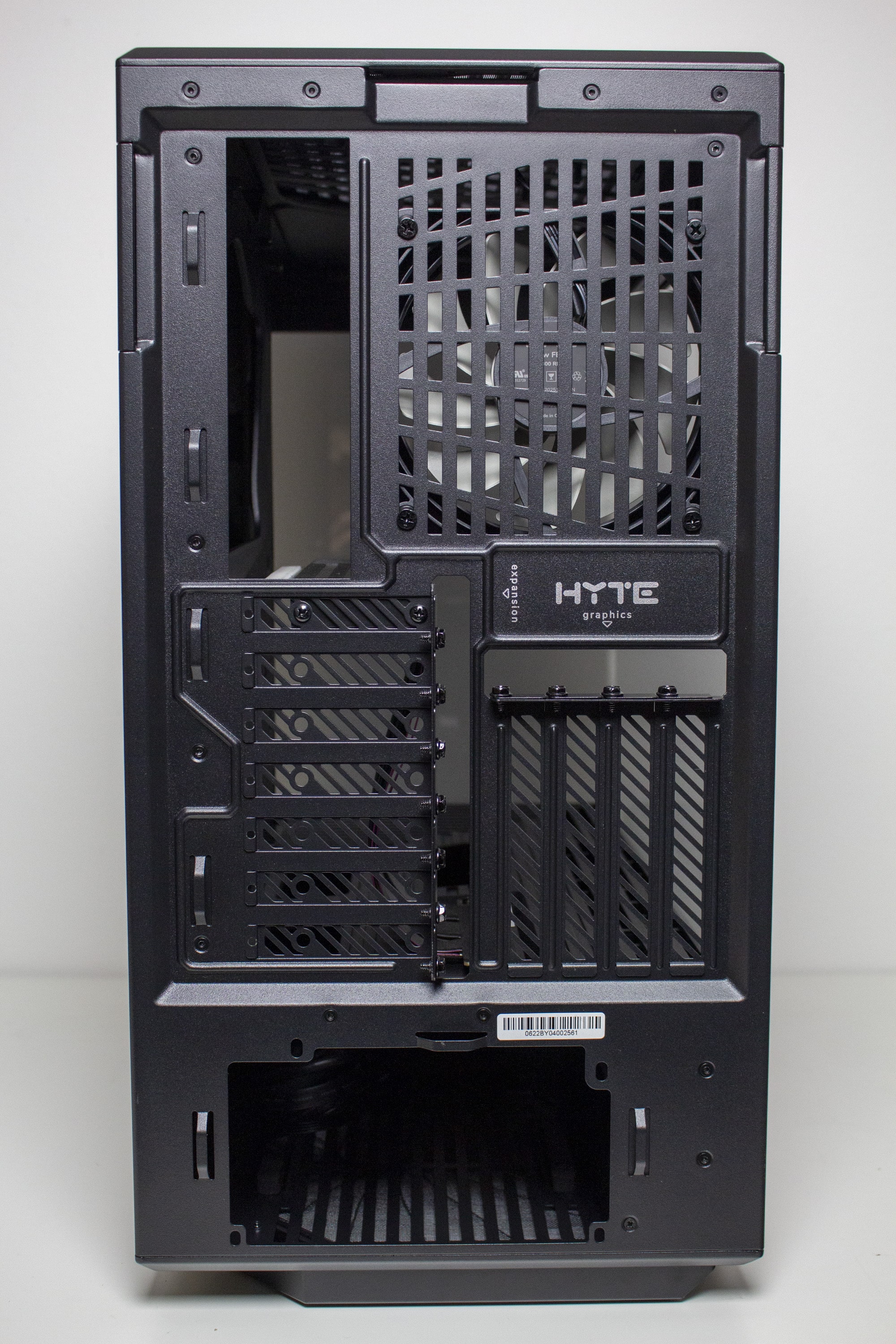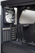 Die Rückseite des Y40 zeigt einen Aufbau, der von einem herkömmlichen Midi-Tower komplett abweicht. So verfügt das Gehäuse an der Rückseite nur über sechs horizontale PCI-Slotblenden, die zudem nur die halbe Höhe (Low Profile) haben. Dafür gibt es aber vier vertikale Slotblenden mit voller Höhe. Was nicht vom Standard abweicht, ist die Montageposition des Netzteils, welches unten verbaut wird. Oberhalb der Erweiterungslots findet man zudem den ersten vorinstallierten 120-mm-Gehäuselüfter.