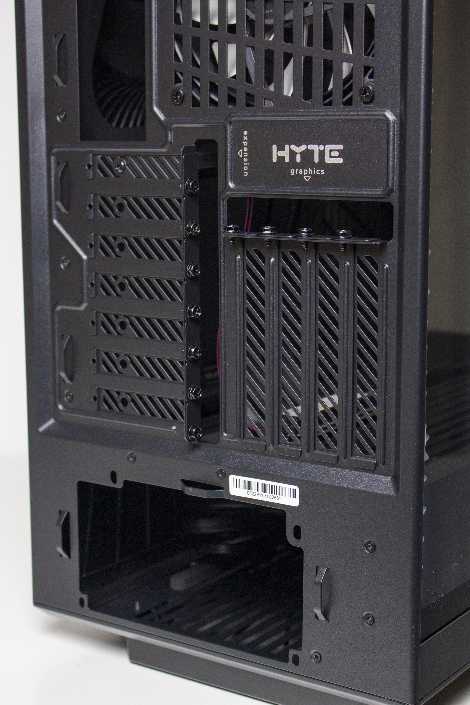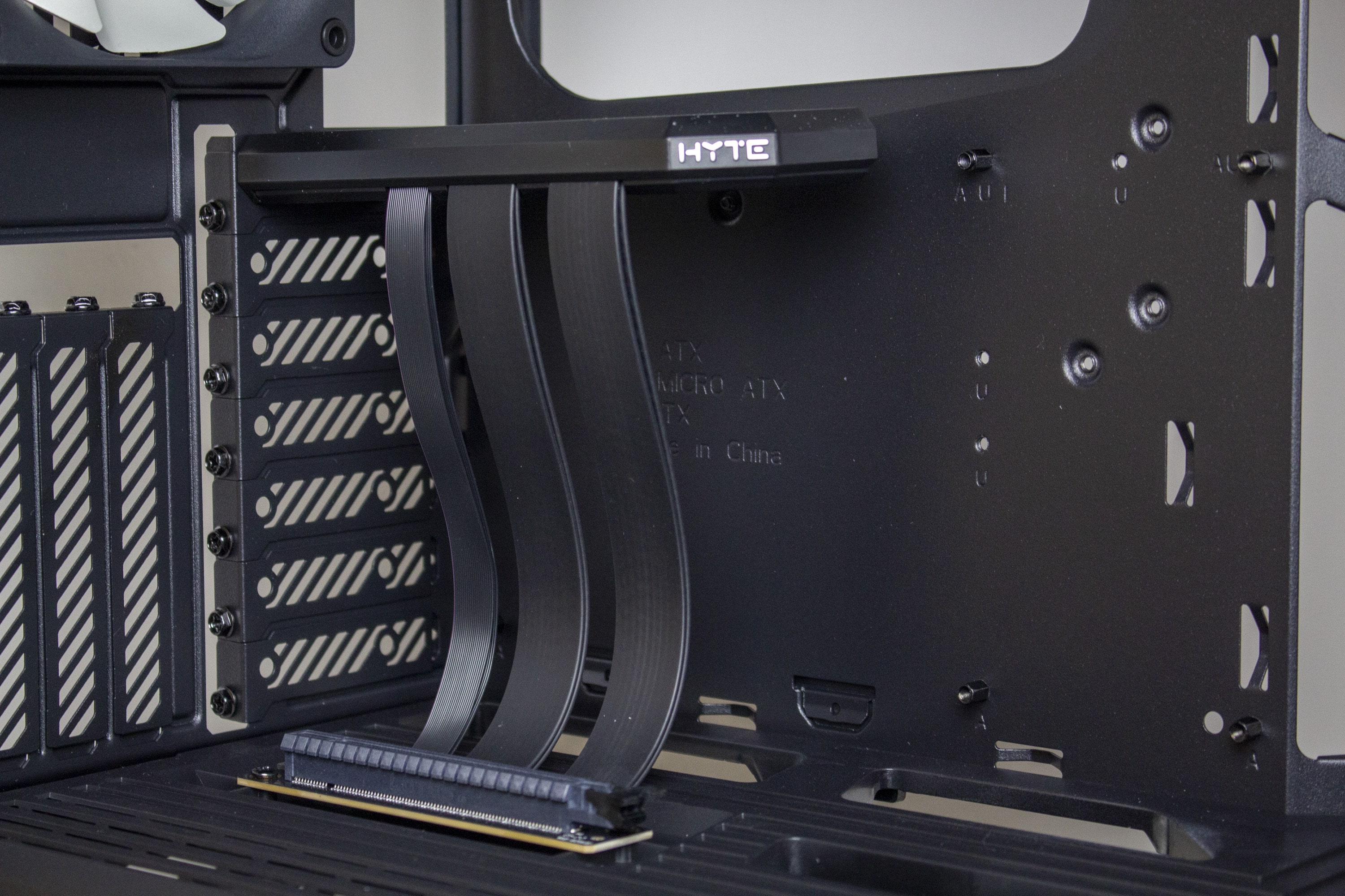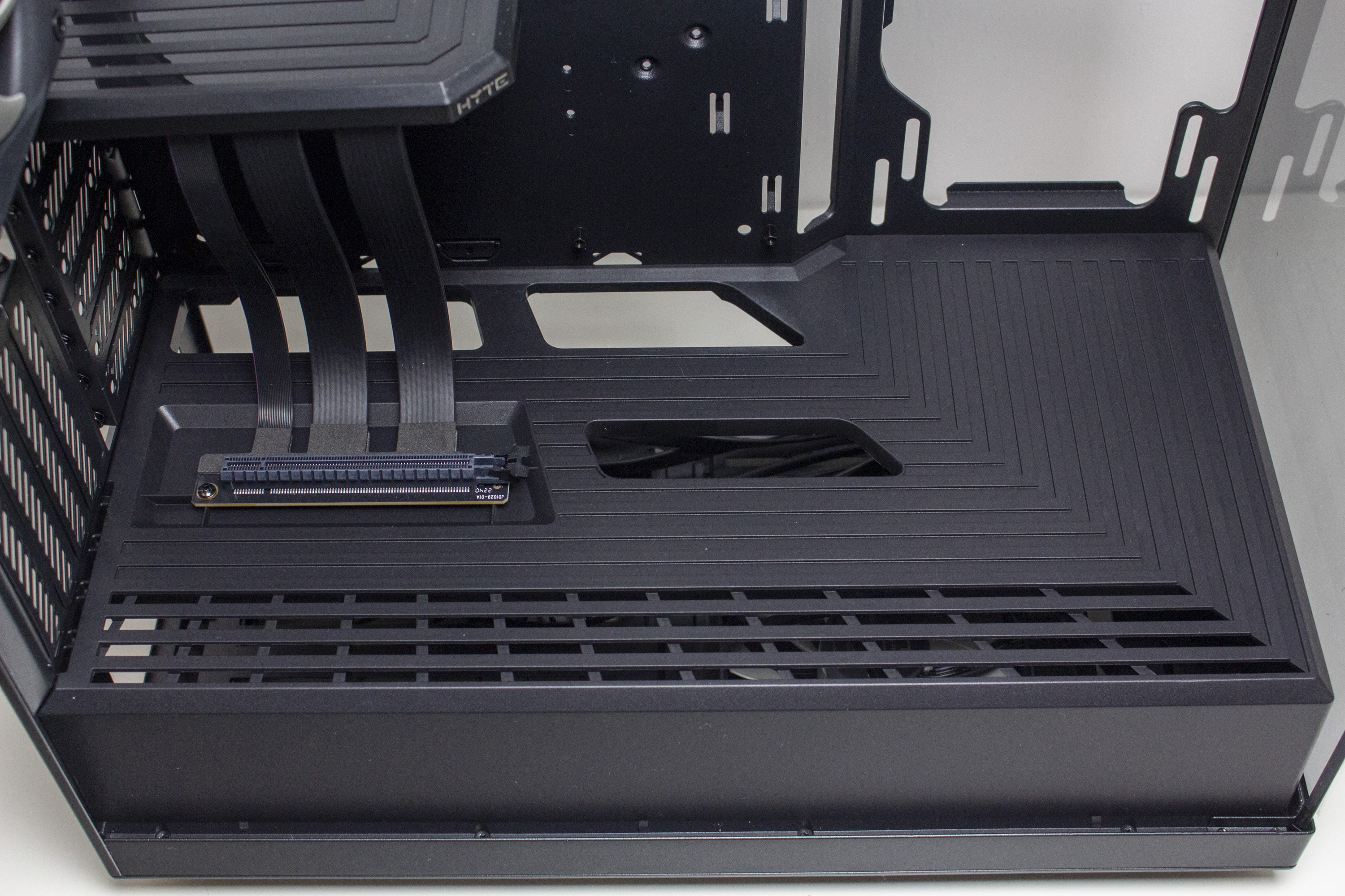 Senkt man den Blick, trifft man auf die Netzteilabdeckung, welche das Netzteil und dessen Kabel versteckt sowie als Montageplatz für die GPU-Riserkarte dient. Als Material kommt für die Abdeckung leider nur Kunststoff und kein Stahl zum Einsatz. Die Anmutung des Materials ist aber in Ordnung. Zuletzt hat HYTE die Oberseite der Abdeckung noch mit zahlreichen Öffnungen für Kabel sowie mit Belüftungsstreifen versehen.