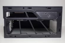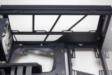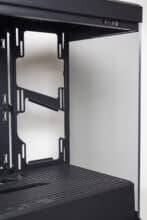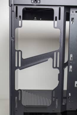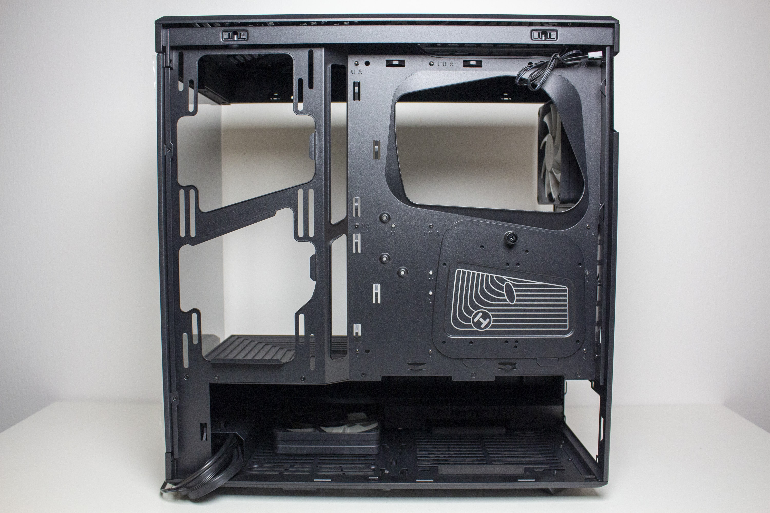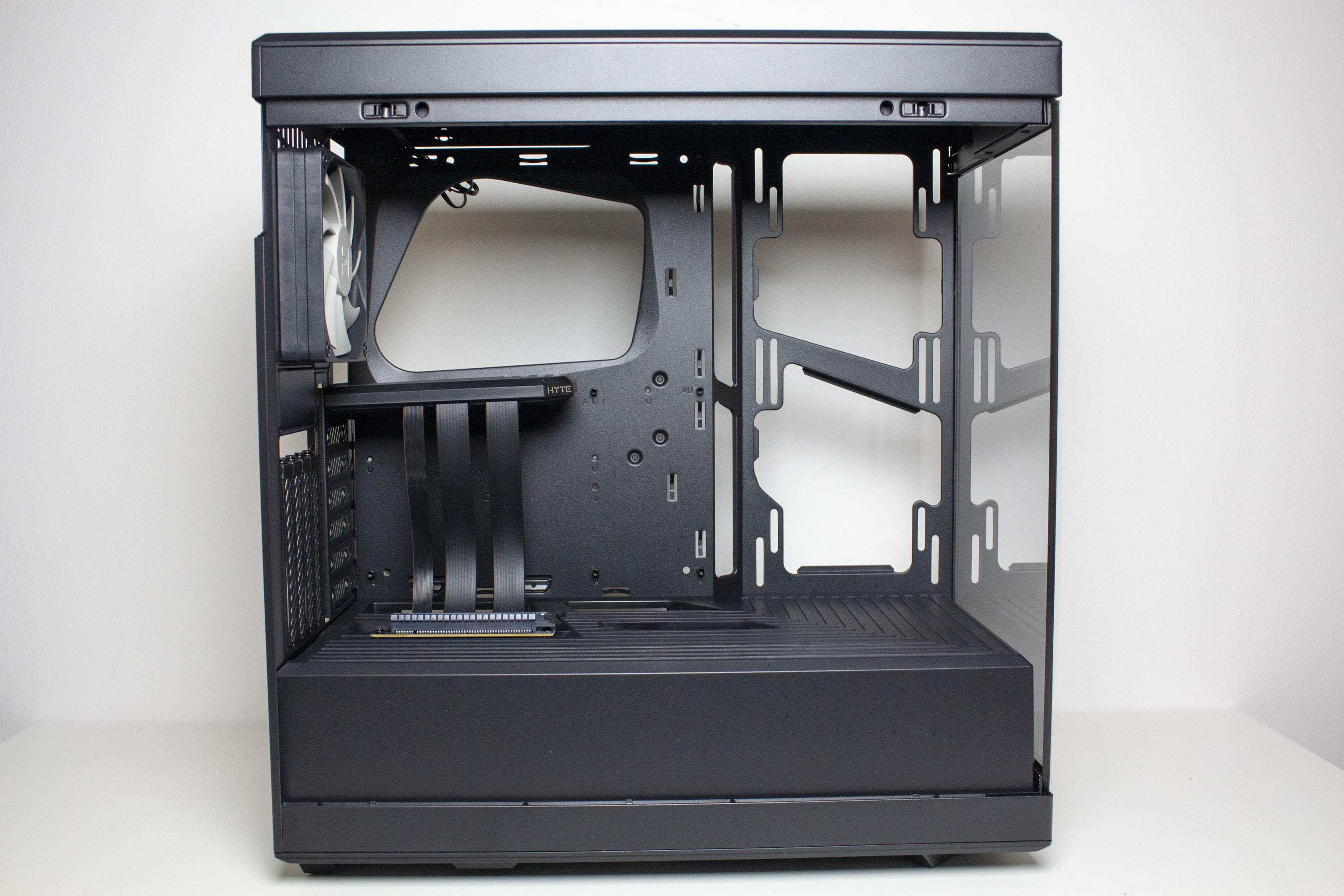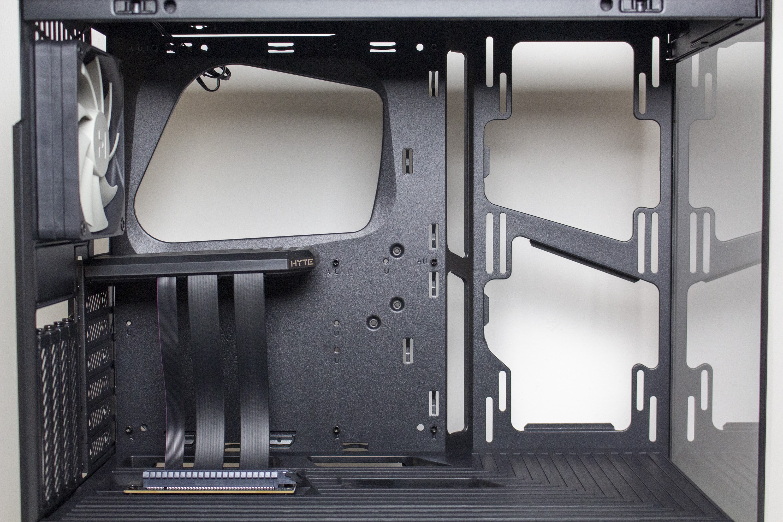 Anders als beim Y60 setzt HYTE beim Y40 auf einen typischen Aufbau des Innenraums. Dieser unterteilt sich in eine große Kammer für die Hauptkomponenten sowie eine abgetrennte Netzteilkammer im unteren Bereich. Das Mainboard-Tray wurde plan gestaltet und verfügt über drei große Öffnungen zur Verlegung der Netzteilkabel. Rechts neben dem Mainboardschlitten stattet HYTE das Y40 mit einem Montagerahmen für zwei 120- oder 140-mm-Lüfter bzw. entsprechende Radiatoren aus.