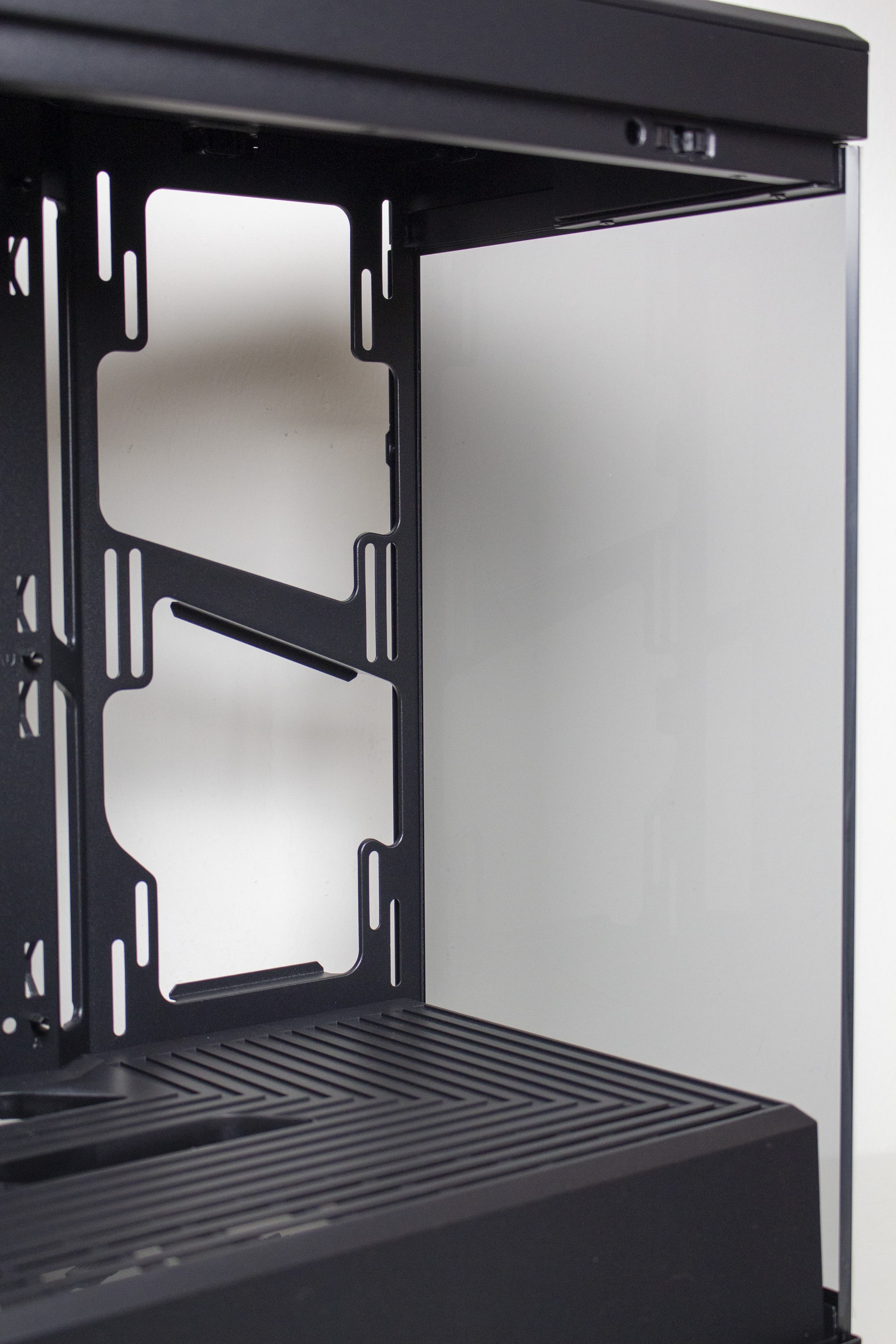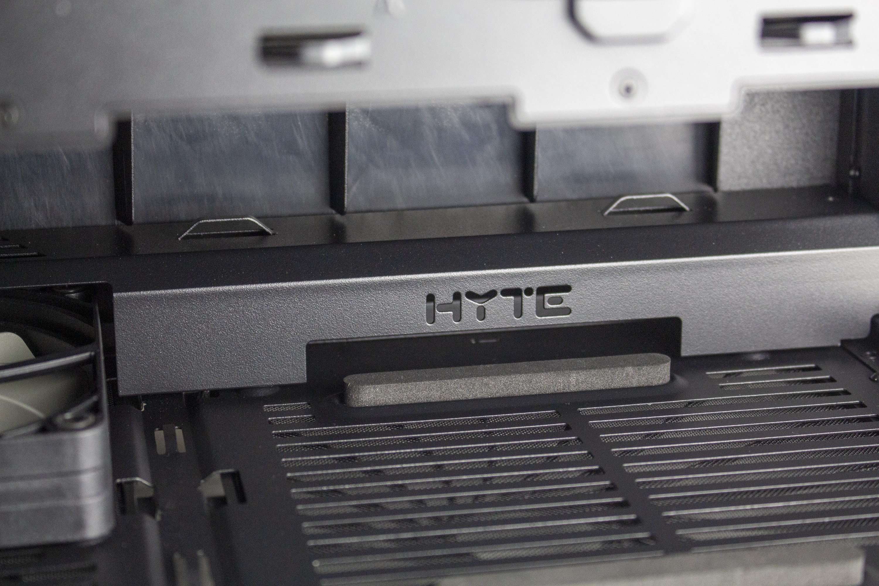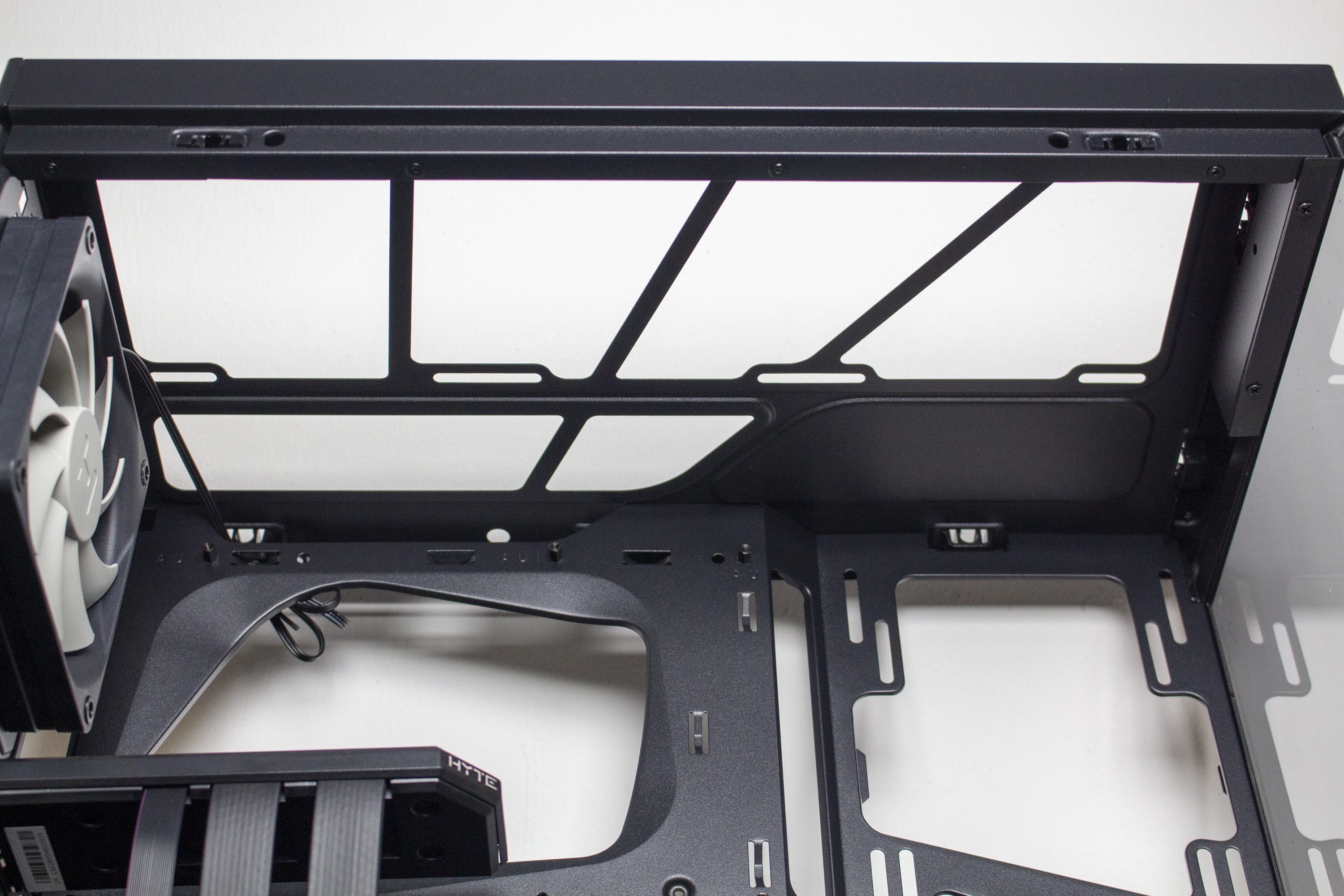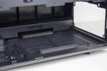Der Deckel besteht aus Stahl, welcher auf der Innenseite durch eine zusätzliche Schicht aus Kunststoff verstärkt und mit einem integrierten Staubfilterrahmen ausgestattet wurde. Durch die großen Belüftungstreifen sollte die warme Luft aus dem Inneren problemlos abgeführt werden können. Befestigt ist die Deckelplatte über Push-Pins und kann somit werkzeuglos entfernt werden. Unterhalb der Deckelplatte treffen wir auf den Korpus und diverse Montagepunkte für drei 120-mm- oder einen 360-mm-Radiator. Da letzterer die oberen Anschlüsse des Mainboards verdecken würde, spendiert HYTE dem Y40 zudem eine Öffnung über welchen die Mainboard-Anschlüsse erreicht werden können.