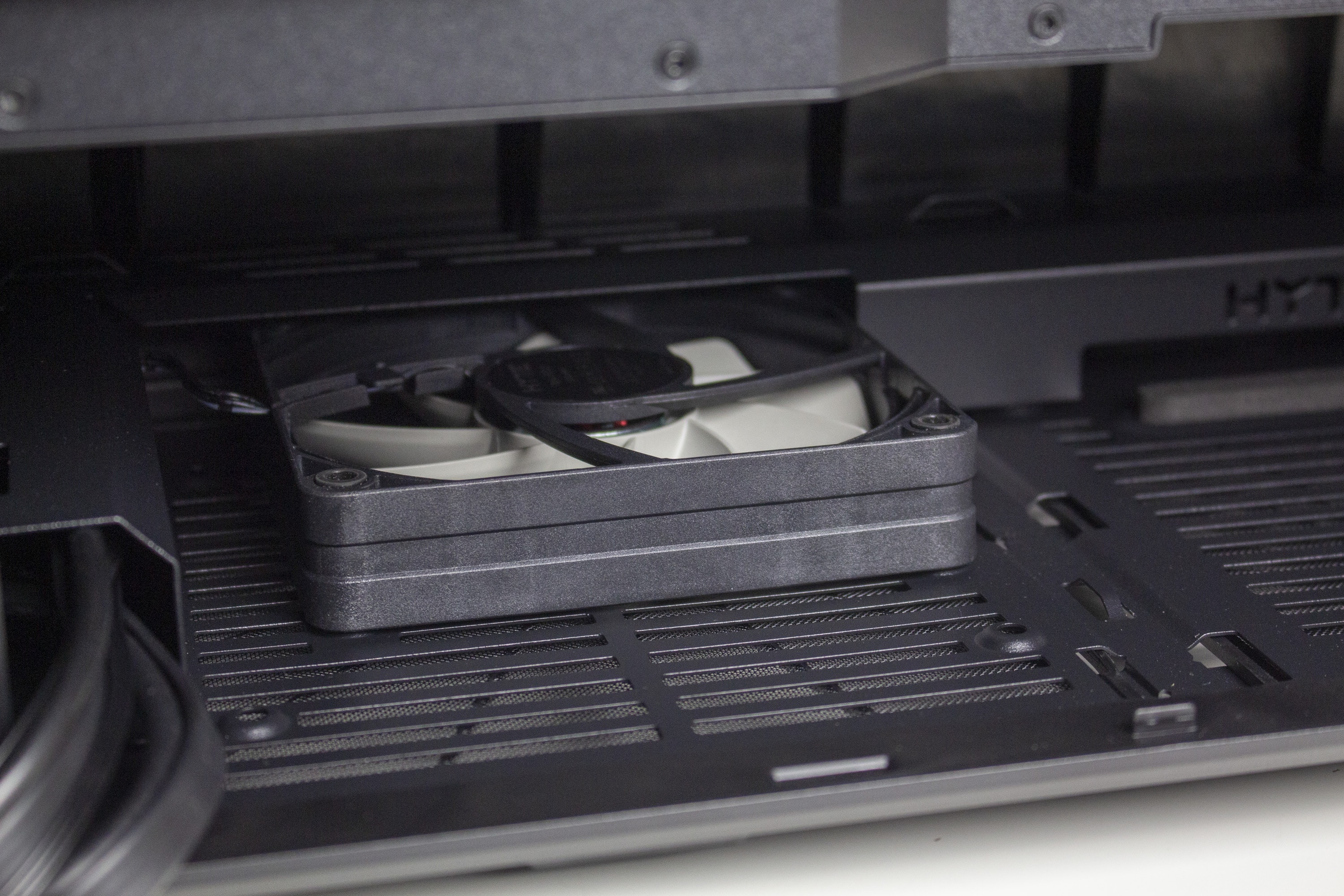Sollte die Wahl auf das HYTE Y40 fallen, dann empfehlen wir im Bereich neben dem Mainboard-Tray die zwei Montageplätze mit einsaugenden Lüftern zu besetzen. Der Lüfter im Boden schafft es durch die recht restriktive Gestaltung der Netzteilabdeckung höchstwahrscheinlich nicht, eine GPU mit höherer Leistungsaufnahme ausreichend zu kühlen.