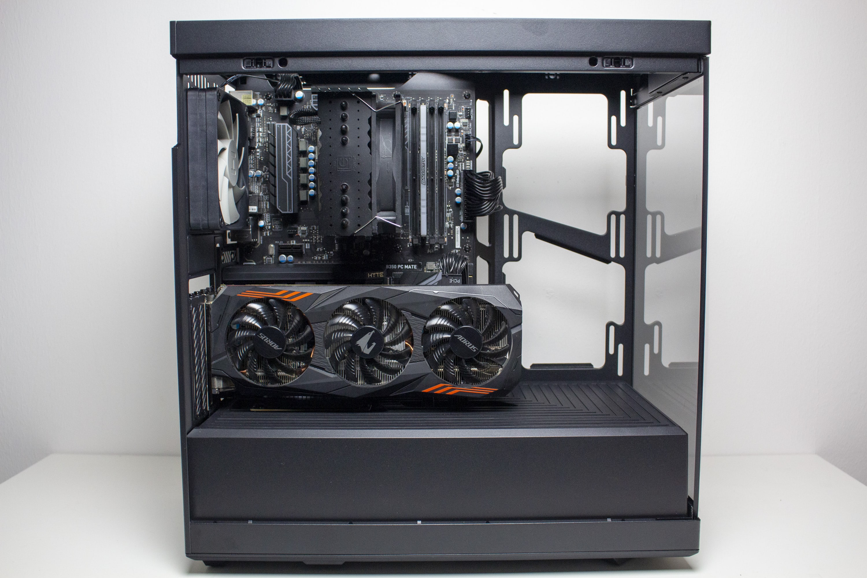 Nun kommen wir zum Systemeinbau beim HYTE Y40 Test. Als Hardware verwenden wir einen AMD Ryzen 5 1400 auf einem MSI B350 PC Mate mit 16GB Crucial Ballistix Sport LT grau DDR4-2666. Der Ryzen wird von einem LC-Power Cosmo Cool LC-CC-120-RGB gekühlt und ist auf 3,8 GHz (1,25 V) übertaktet. Für die Bildausgabe ist eine GTX 1060 6GB von Gigabyte AORUS zuständig. Die Stromversorgung erledigt das vollmodulare LC-Power LC550 V2.31 Platinum mit einem Effizienzgrad von 80 Plus Platinum.