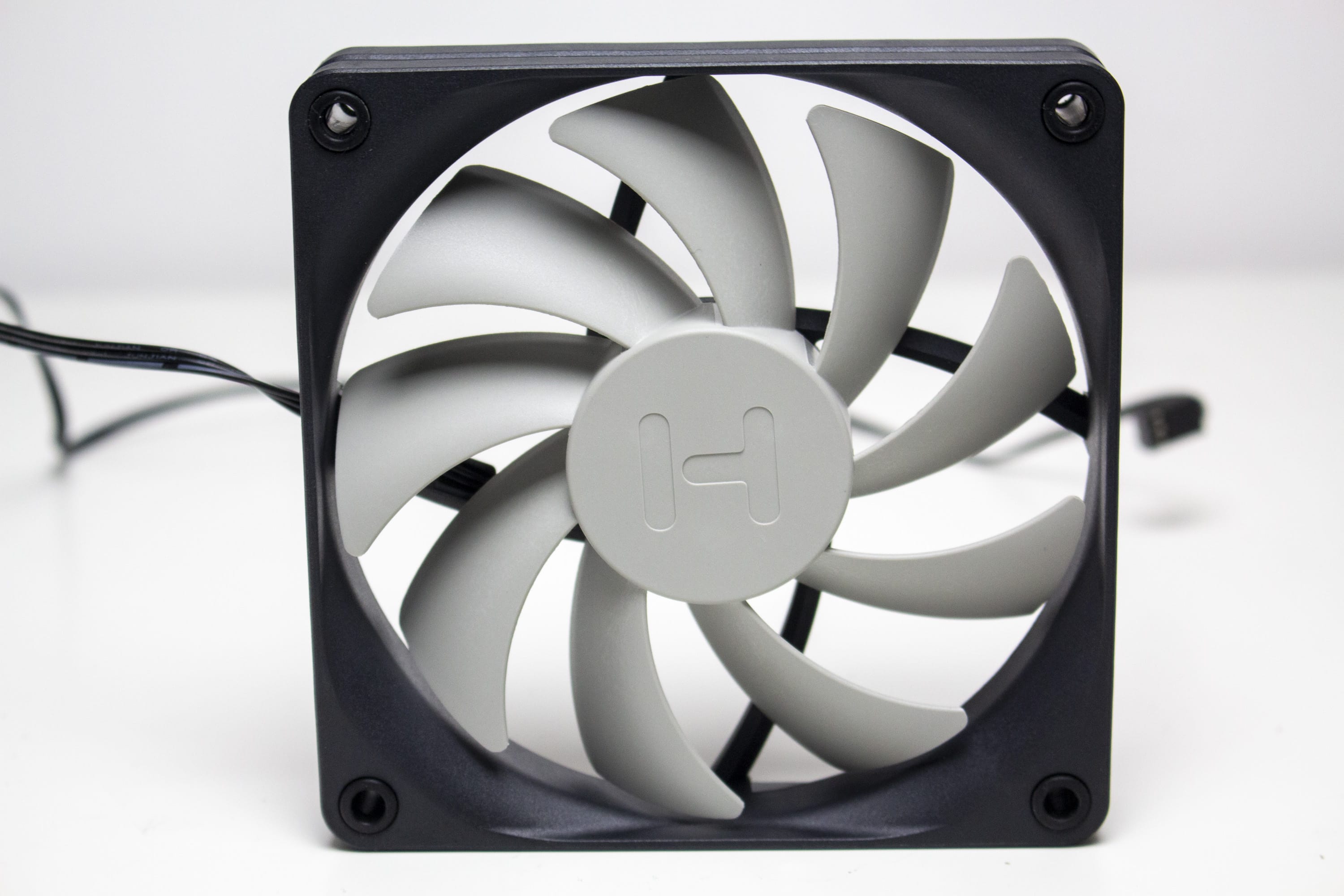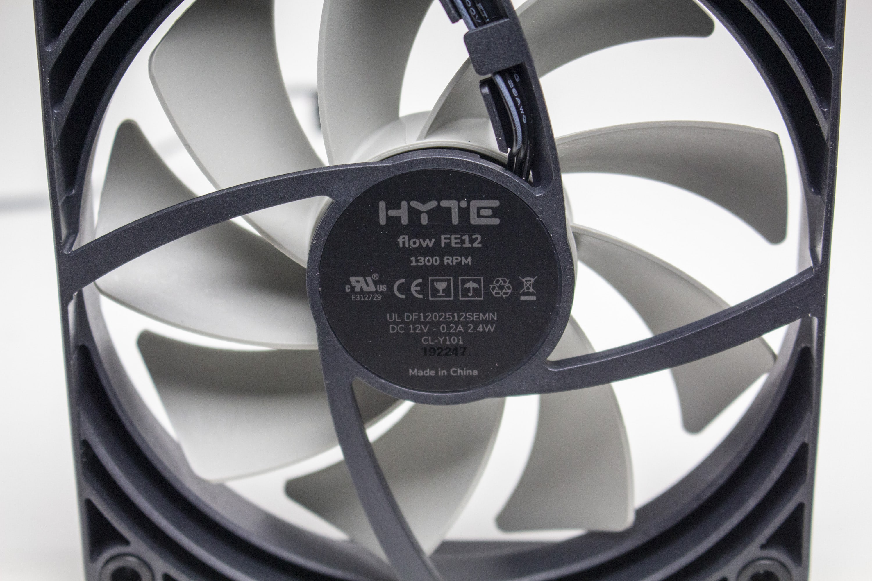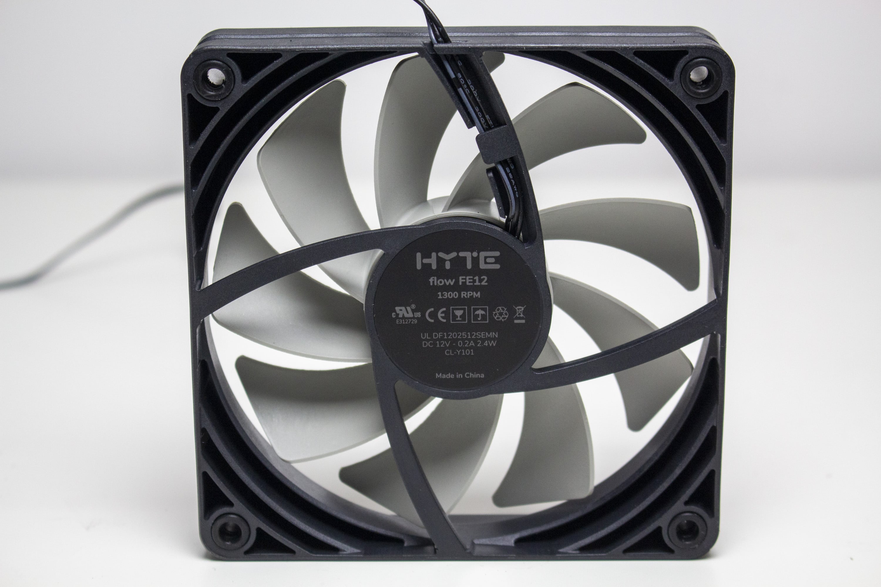 Ab Werk kommt das HYTE Y40 mit zwei vorinstallierten Gehäuselüftern im Boden sowie an der Rückseite. Beide Lüfter haben eine Rahmenbreite von 120 Millimetern und wurden schlicht gestaltet. Der Rahmen ist schwarz und der Rotor, mit seinen neun Lüfterblättern, ist grau gehalten. Die Maximaldrehzahl beider Lüfter wird vom Hersteller mit 1300 Umdrehungen pro Minute angeben. Der Anschluss am Mainboard erfolgt jeweils über ein schwarzes Kabel mit 3-Pin-Anschluss.