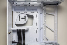 HYTE setzt, wie beim Y60, auf ein Zwei-Kammer-Layout, bei dem die Kammern durch das vertikale Mainboard-Tray getrennt werden. Die große Hauptkammer beherbergt dabei ein Mainboard bis zum EATX-Format, eine vertikal orientierte Grafikkarte sowie einen CPU-Luftkühler oder Radiatoren. Das Mainboard-Tray ist plan gestaltet und knickt an der rechten Seite nach hinten ab. In diesem Knick sowie ober- als auch unterhalb, lassen sich große und gummierte Kabelmanagementöffnungen im Mainboard-Tray erkennen.