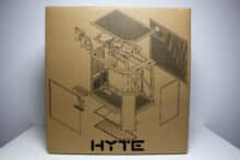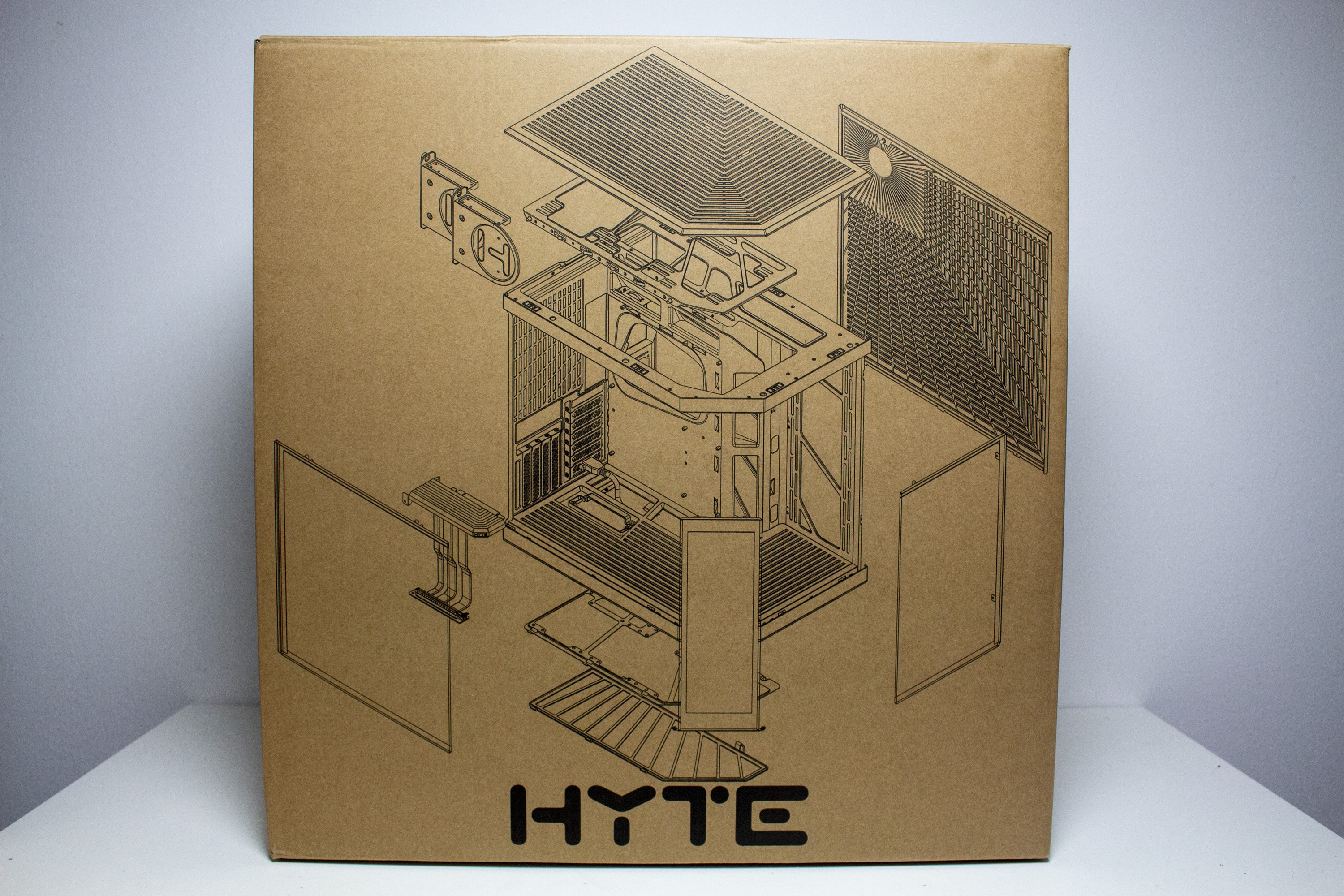 Trotz des recht hohen Preises verzichtet HYTE beim Y70 Touch auf eine aufwendig gestaltete Verpackung. Zum Einsatz kommt stattdessen ein schlichter brauner Karton, der mit schwarzer Farbe bedruckt wurde. Auf den zwei größeren Seiten der Verpackung lassen sich eine Explosionszeichnung sowie eine Nahaufnahme des Y70 Touch erkennen. Ein farbiger Aufkleber soll zudem die Display-Funktionalitäten des Gehäuses weiter hervorheben. Außerdem listet HYTE alle relevanten technischen Daten in Form einer übersichtlichen Tabelle auf.