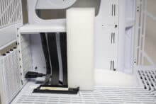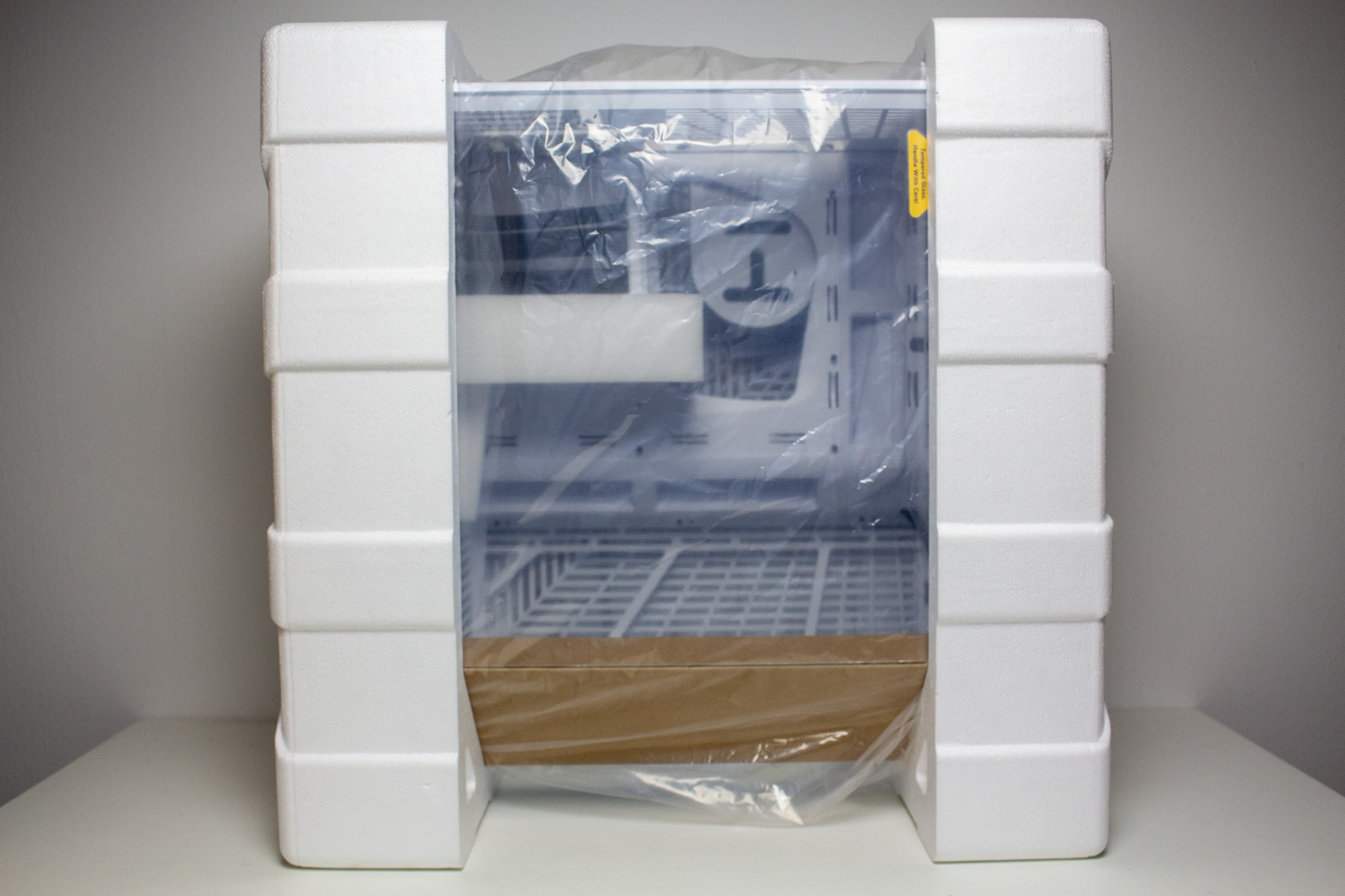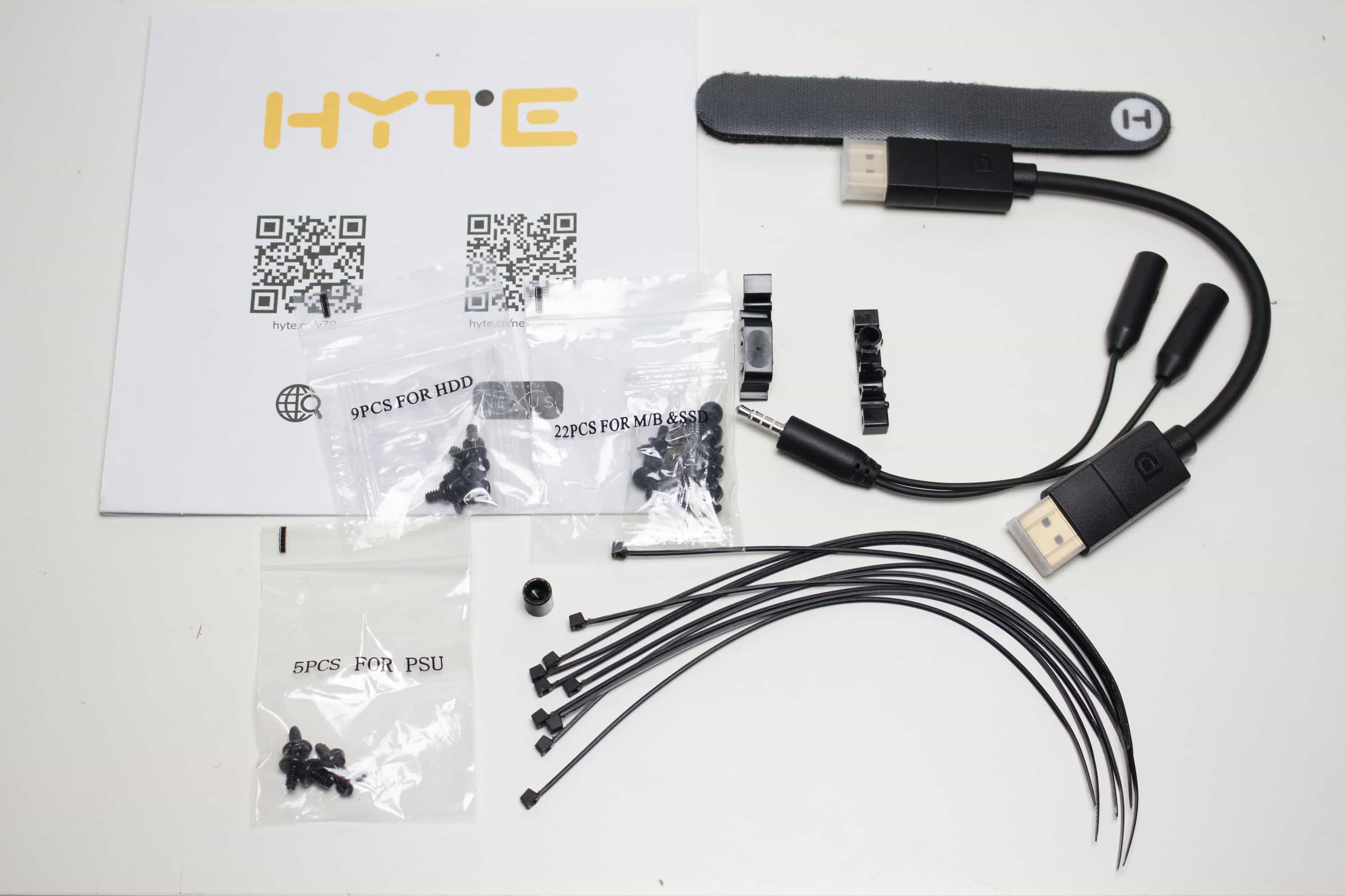 Innerhalb der Kartonage umhüllt der Hersteller das Gehäuse mit einer Kunststofffolie sowie mit zwei Blöcken aus hartem Styropor. Den Einsatz von dicken, flexiblen Schaumstoffelementen wäre aufgrund der Menge an Glas und des allgemeinen Gewichts natürlich noch besser gewesen. Das verbaute Display wurde zusätzlich mit einer Schicht aus Pappe abgedeckt. Das Montagezubehör platziert HYTE im Inneren des Y70 Touch innerhalb einer kleinen Schachtel. Diese beinhaltet alle Montageschrauben sowie eine Nuss zum Eindrehen der Abstandshalter, 10 schwarze Kabelbinder, 5 Kabelbinder mit Klettverschluss, eine Montageanleitung und zwei Kabelklemmen. Außerdem gehören zum Lieferumfang das vorinstallierte Display mit Touchscreen sowie ein Staubfilter für den Gehäuseboden. Vorinstallierte Lüfter gibt es beim HYTE Y70 Touch leider keine.