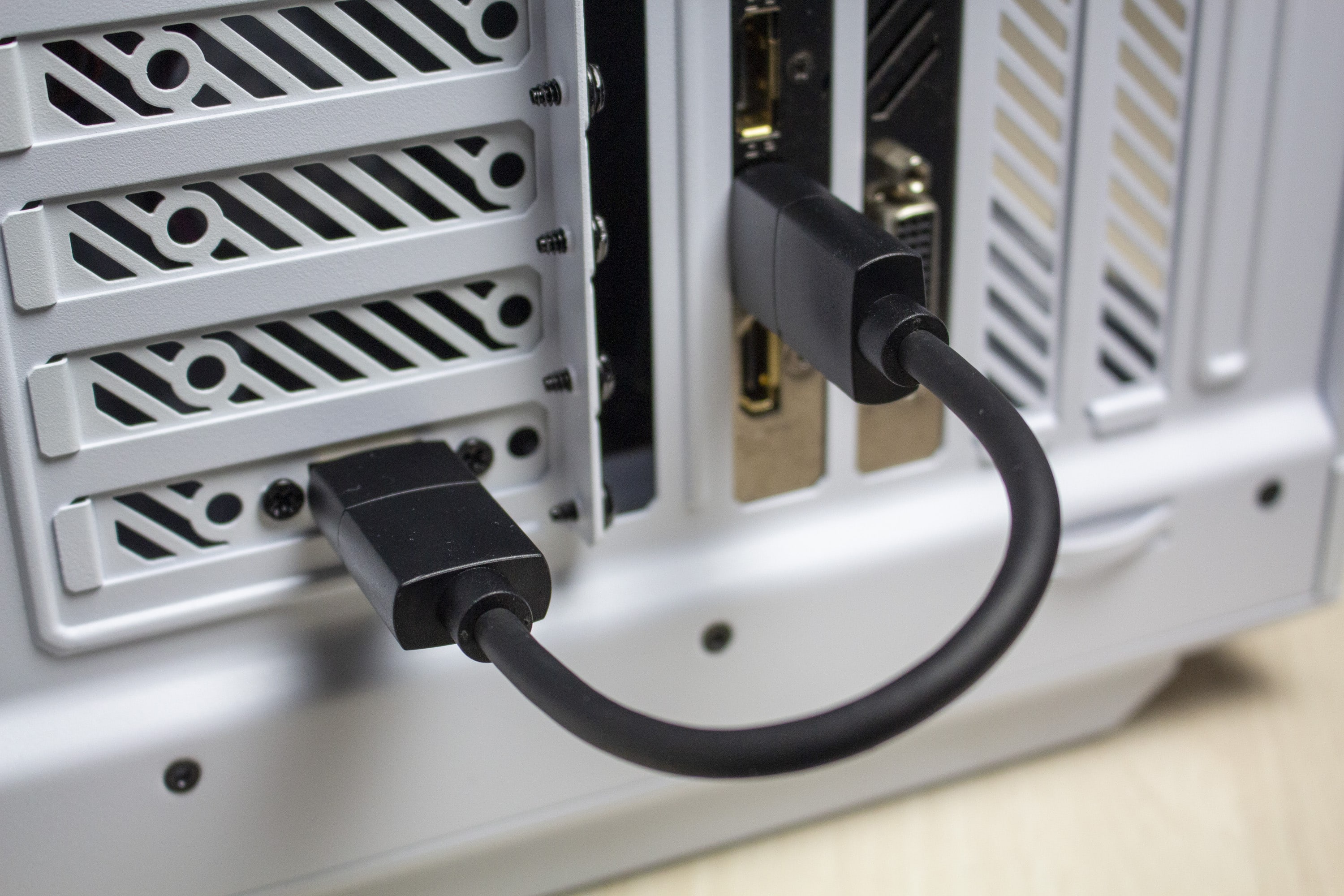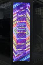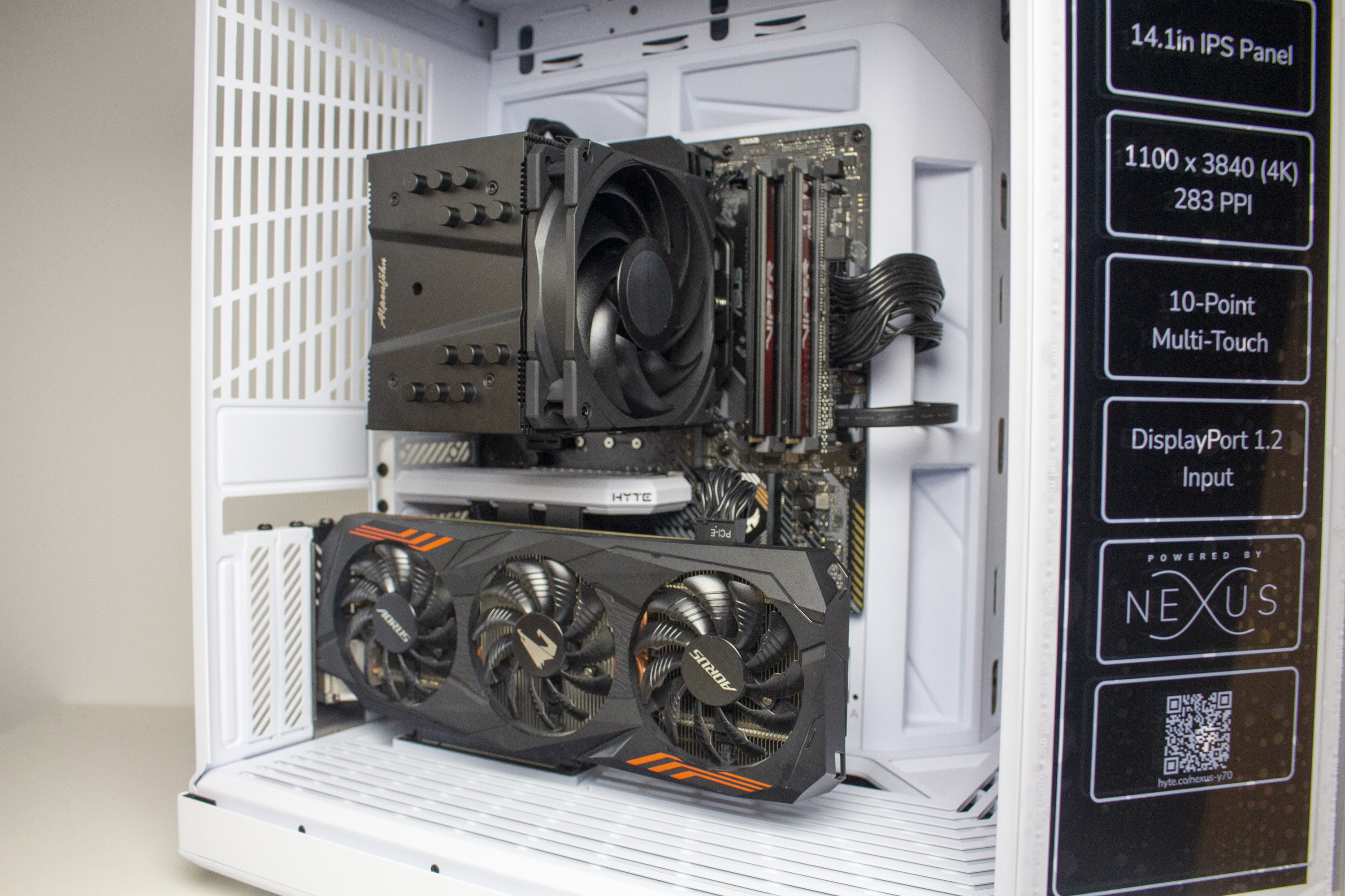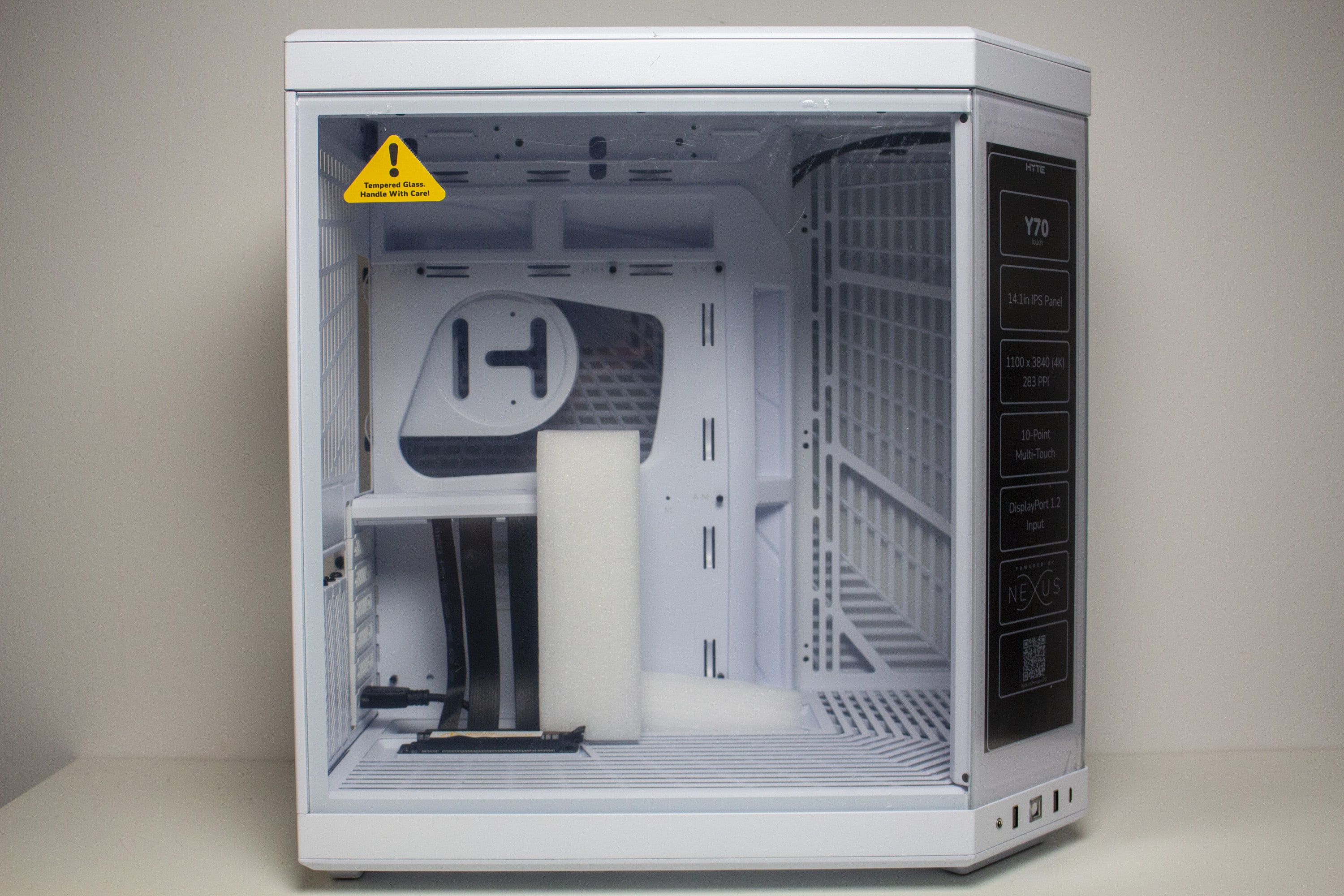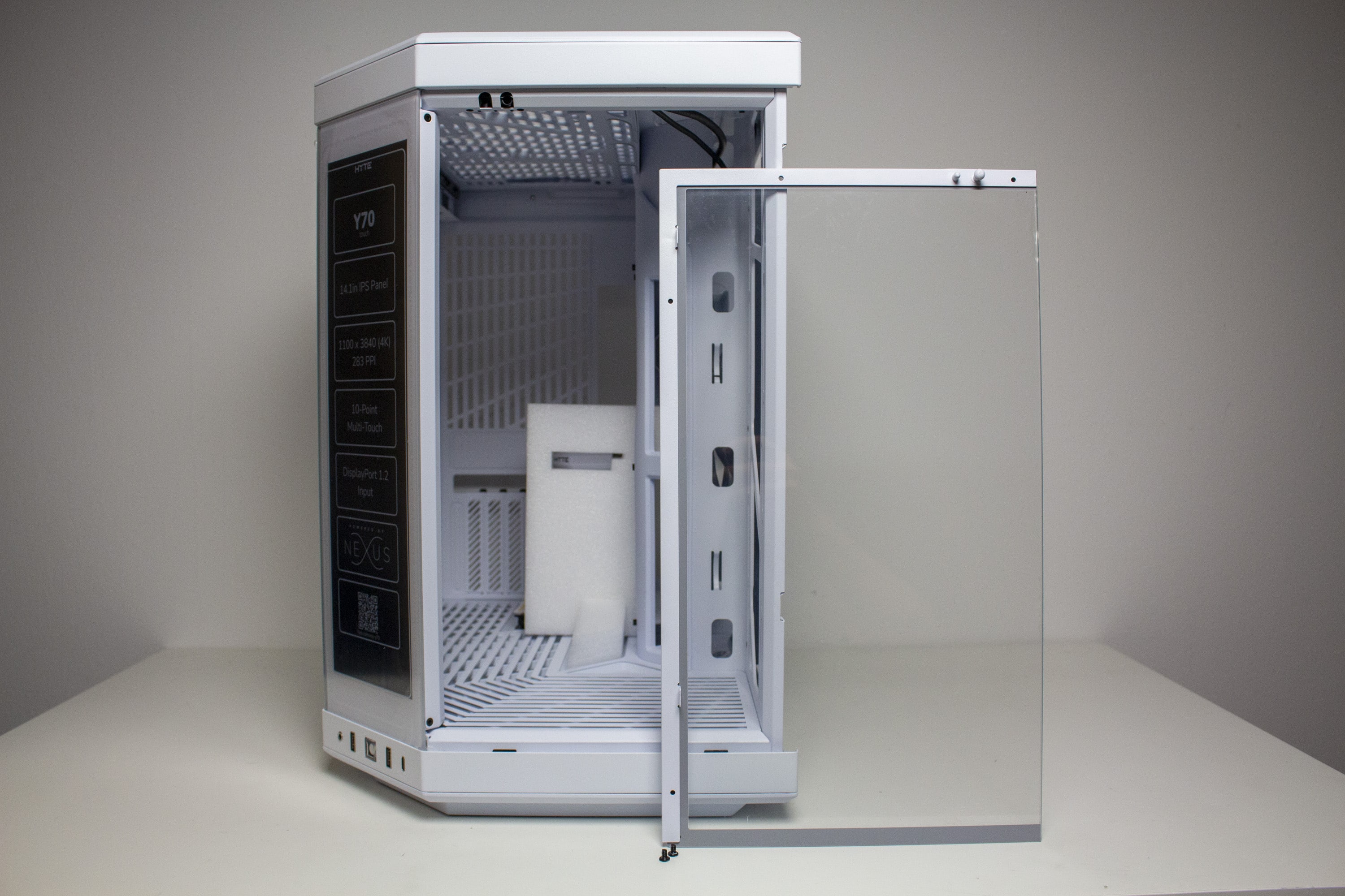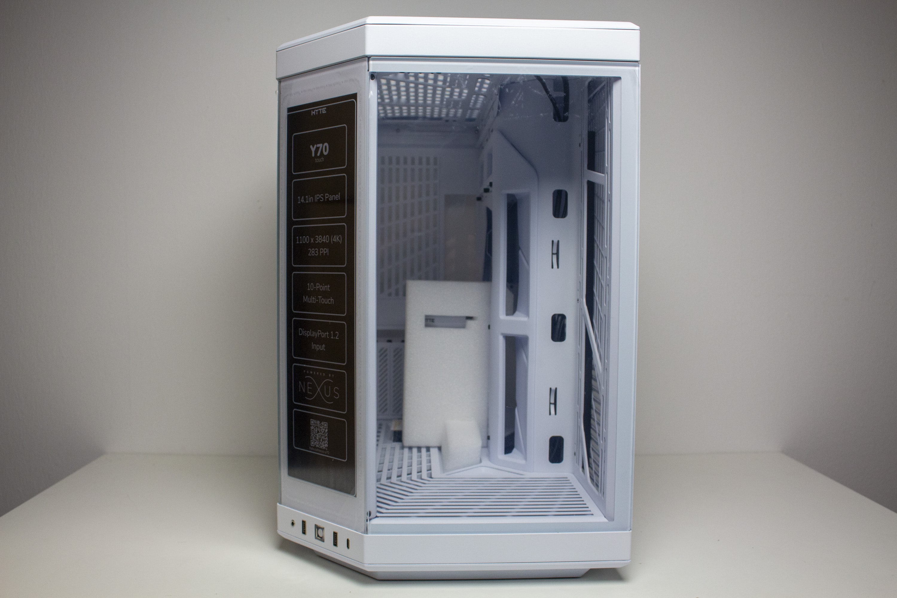 Ab Werk kommt das HYTE Y70 Touch mit einem 14,1-Zoll Display im Bereich der Front. Das Display hat eine Bildwiederholrate von 60 Hz sowie eine Auflösung von 1100 x 3840 Pixeln. Außerdem ist im Bildschirm ein kapazitiver Touchscreen (10-Point-Multitouch) integriert. Der Anschluss erfolgt über ein USB-C- auf SATA-Strom-Kabel sowie über ein Mini-DisplayPort- auf DisplayPort-Kabel. Das DisplayPort-Kabel terminiert an der untersten Slotblende in einer DisplayPort-Buchse, welche über das kurze DisplayPort-Kabel im Lieferumfang mit der Grafikkarte verbunden werden kann.