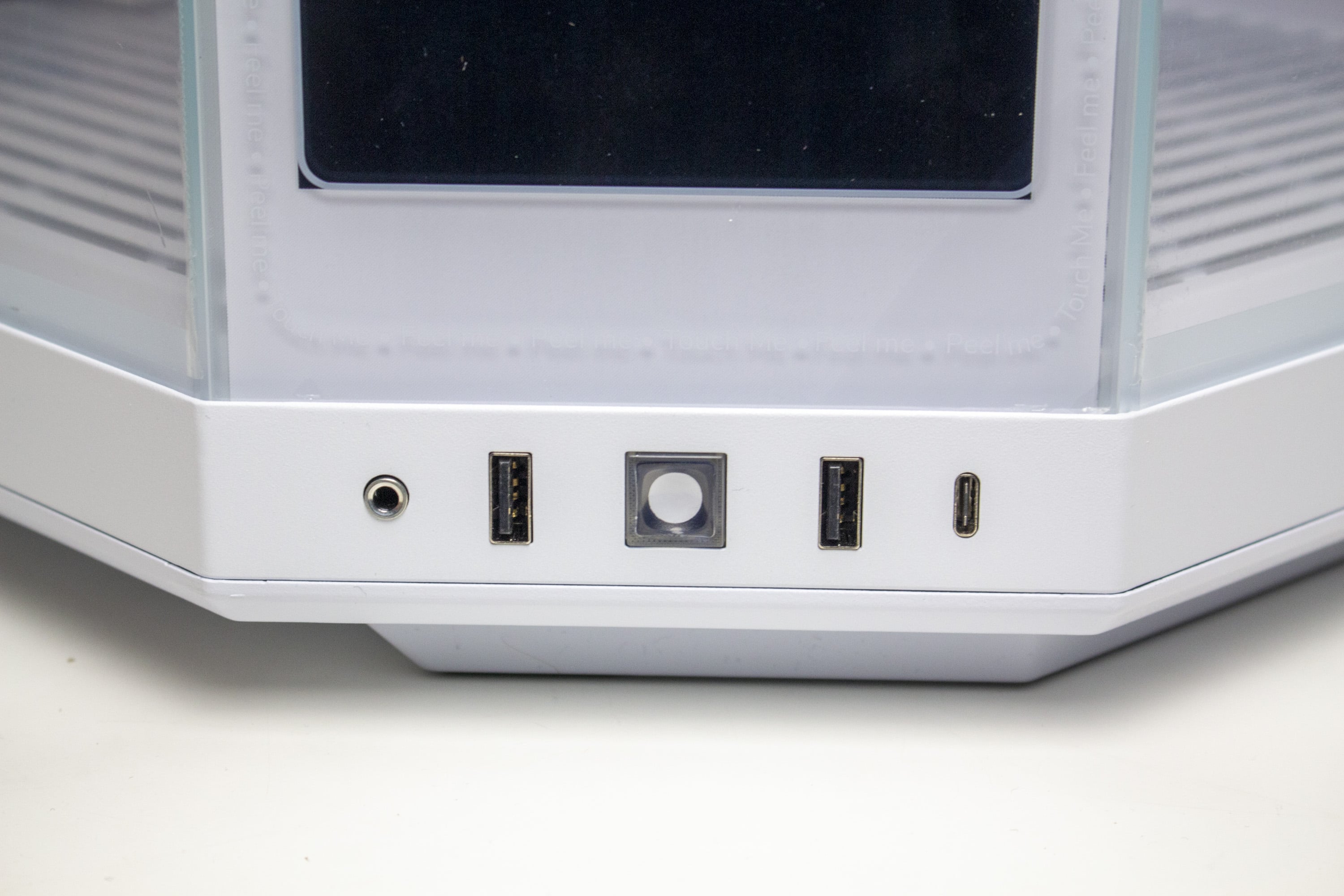 Richtet man seinen Blick leicht nach links, dann fällt direkt die markante, abgeschrägte Vorderkante ins Auge. Anders als beim Y60 platziert HYTE beim Y70 Touch hier aber nicht nur eine normale Glasscheibe, sondern ein 14,1″-IPS-Display mit Touchscreen, welches über eine Software angesteuert und personalisiert werden kann. Bei Bedarf kann das Touchscreen-Element auch ausgebaut werden. Unterhalb des Displays lässt sich das I/O-Panel erkennen. Dieses verfügt über einen USB 3.2 Typ-C sowie zwei USB 3.2 Gen 1 Typ-A Anschlüsse, einen weiß-beleuchteten Power-Button sowie einen HD-Audio-Comboport. Der Power-Button hat leider eine merkwürdige bzw. sehr weiche Haptik, die einen exakten Druckpunkt vermissen lässt.