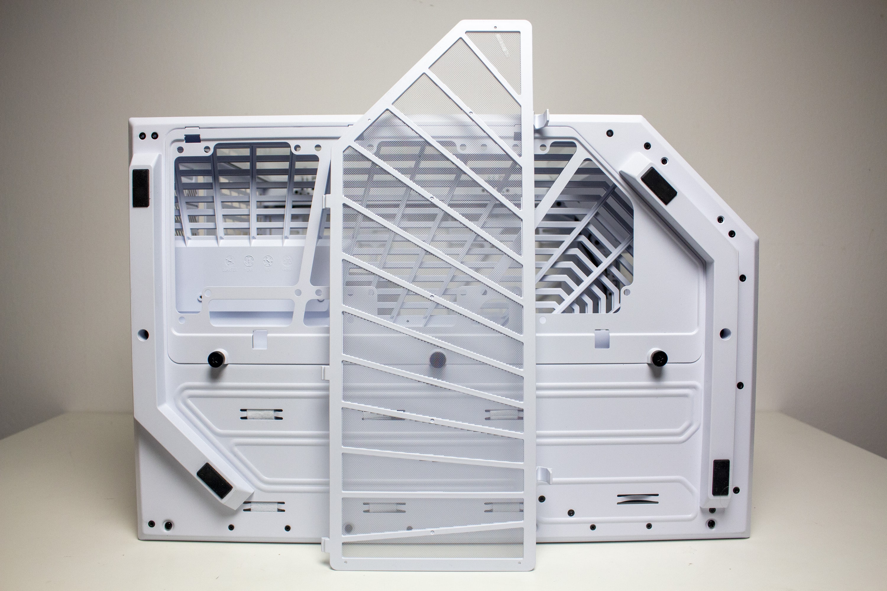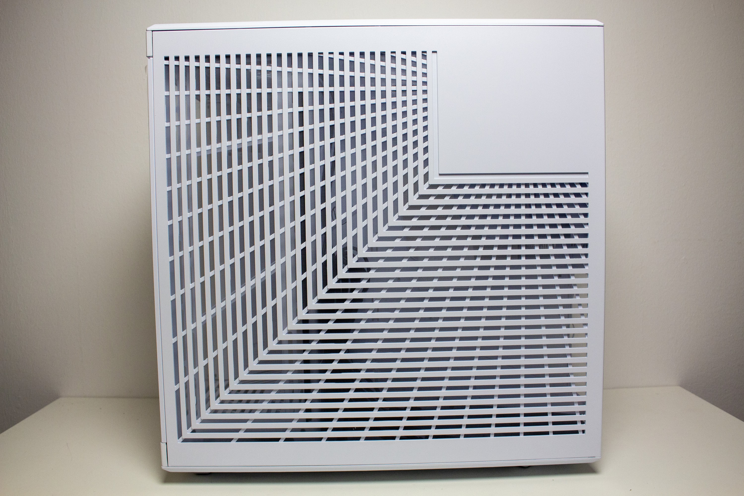 Die Gestaltung der Seitenteile könnte unterschiedlicher nicht sein. So besteht das linke Seitenteil aus Temperglas. Das Glas wurde dabei auf einen zusätzlich Stahlrahmen geklebt, der ebenfalls über Stahlnasen für die Push-Pin-Befestigung am Korpus verfügt. Das rechte Seitenteil besteht aus Stahl und verfügt auf der Innenseite ebenfalls über eine zusätzlich Schicht Kunststoff. Auch hier wurde in das Kunststoffelement ein Staubfilter eingearbeitet. Optisch setzt sich das Design des Deckels an der Seite fort: große, längliche Belüftungsöffnungen laufen erst nach unten und machen dann einen scharfen Knick nach rechts zum Heck des Gehäuses. Zuletzt verfügt das rechte Seitenteil ebenfalls über Push-Pins.