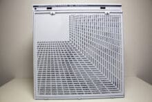 Der Deckel des HYTE 70 besteht aus Stahl, welcher von innen mit einer zusätzlichen Schicht Kunststoff verstärkt wurde und über einen integrierten Staubfilter verfügt, der leider nicht ausgebaut werden kann. Die Verbindung zwischen Korpus und Top-Panel erfolgt über Push-Pins aus Kunststoff, was eine werkzeuglose Demontage ermöglicht. Optisch bleibt HYTE sich treu und stattet das Panel mit einem auffälligen Belüftungsgitter aus, welches aus länglichen Öffnungen besteht, die der Form des Gehäuses folgen. Unterhalb des Panels erkennen wir einen modularen Halterahmen für drei 120-mm- oder zwei 140-mm-Lüfter bzw. entsprechend große Radiatoren.