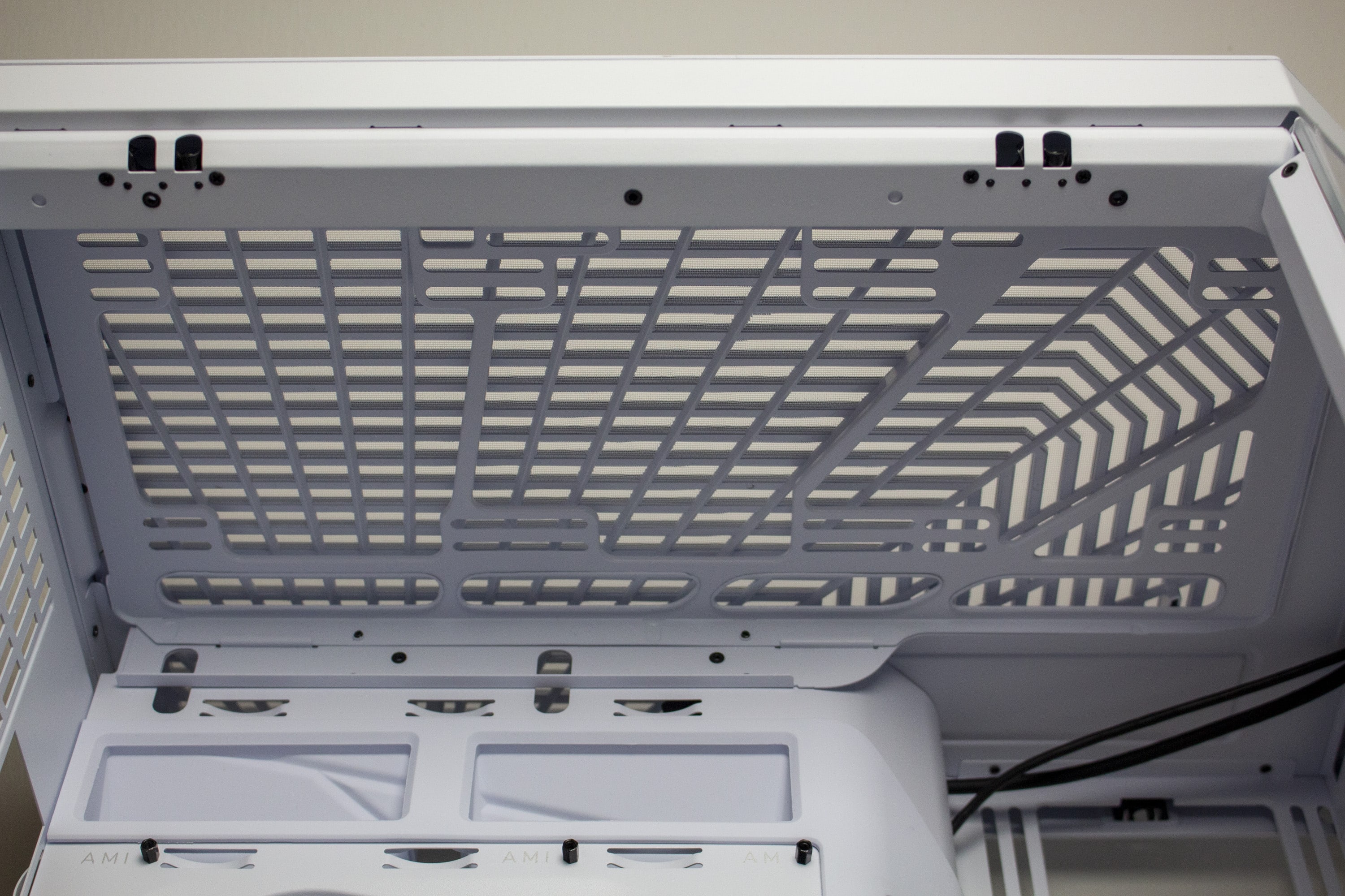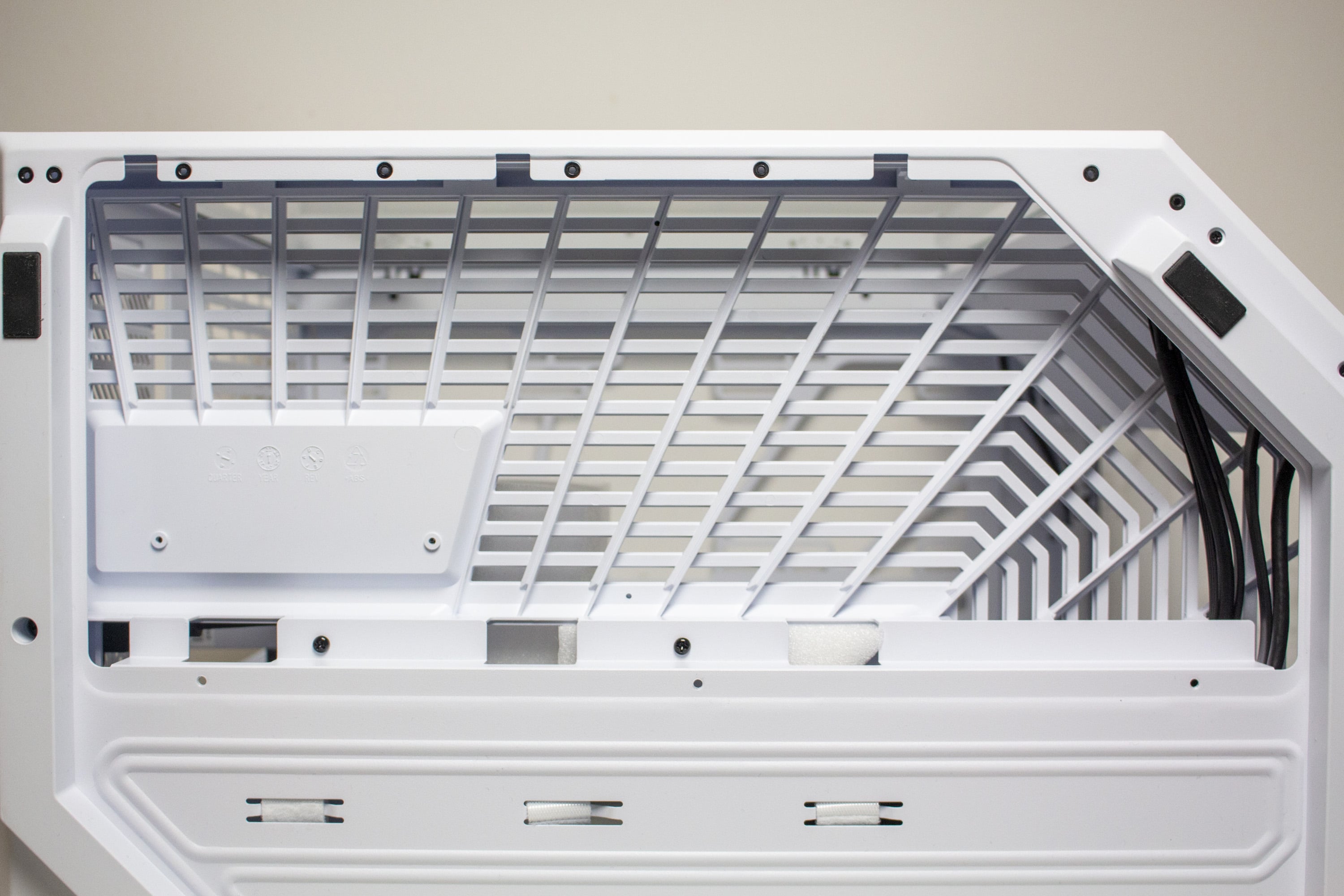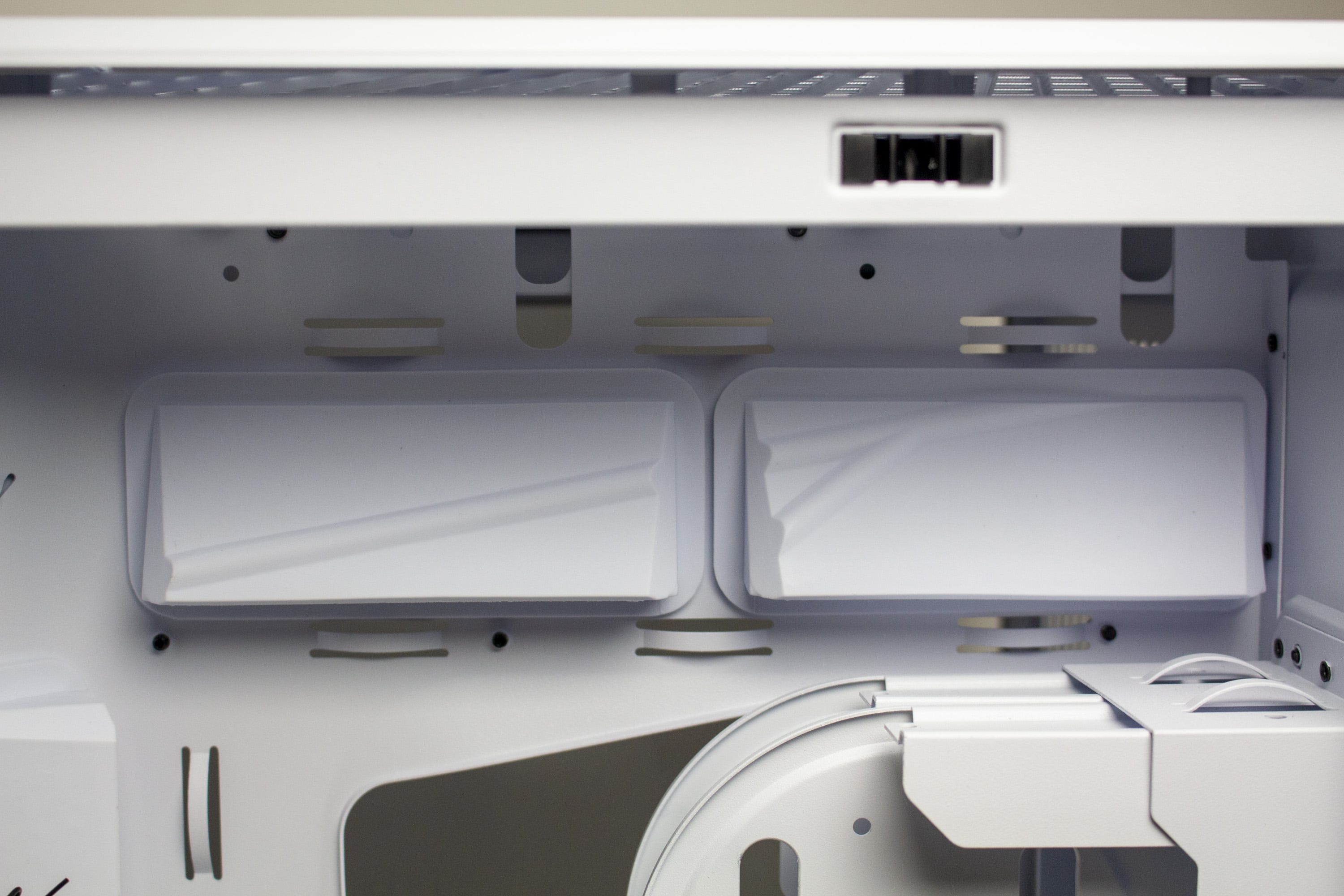 Ebenfalls unschön ist erneut der hohe Einsatz von Kunststoff. So wurde sowohl hinter das Seiten- als auch das Top-Panel eine Schicht Kunststoff geklebt, in welche der Staubfilter intergiert wurde. Dadurch erhält das Panel zwar eine etwas höhere Stabilität, wirkt aber weniger wertig und solide als beim Einsatz eines stärkeren Stahlpanels. Beim Top-Panel wurden leider sogar die Push-Pins aus Kunststoff gefertigt und könnten über einen längeren Nutzungszeitraum eventuell eine Schwachstelle darstellen. Darüber hinaus besteht auch der gesamte untere Bereich des Innenraums aus Kunststoff.
