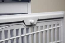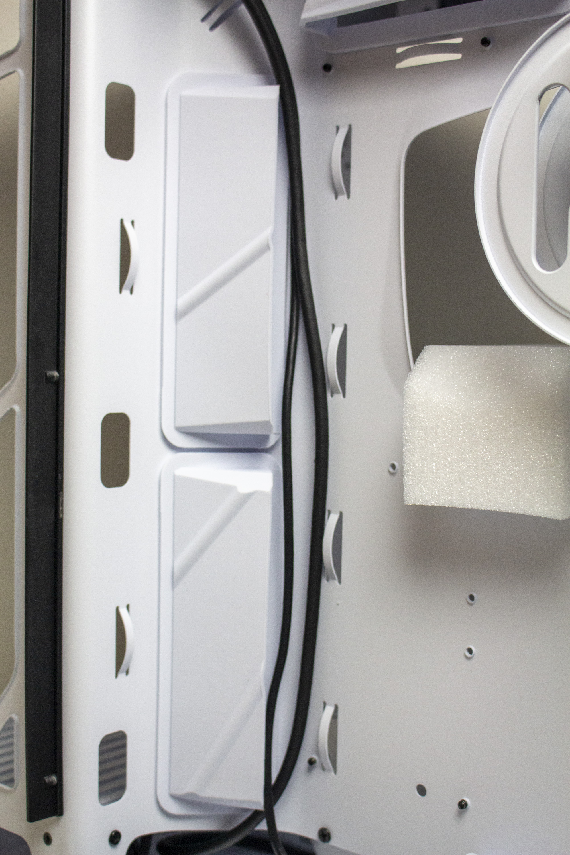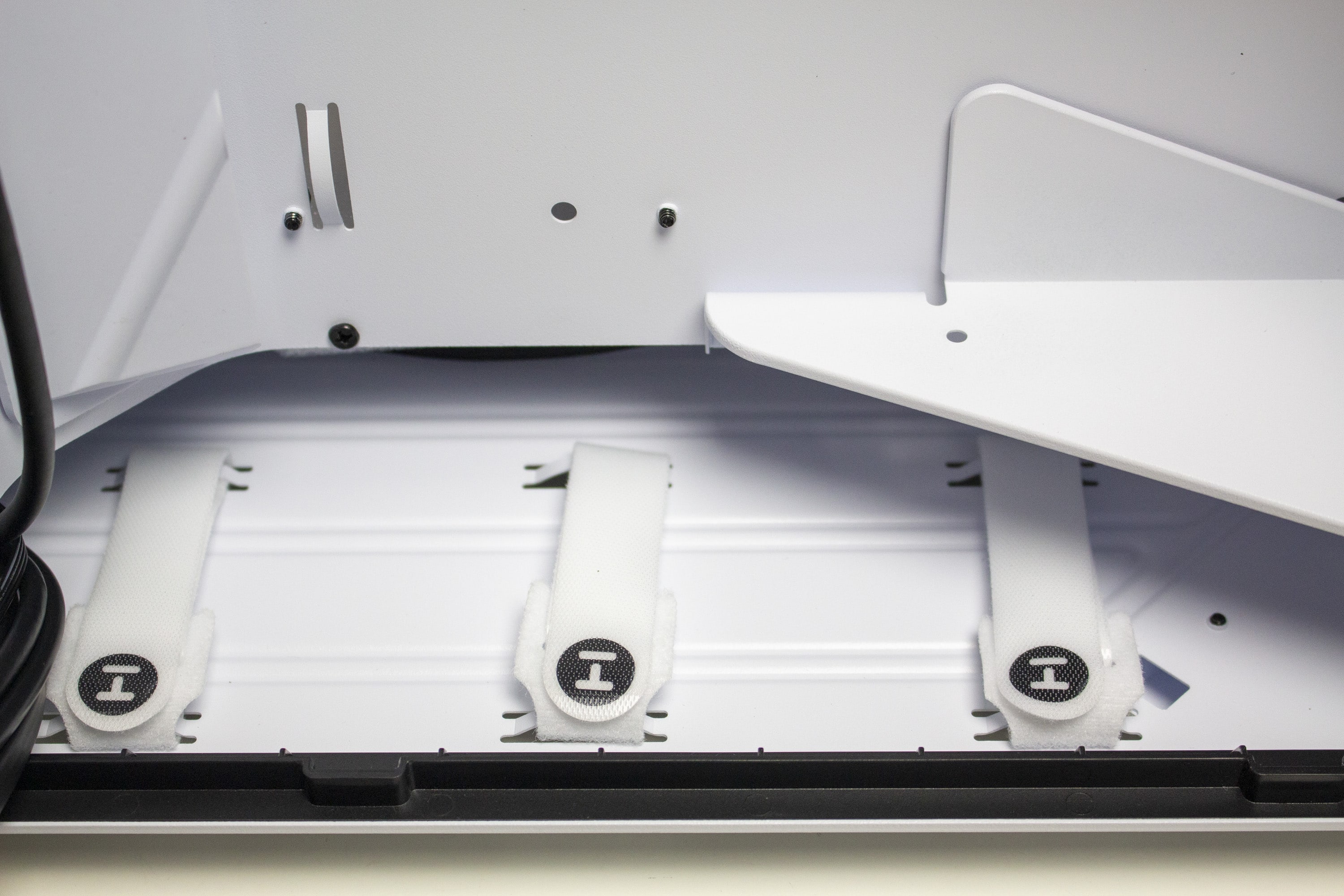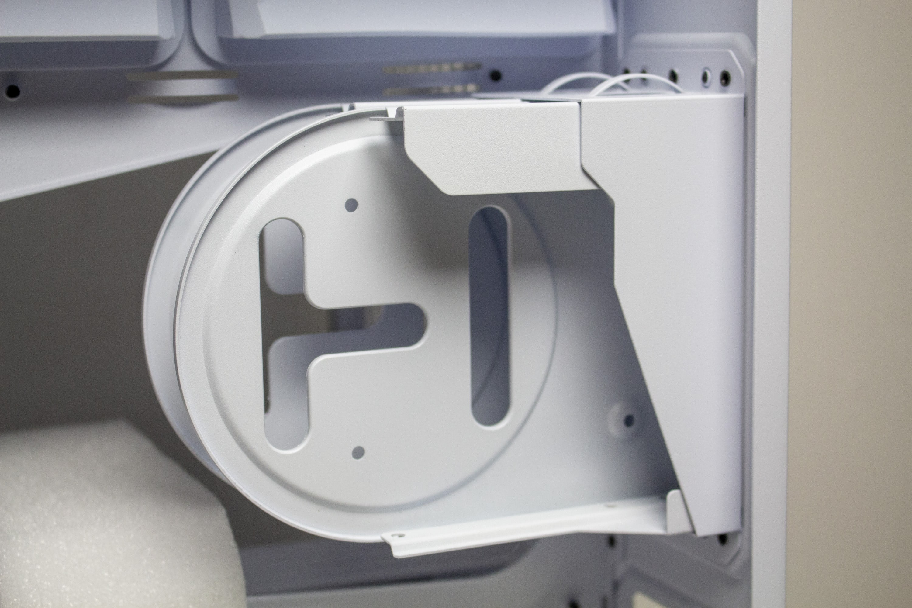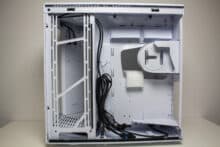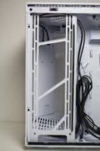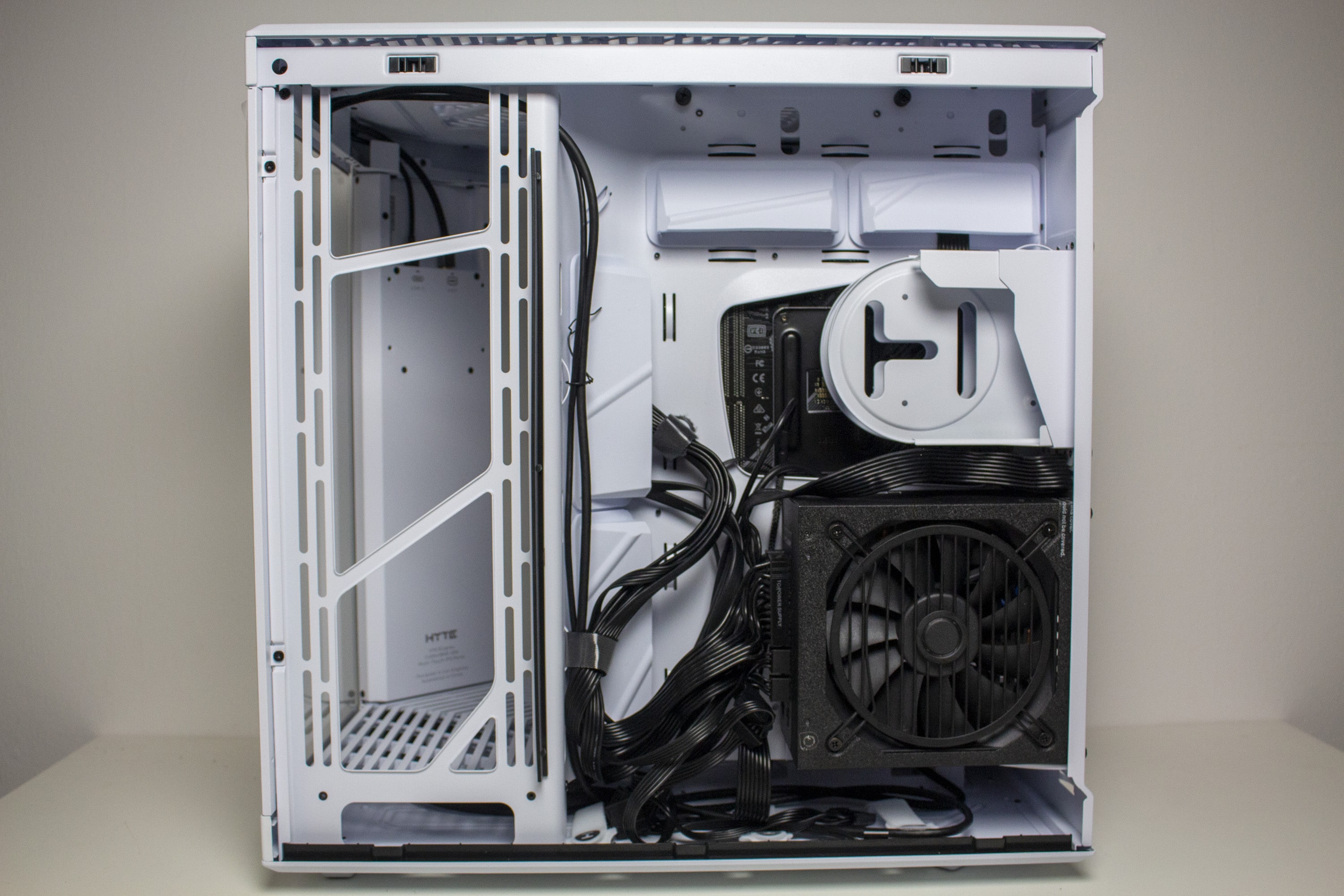 Nun wenden wir uns der separaten Kammer hinter dem Mainboard-Tray zu. Diese bietet Platz für ein 230 Millimeter lange Netzteil und beherbergt zwei leere Festplattenkäfige. Das Netzteil wird im unteren Bereich platziert und ruht zur zusätzlichen Unterstützung auf einer stabilen Halterung aus Kunststoff. Entsprechende Belüftungsöffnungen im rechten Seitenteil sorgen dafür, dass das Netzteil nicht ersticken muss. Ansonsten lassen sich in der Kammer zahlreiche Kabelmanagementöffnungen, Ösen für Kabelbinder und, am Boden, wiederverwendbare Kabelbinder mit Klettverschluss erkennen.
