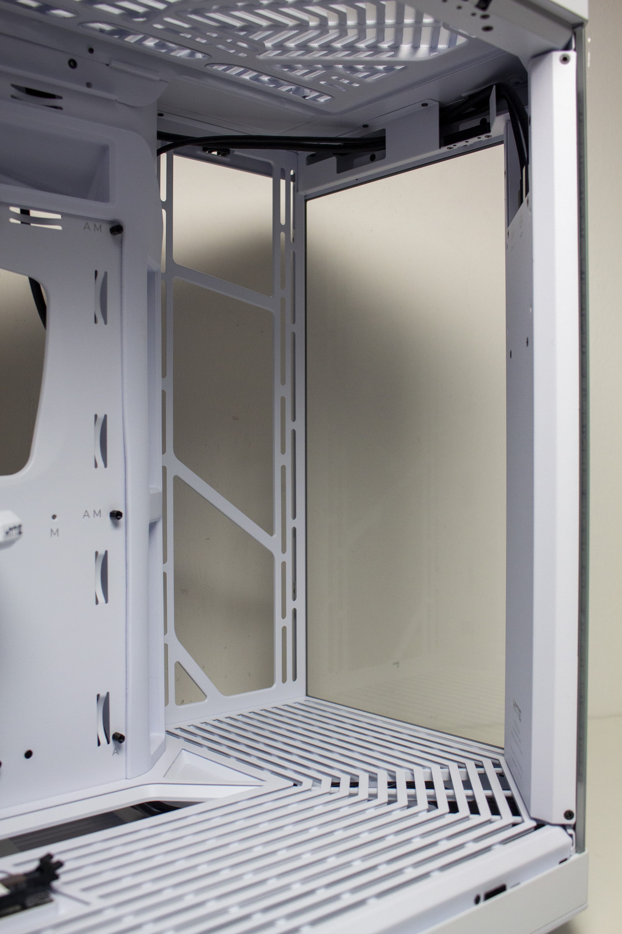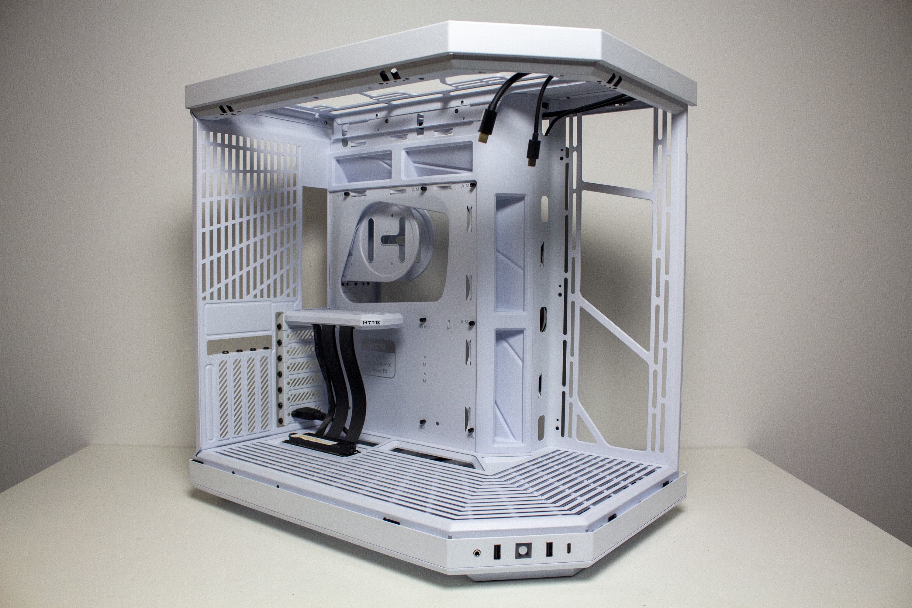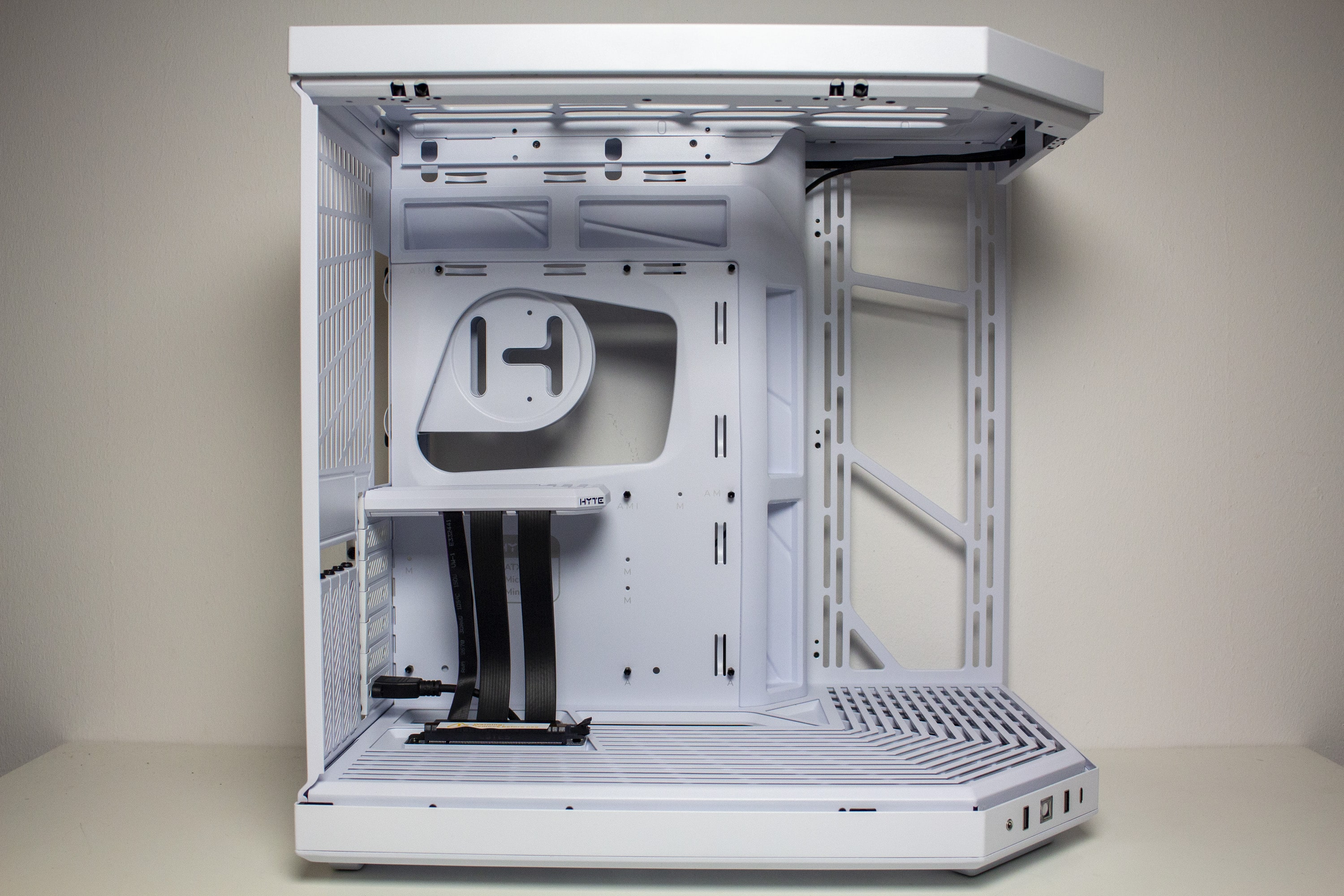 HYTE setzt, wie beim Y60, auf ein Zwei-Kammer-Layout, bei dem die Kammern durch das vertikale Mainboard-Tray getrennt werden. Die große Hauptkammer beherbergt dabei ein Mainboard bis zum EATX-Format, eine vertikal orientierte Grafikkarte sowie einen CPU-Luftkühler oder Radiatoren. Das Mainboard-Tray ist plan gestaltet und knickt an der rechten Seite nach hinten ab. In diesem Knick sowie ober- als auch unterhalb, lassen sich große und gummierte Kabelmanagementöffnungen im Mainboard-Tray erkennen.