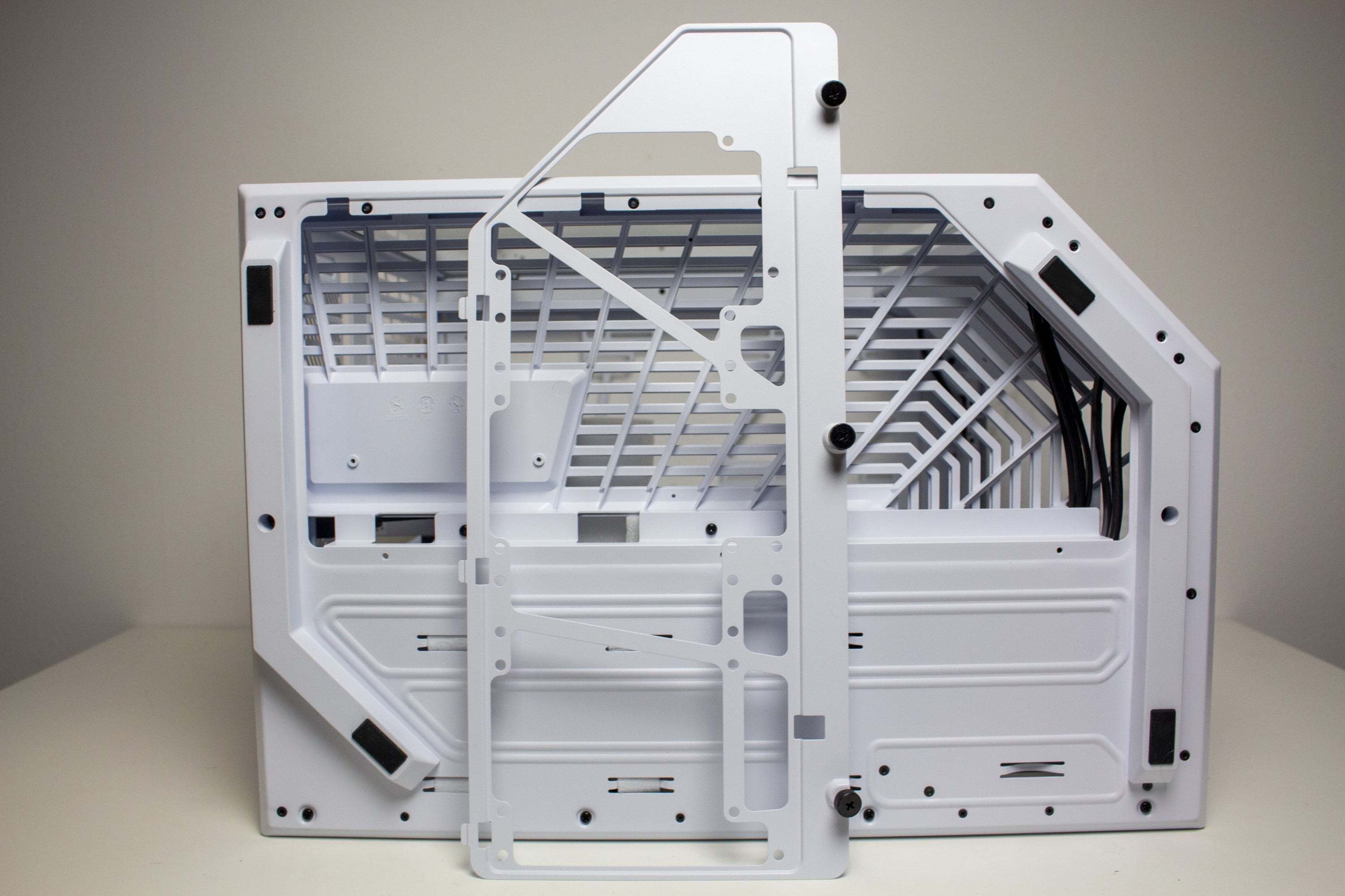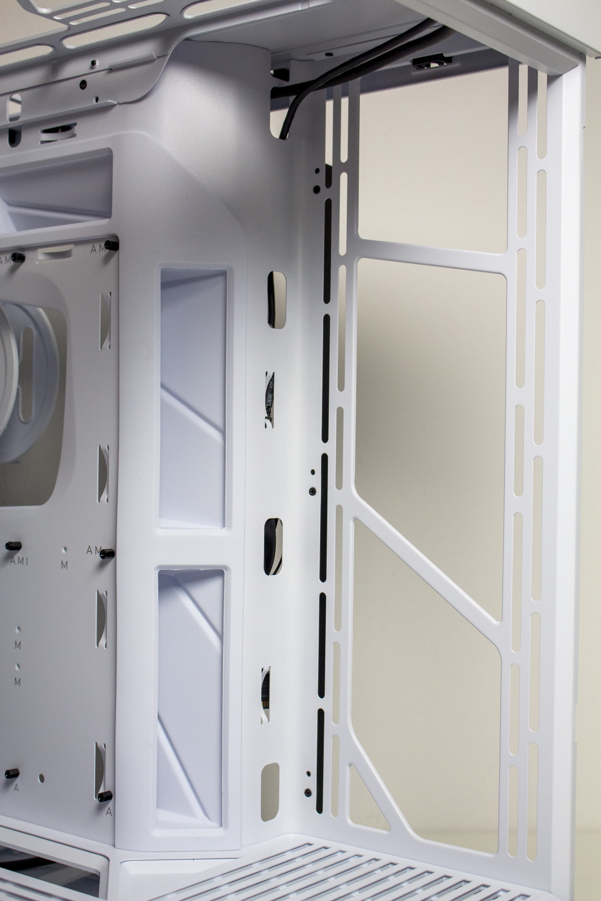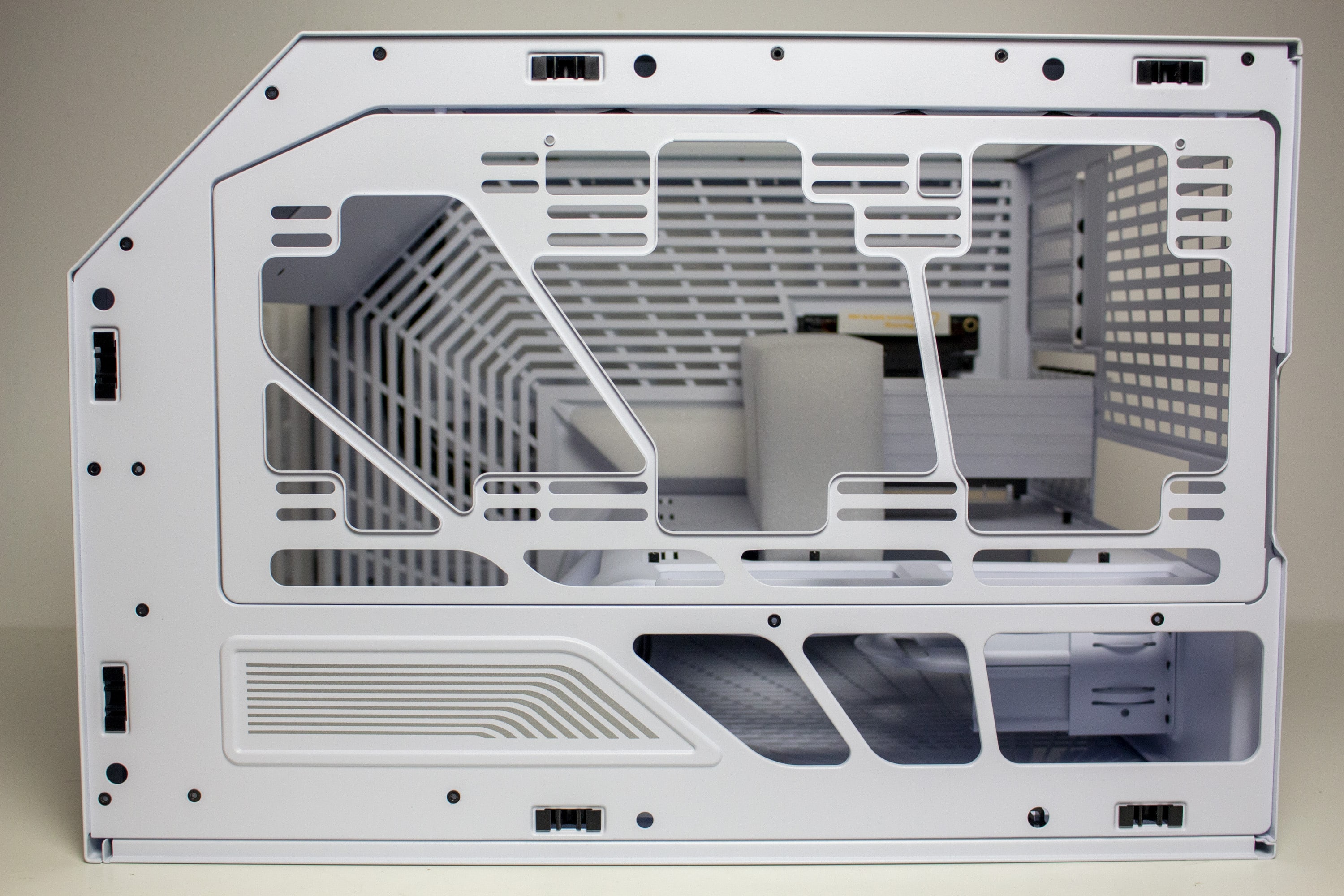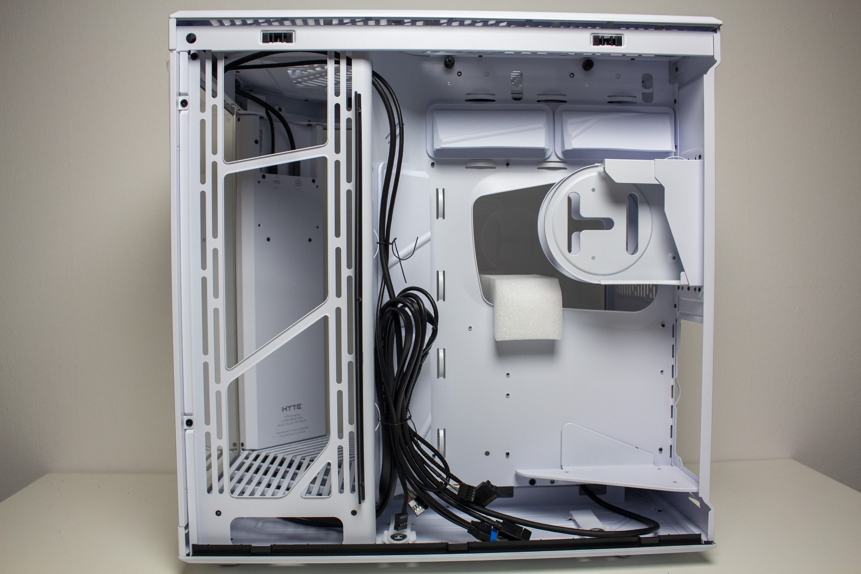 HYTE setzt, wie beim Y60, auf ein Zwei-Kammer-Layout, bei dem die Kammern durch das vertikale Mainboard-Tray getrennt werden. Die große Hauptkammer beherbergt dabei ein Mainboard bis zum EATX-Format, eine vertikal orientierte Grafikkarte sowie einen CPU-Luftkühler oder Radiatoren. Das Mainboard-Tray ist plan gestaltet und knickt an der rechten Seite nach hinten ab. In diesem Knick sowie ober- als auch unterhalb, lassen sich große und gummierte Kabelmanagementöffnungen im Mainboard-Tray erkennen.