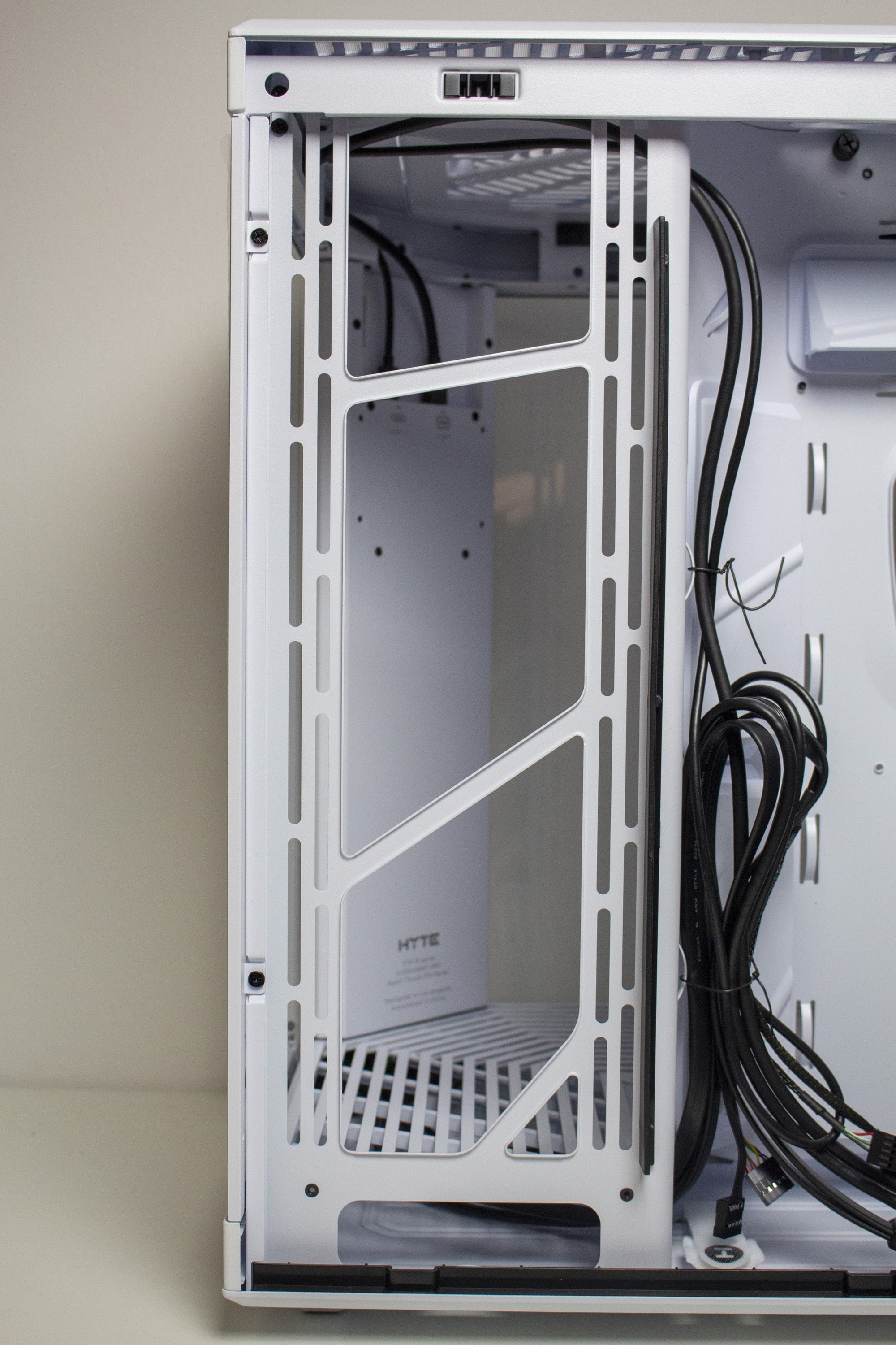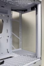 Im vorderen Bereich des Innenraums gibt es nur Glas. Um dennoch eine Frischluftzufuhr ermöglichen zu können, platziert HYTE rechts neben dem Mainboard-Tray einen Montagrahmen für drei 120-mm- oder zwei 140-mm-Lüfter oder einen entsprechend großen Radiator. Auch oberhalb des Mainboard-Trays gibt es mehr als genug Platz für einen Radiator und für bis zu drei Lüfter.