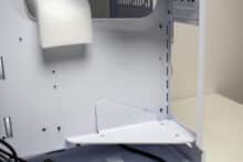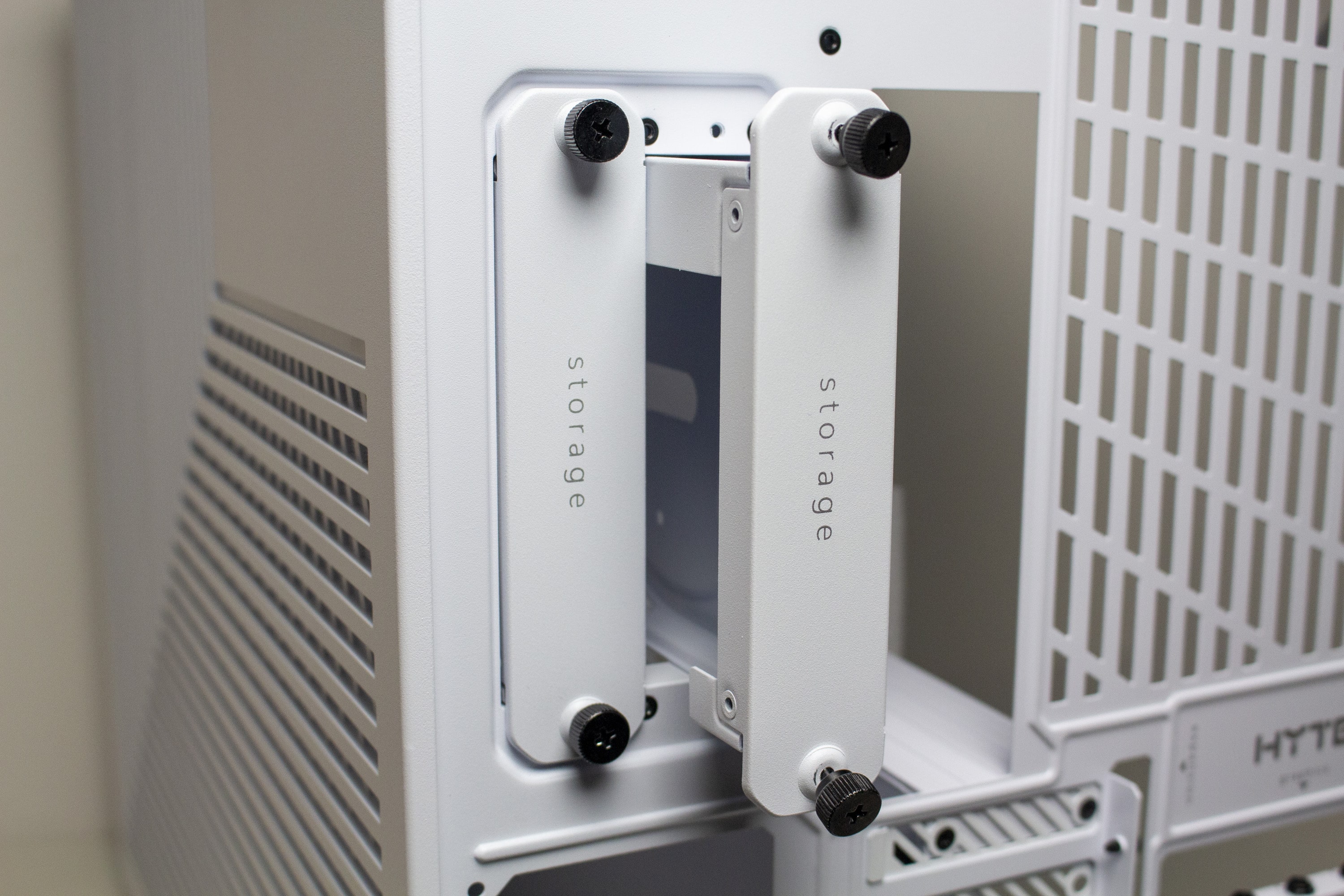Wie auch das Netzteil, werden die Datenträger beim HYTE Y70 Touch in der Kammer hinter dem Mainboard-Tray verstaut. Dazu stellt der Hersteller zwei Montagerahmen aus Stahl zur Verfügung. Die Montage der Datenträger erfolgt unentkoppelt und erfordert, unabhängig von der Größe der Festplatte, einen Schraubendreher. Die zwei Rahmen bieten Platz für jeweils eine 3,5″- oder zwei 2,5″-HDDs bzw. SSDs. Zur Bestückung müssen die Halterahmen nach hinten aus dem Gehäuse gezogen und die Datenträger verschraubt werden. Anschließend können die Käfige wieder in das Gehäuse hineingeschoben und mit jeweils zwei Rändelschrauben befestigt werden.