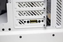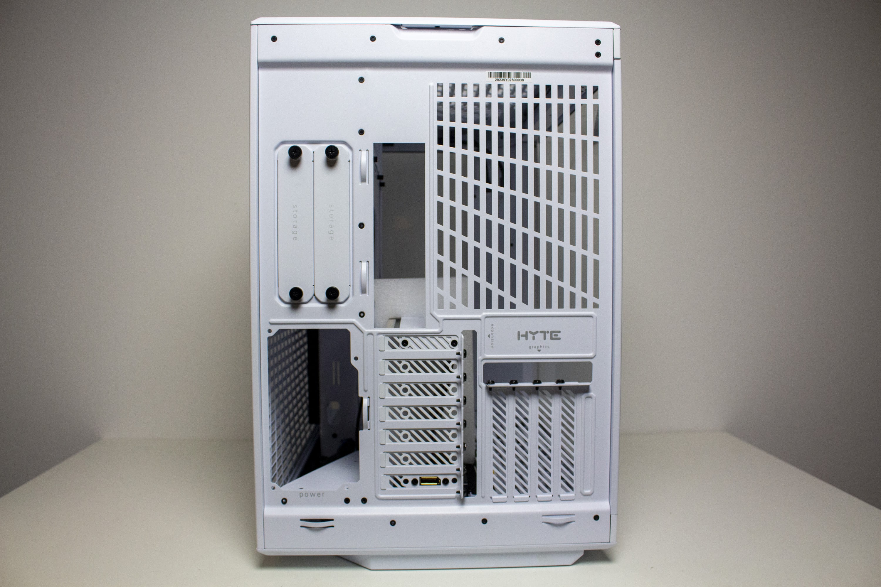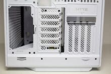 Wagt man ein Blick auf die Rückseite des HYTE Y70 Touch, dann erkennt man schnell, dass im Inneren kein typisches Layout auf uns wartet. Das Netzteil wird vertikal an der linken Seite montiert. Auf der rechten Seite finden wir hingegen einen unbestückten Lüfterplatz für einen 120-mm- oder 140-mm-Lüfter sowie den Ausschnitt für die Anschlüsse des Mainboards. Im unteren Bereich wird es nun sehr untypisch. Vorhanden sind hier vier vertikale Erweiterungsslots sowie sieben horizontale Slots, die aber nur halbhoch (Low-Profile) sind. Darüber hinaus lassen sich neben den obligatorischen Lüftungsschlitzen auch zwei Schraubenlöcher pro Low-Profile-Blende erkennen.