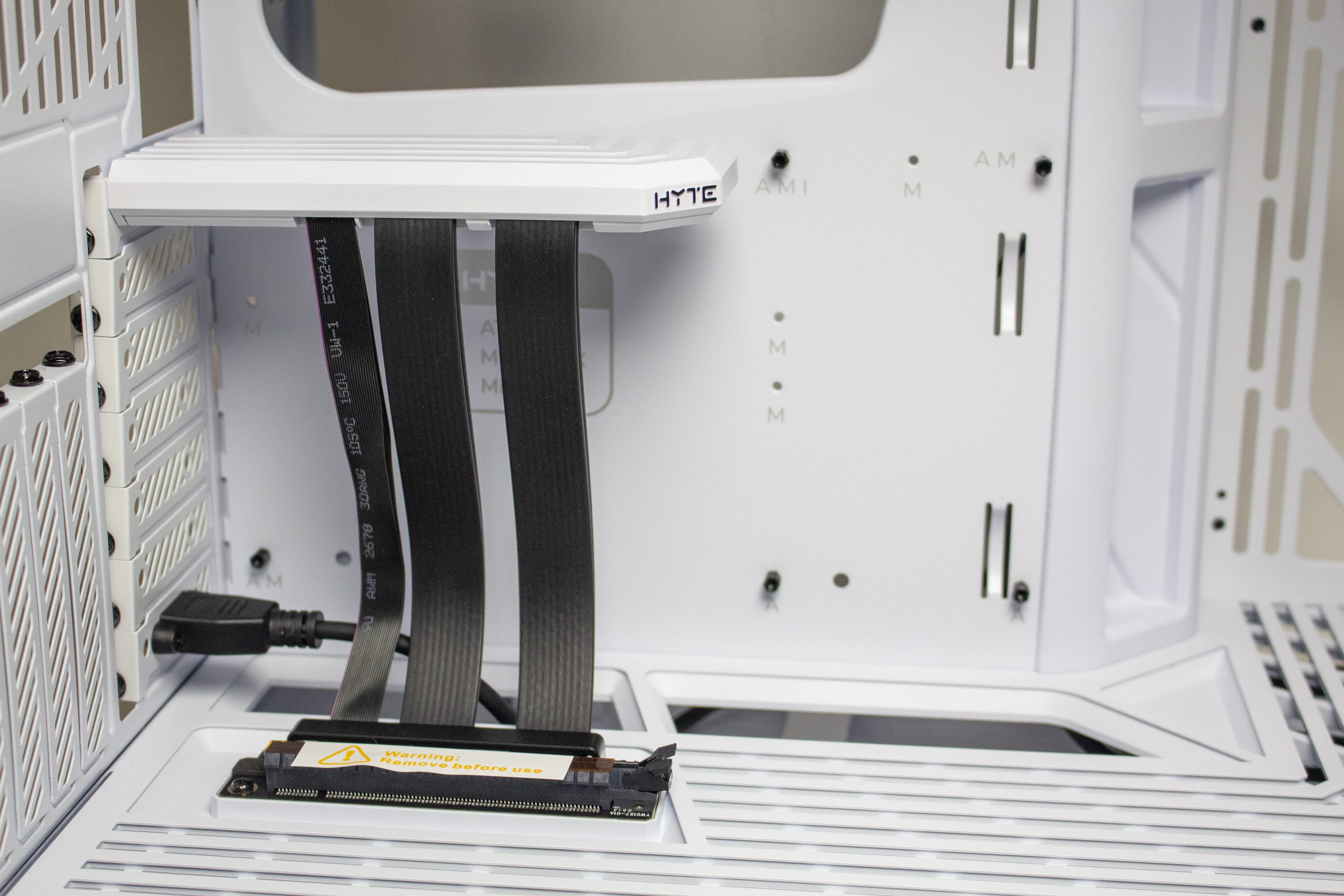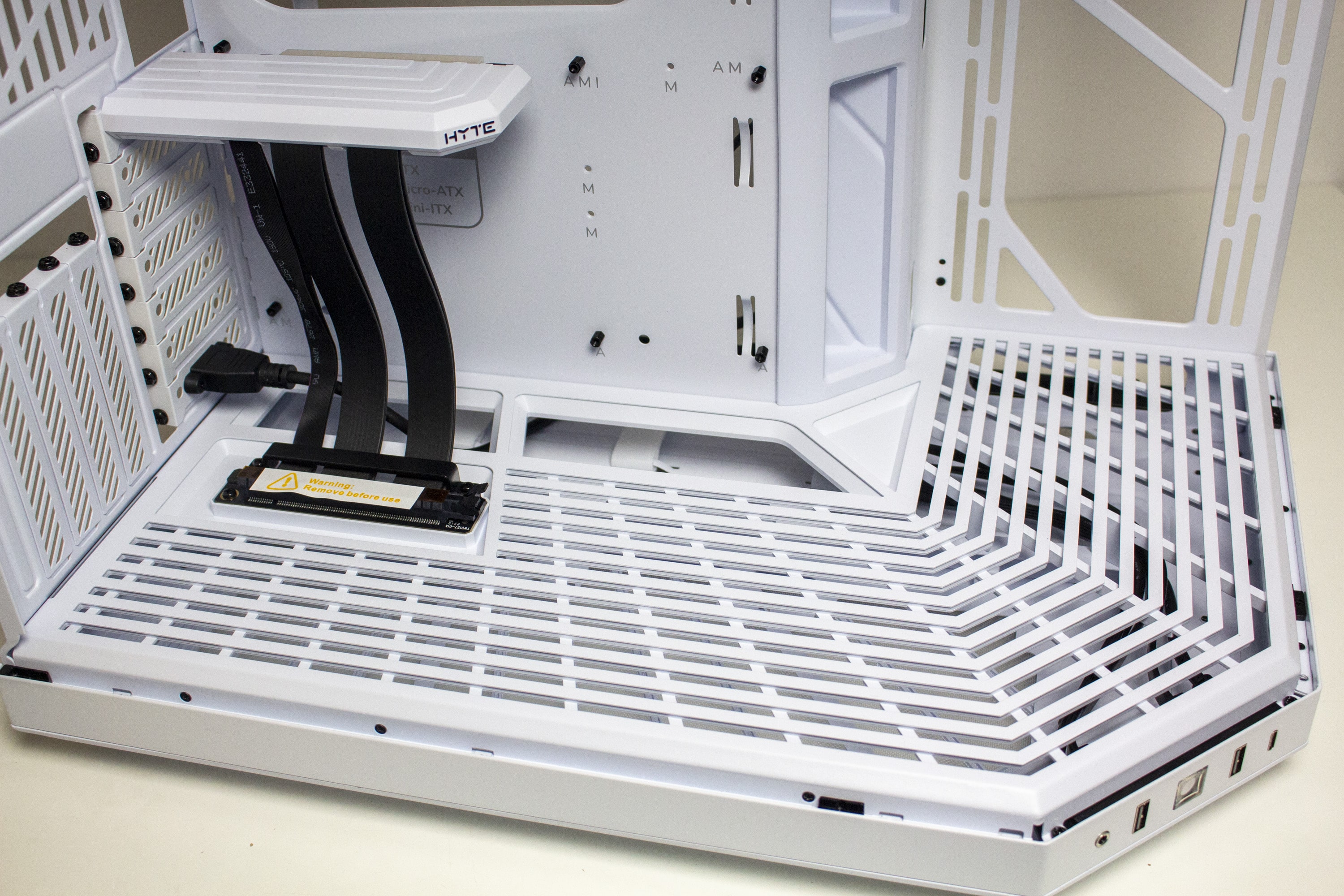 Die Bodenpartie im Innenraum folgt der Optik des Deckels. Längliche Lüftungsschlitze sollen gewährleisten, dass die optionalen Lüfter an der Unterseite die vertikal orientierte Grafikkarte mit genügend Frischluft versorgen können. Ermöglicht wird die vertikale Montage durch ein hochwertiges und optisch sehr ansprechendes PCIe-4.0-Riser-Kabel, dessen Stecker in der Gehäusefarbe lackiert wurde. Zusätzlichen Support erhält das Steckmodul außerdem durch zwei Schrauben an der Rückseite der halbhohen Slotblenden.