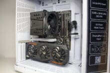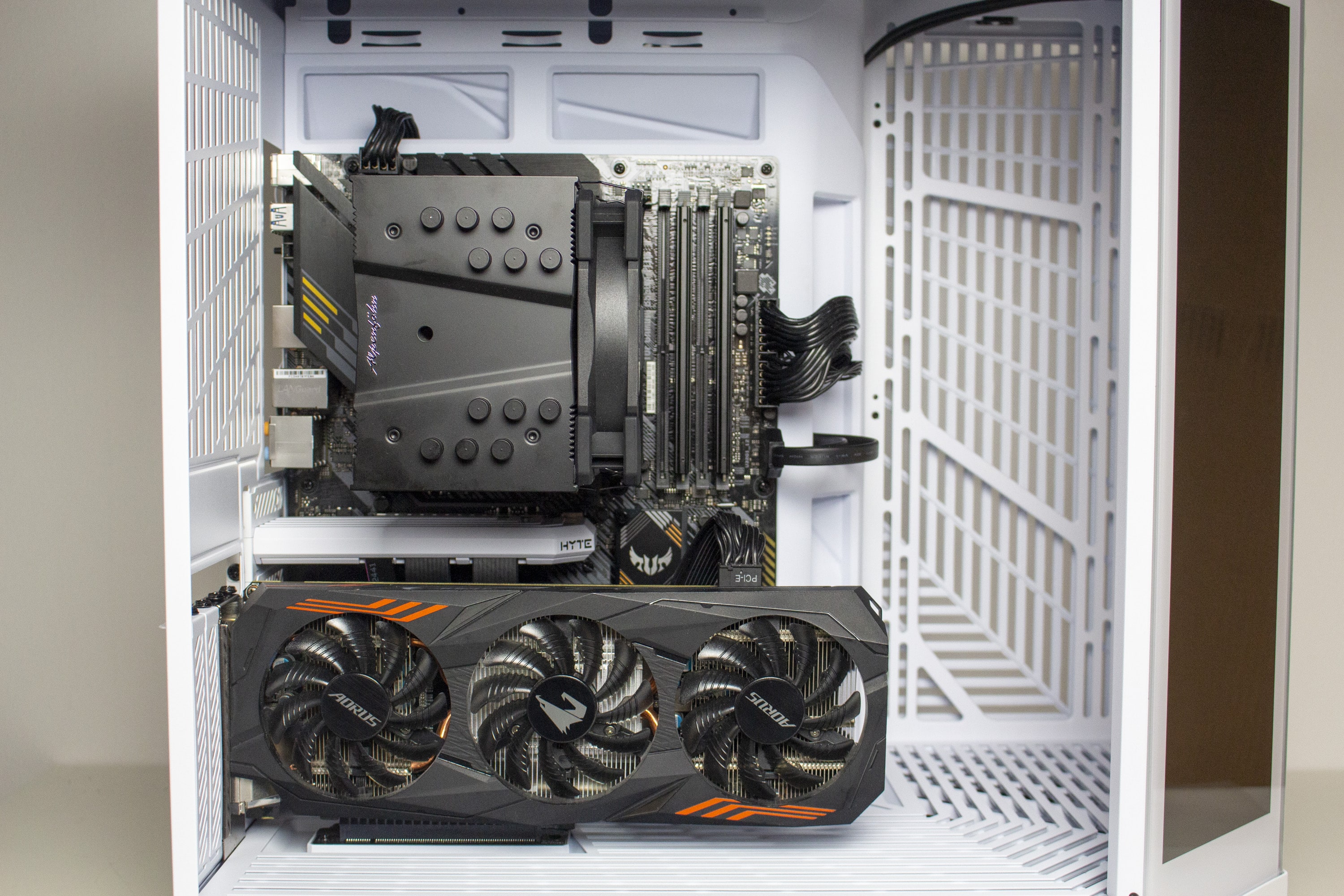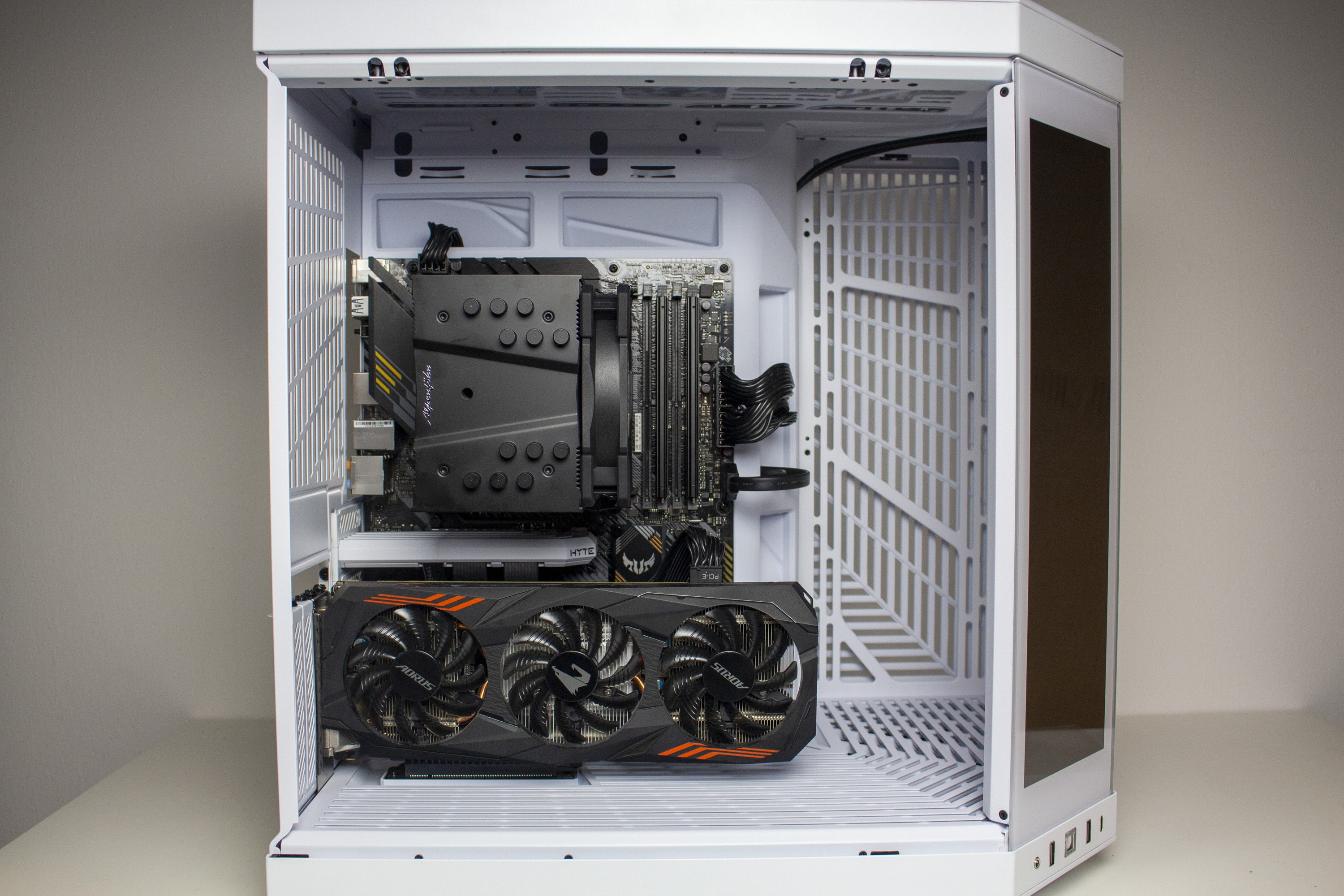 Nun kommen wir zum Systemeinbau beim HYTE Y70 Touch Test. Als Hardware verwenden wir einen AMD Ryzen 5 1400* auf einem ASUS TUF Gaming B550M-Plus* mit 16GB Crucial Ballistix Sport LT grau DDR4-2666*. Der Ryzen wird von einem Alpenföhn Brocken 4* gekühlt und ist auf 3,8 GHz (1,175 V) übertaktet. Für die Bildausgabe ist eine Gigabyte AORUS GTX 1060 6GB zuständig. Die Stromversorgung erledigt das vollmodulare LC-Power LC550 V2.31 Platinum*.
