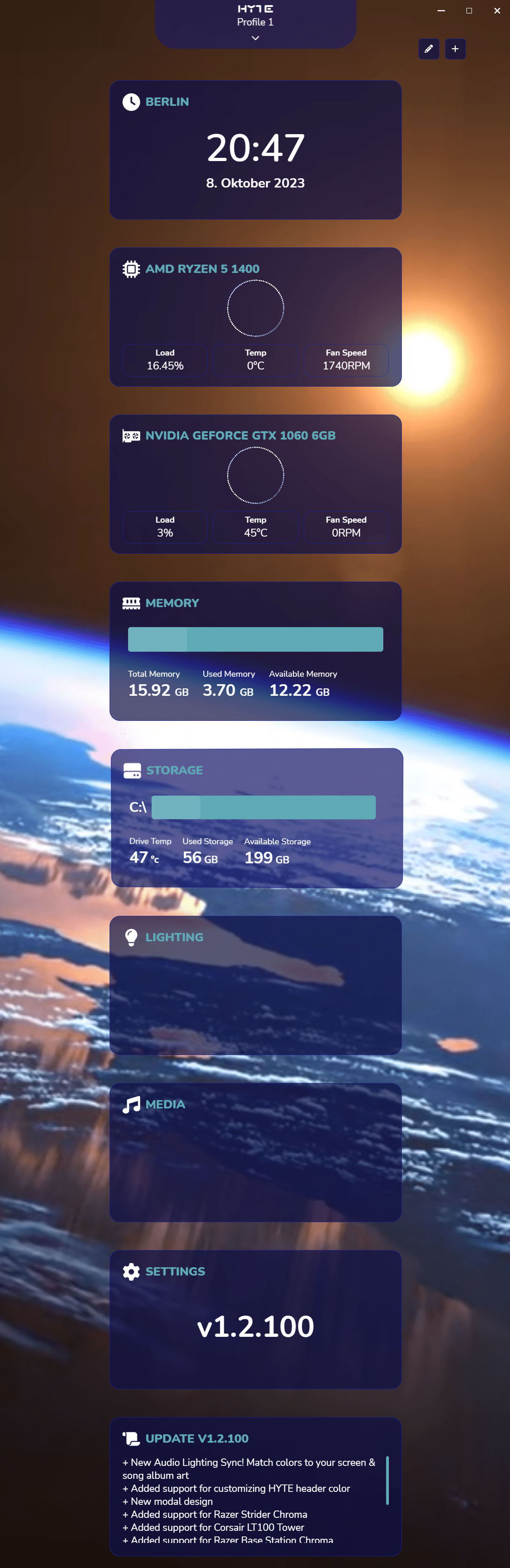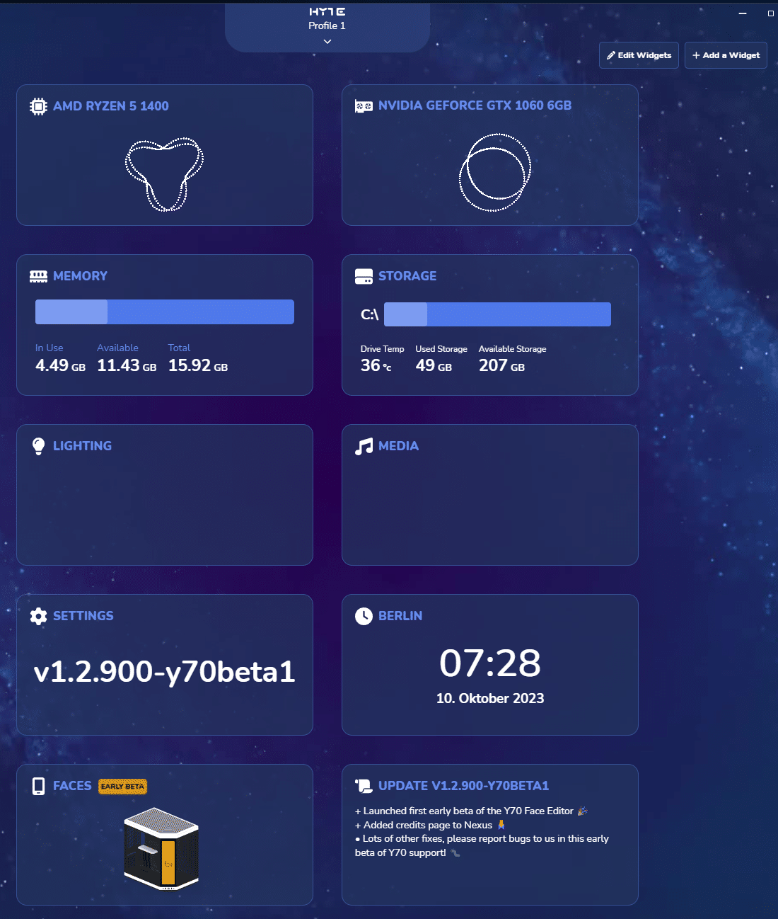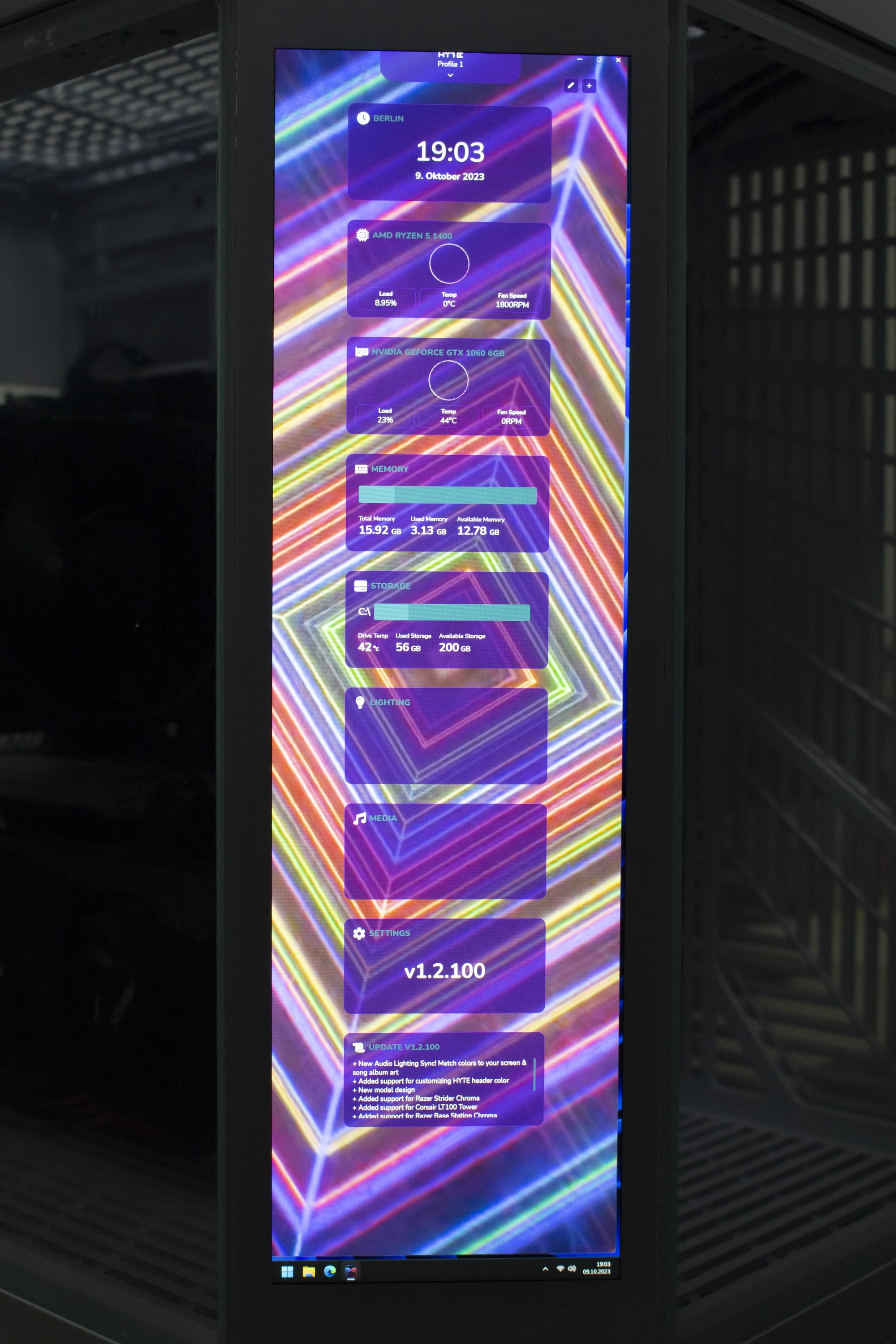 Grundsätzlich kann auf dem Bildschirm jede beliebige Applikation bzw. jedes beliebiges Fenster platziert werden. Aufgrund des ungewöhnliches Formats sieht das Ergebnis in den meisten Fällen aber nicht so gut aus. Um dort Abhilfe zu schaffen, stellt HYTE die Software NEXUS zur Verfügung. Diese kam auch bereits beim HYTE Y60 mit Display zum Einsatz. Die Software verfügt über viele Konfigurationsoptionen bzw. Widgets und macht aus dem Bildschirm eine Art Homescreen wie bei einem Smartphone. Für das Y70 Touch wurde zudem das neue Modul „Faces“ entwickelt.