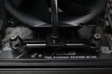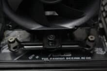 In der „Pro“-Variante implementiert Inter-Tech ein Montagesystem, welches eine feste Verschraubung am Mainboard vorsieht. Zunächst müssen dazu die Kunststoffbügel des AMD-Retentionsmoduls entfernt und stattdessen vier Abstandshalter auf den Nasen der Backplate platziert werden. Als nächstes mussten wir noch zwei schwarz lackierte Haltebügel an die Abstandshalter bzw. das Mainboard schrauben.