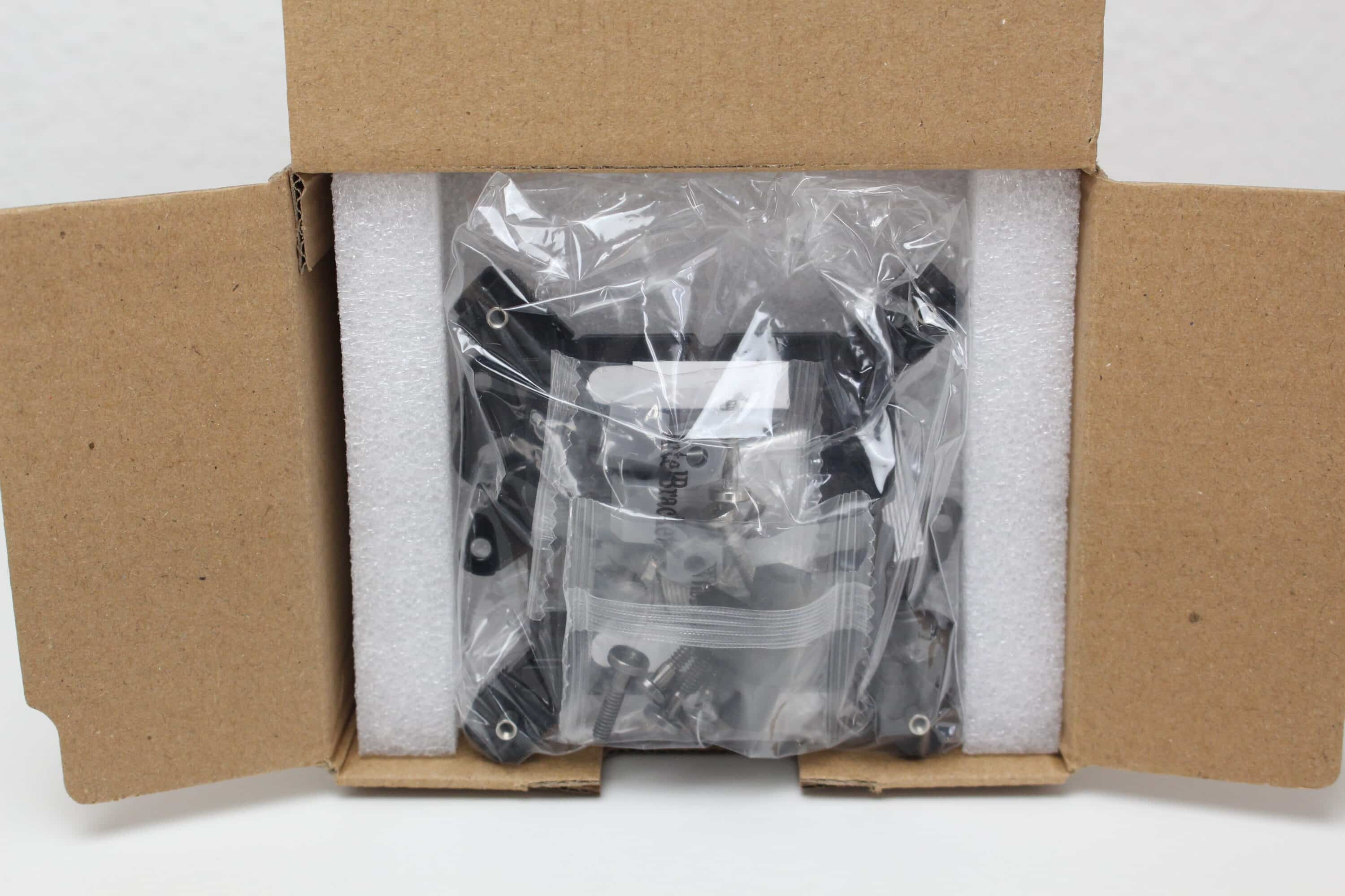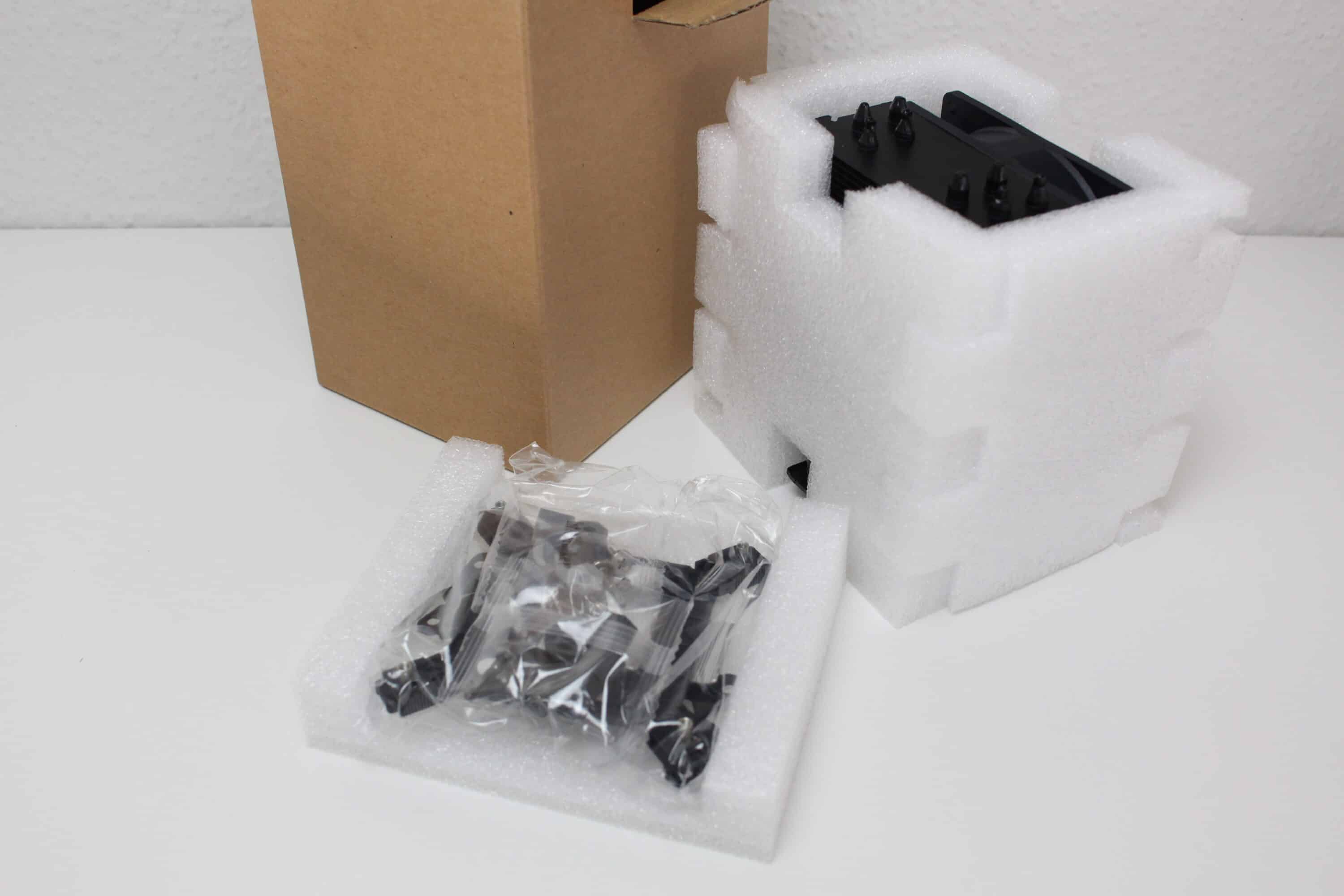 Inter-Tech verpackt den 4P90 Pro Bulk in einer neutralen Verpackung aus brauner Pappe. Lediglich ein kleines Etikett an der Oberseite nennt den Produktnamen und auch technische Daten wurden nicht auf den Karton gedruckt. Im Inneren finden wir, geschützt von Schaumstoff, den Kühlkörper mit vorinstalliertem Lüfter sowie sämtliches Montagematerial und ein Beutel Wärmeleitpaste. Eine Montageanleitung wurde der Bulk-Version nicht beigelegt.