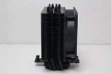 Der Lüfter steht dem Kühlkörper in seiner Schlichtheit im nichts nach. Er besteht aus einem schwarzen Lüfterrahmen sowie einem schwarzen Rotorblatt mit sieben Flügeln. Inter-Tech gibt als Drehzahlbereich 800 bis 2000 Umdrehungen pro Minute an und der Anschluss erfolgt für ein 4-Pin PWM-Stecker. Gummierte Ecken gibt es nicht und die Befestigung am Kühlkörper erfolgt über einfache aber schwarz lackierte Metallklammern.