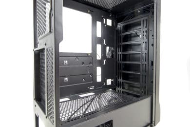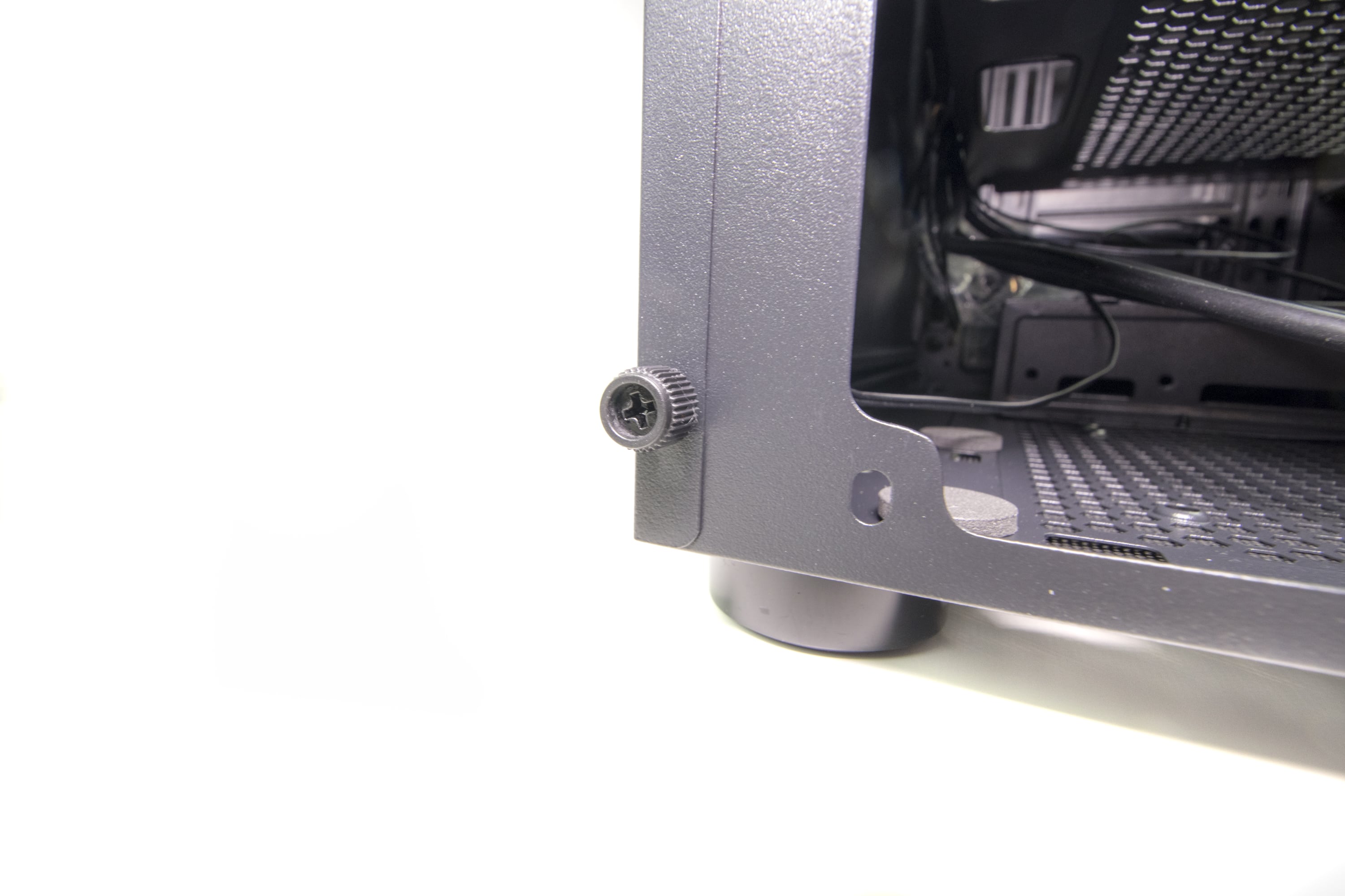 An der linken Seite des Gehäuses befindet sich ein großes Hartglas-Seitenpanel, das mit vier Rändelschrauben gehalten wird, die einfach per Hand gelöst werden können. Selbstverständlich liegt das Glas auf Gummipolstern, damit es nicht zerkratzt.