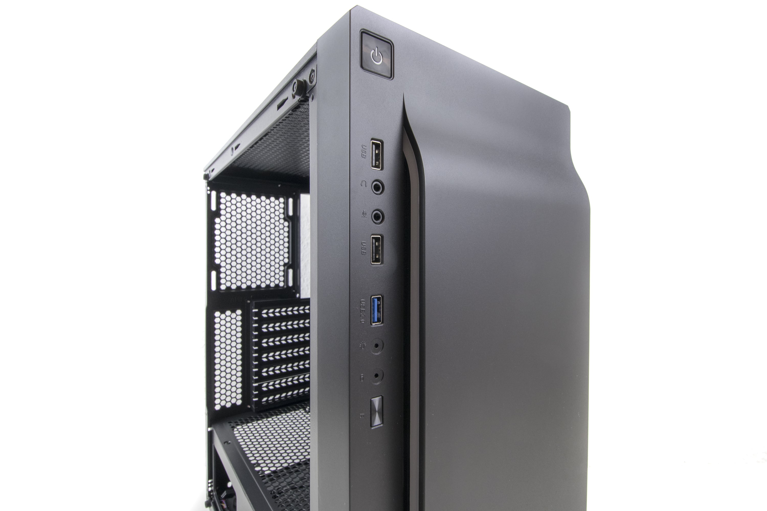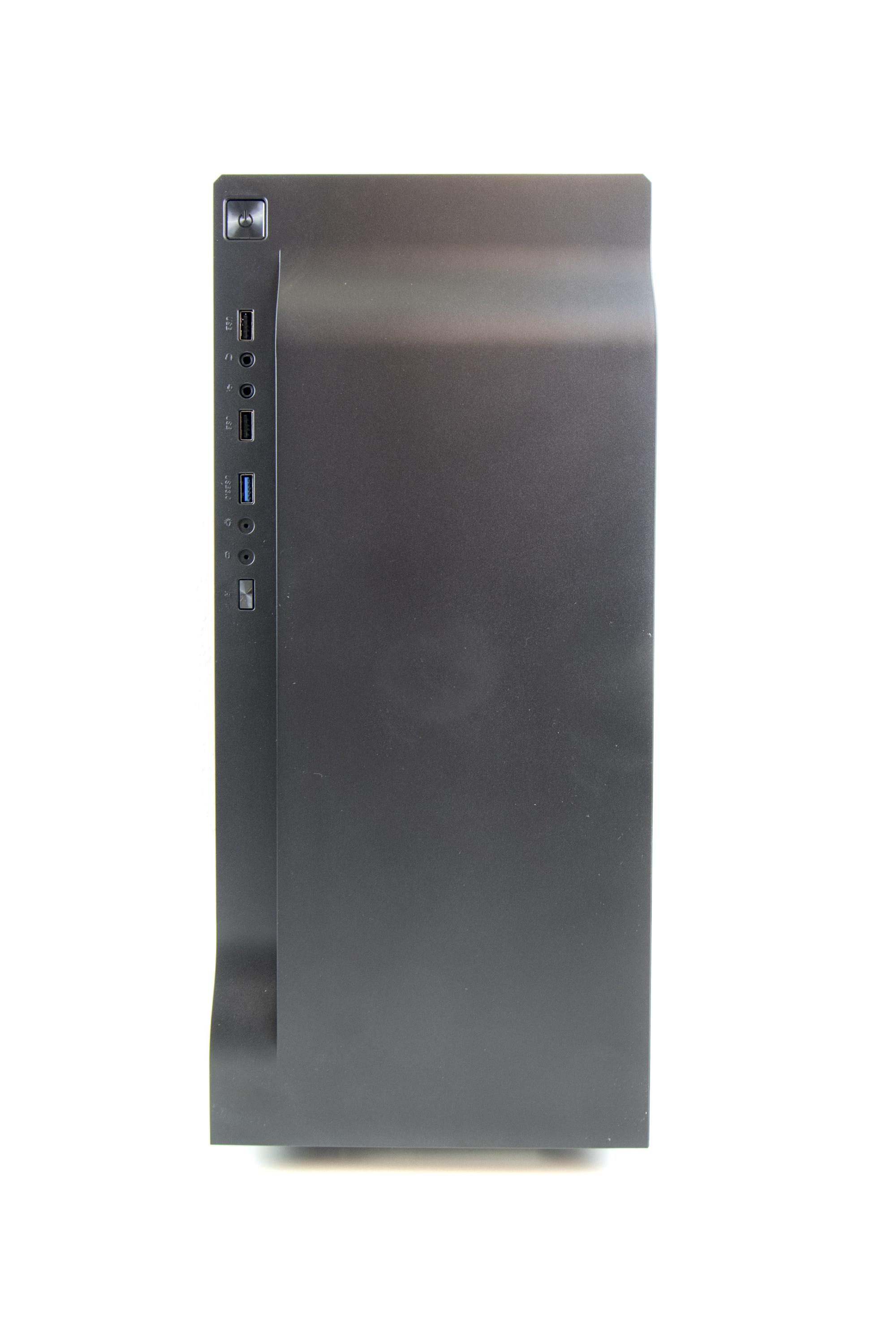 Die Front ist aus Kunststoff, wie bei den meisten Gehäusen üblich – vor allem in dem Preissegment. Sie hat eine leichte Wellenform und hat den RGB-LED-Streifen integriert. Links davon befindet sich das I/O-Panel, das mit 2x USB 2.0, 1x USB 3.0, getrennten Audioanschlüssen (Ein- & Ausgang), Reset- & Power-Button sowie zwei Status-LEDs gut ausgestattet ist. Toll wäre es allerdings, wenn es zwei USB-3.0-Anschlüsse wären. USB-C kann man in der Preisklasse natürlich nicht erwarten.
