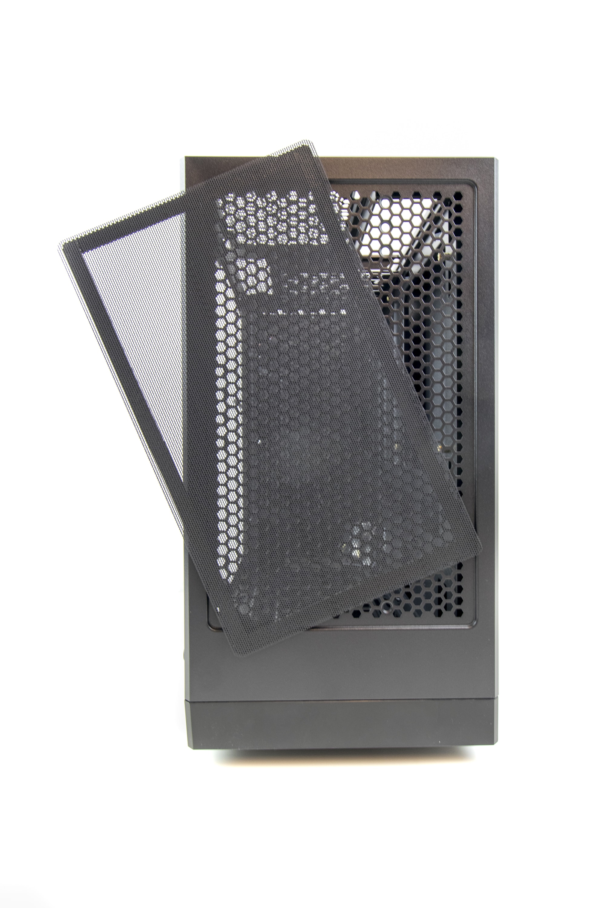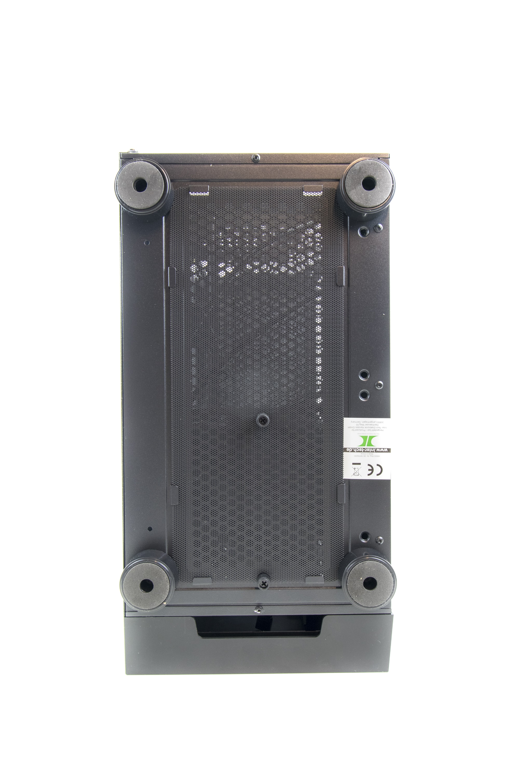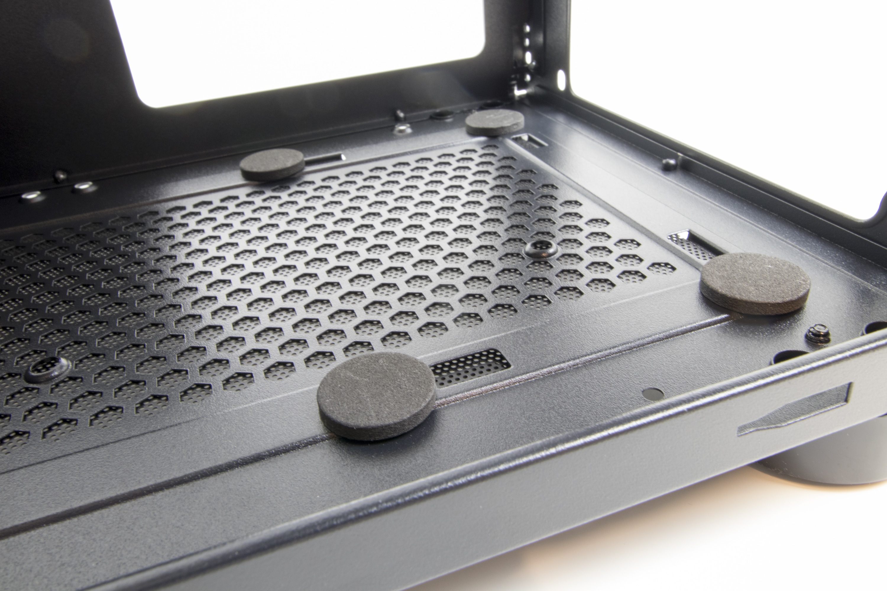 Besser sieht es auf der Ober- und Unterseite aus. Hier sind großflächige Mesh-Öffnungen zu finden, die auch noch mit Staubfiltern geschützt sind. An der Oberseite ist dieser magnetisch und somit besonders einfach zu entfernen. Anders sieht es an der Unterseite aus, hier wird der Staubfilter von Haltenasen gehalten und zusätzlich mit den Schrauben des Festplattenkäfigs festgeschraubt. Dieser muss also immer abgeschraubt werden, wenn man den Staubfilter an der Unterseite abnehmen möchte. Die vier Plastikfüße auf denen das Gehäuse steht sind mit Gummistreifen entkoppelt, um keine Schwingungen auf den Boden oder Schreibtisch zu übertragen und gleichzeitig rutschfest zu sein.