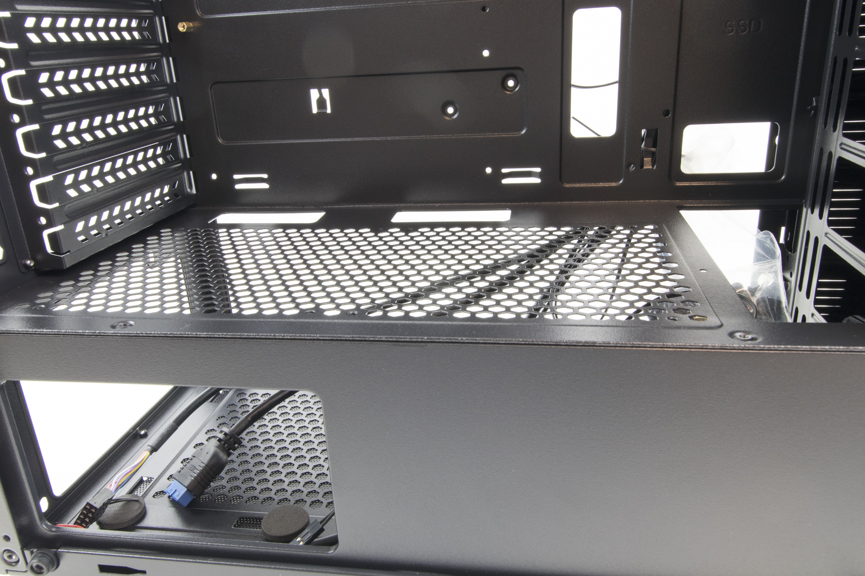Im Inneren findet sich das heutzutage typische Zwei-Kammer-Design. So werden Netzteil und Festplattenkäfig von der restlichen Hardware durch eine Abdeckung getrennt. Praktischerweise ist die Netzteilabdeckung direkt an der Front mit einer großen Öffnung versehen damit auch lange Radiatoren in der Front montiert werden können. Neben zwei großen Kabelöffnungen ist sie außerdem mit zahlreichen Öffnungen zur besseren Belüftung versehen. Durch die Seite lässt sich des Weiteren ein Blick aufs Netzteil erhaschen.